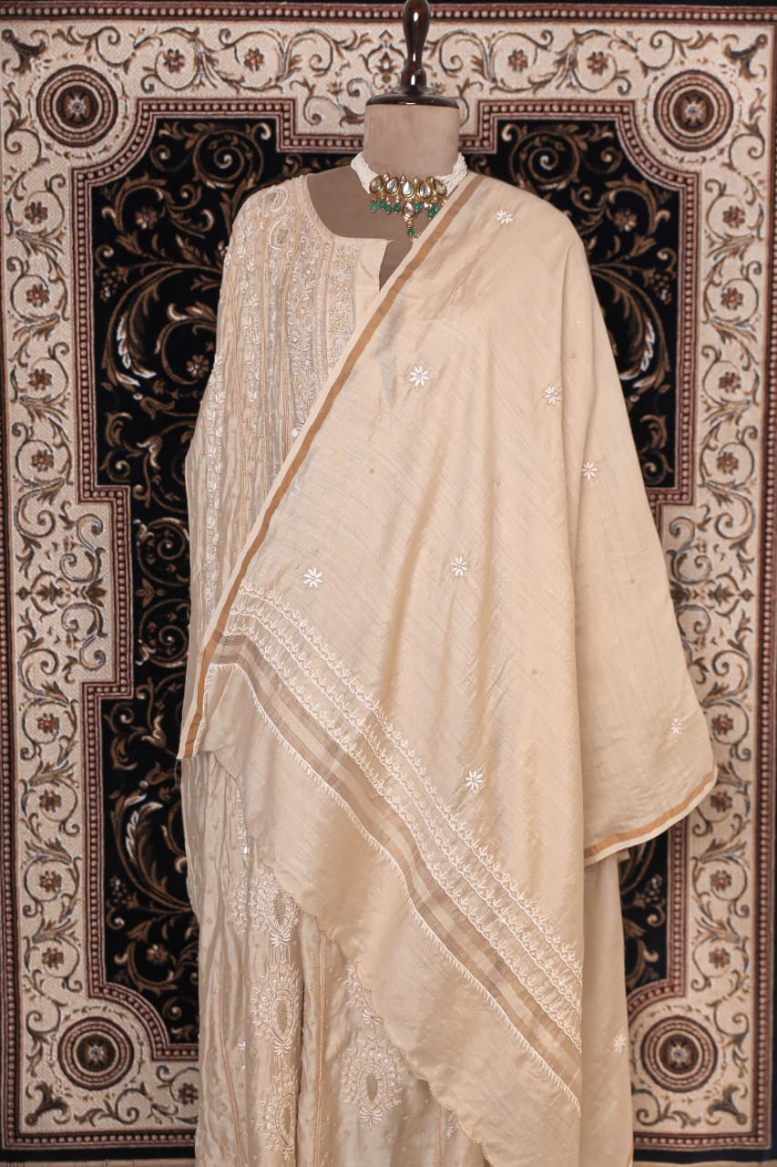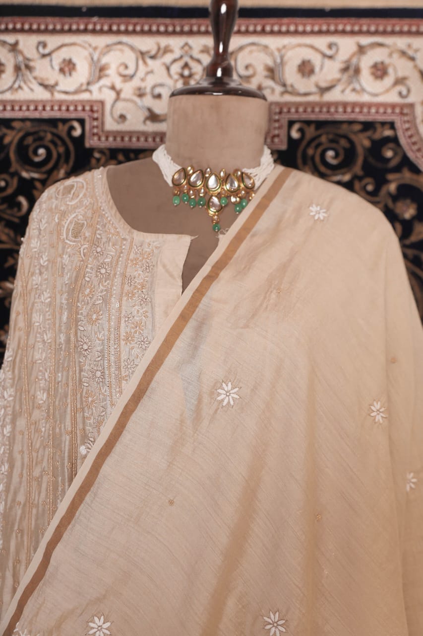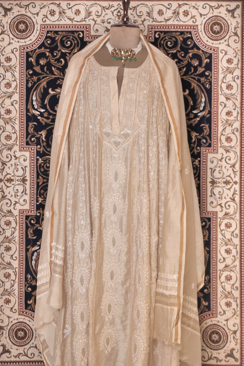 Fabric Kurta – Moonga Silk Dupatta – Moonga Silk Length Kurta – 3.25 metres Dupatta – 2.5 metres Embellishments : Pearl Work & sequence work Thread : Type – Cotton Washing Instructions : Dry Clean Only Trivia : Chikankari is an Art of delicate handwork of Lucknow. It is a handcrafted process where the wooden blocks are manually carved in various designs, and the natural stew for printing is prepared, and printed on the cloth. The chikankari craftsmen then use ten ary of the needlecraft embroidery, and perform the needlework artistically. There are 32 stitches of chikankari broadly classified into Raised stitch, Embossed and Flat stitch. Disclaimer : There might be a 10-15% difference in colour due to high screen resolution. Therefore, exchanges due to colour difference is not acceptable. Time Period Of Handmade- It took 5 to 8 months for the product to be handcrafted from designing to finishing. Disclaimer : There might be a 10-15% difference in colour due to high screen resolution. Therefore, exchanges due to colour difference is not acceptable Misspelled : Nurkari, Noorkaree, Nurkaari, Noorkary, Noor-Kari