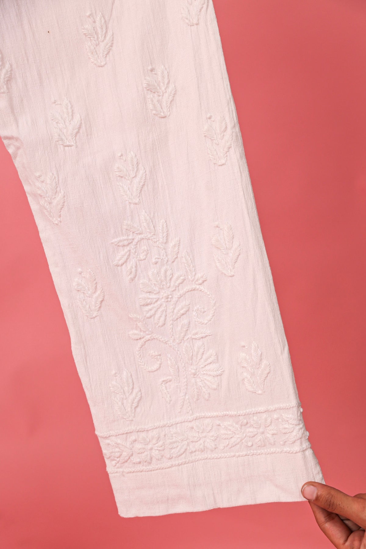 Chikankari is an Art of delicate handwork of Lucknow. It is a handcrafted process where the wooden blocks are manually carved in various designs, and the natural stew for printing is prepared, and printed on the cloth. The chikankari craftsmen then use ten ary of the needlecraft embroidery, and perform the needlework artistically. There are 32 stitches of chikankari broadly classified into Raised stitch, Embossed and Flat stitch.
