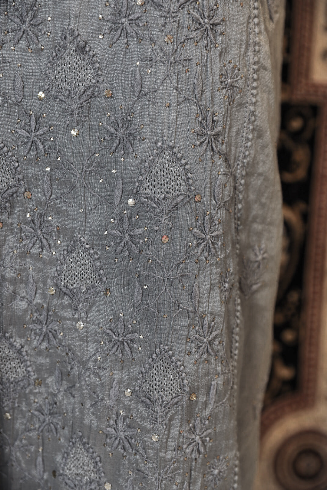 Chikankari is an Art of delicate handwork of Lucknow. It is a handcrafted process where the wooden blocks are manually carved in various designs, and the natural stew for printing is prepared, and printed on the cloth. The chikankari craftsmen then use ten ary of the needlecraft embroidery, and perform the needlework artistically. There are 32 stitches of chikankari broadly classified into Raised stitch, Embossed and Flat stitch.