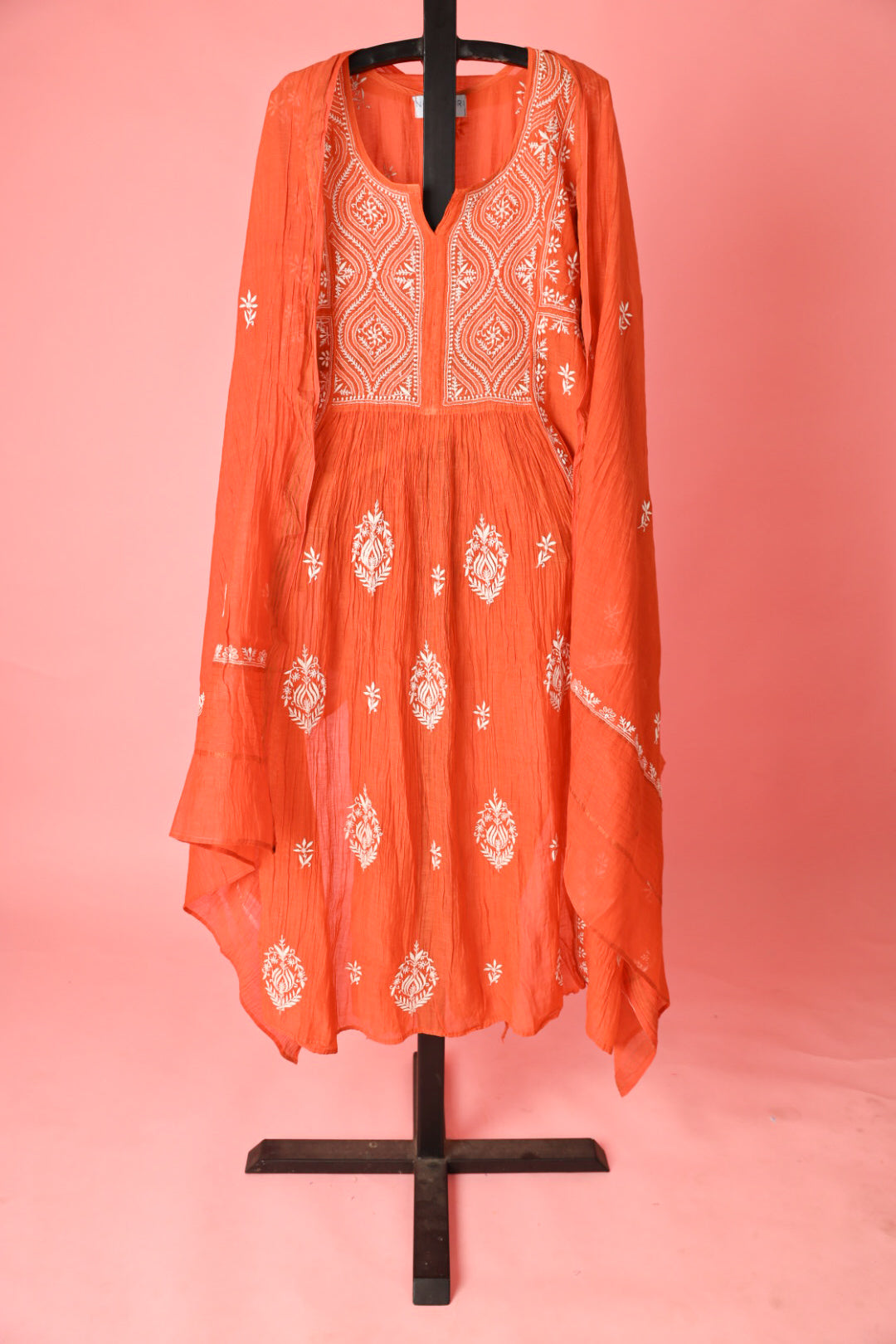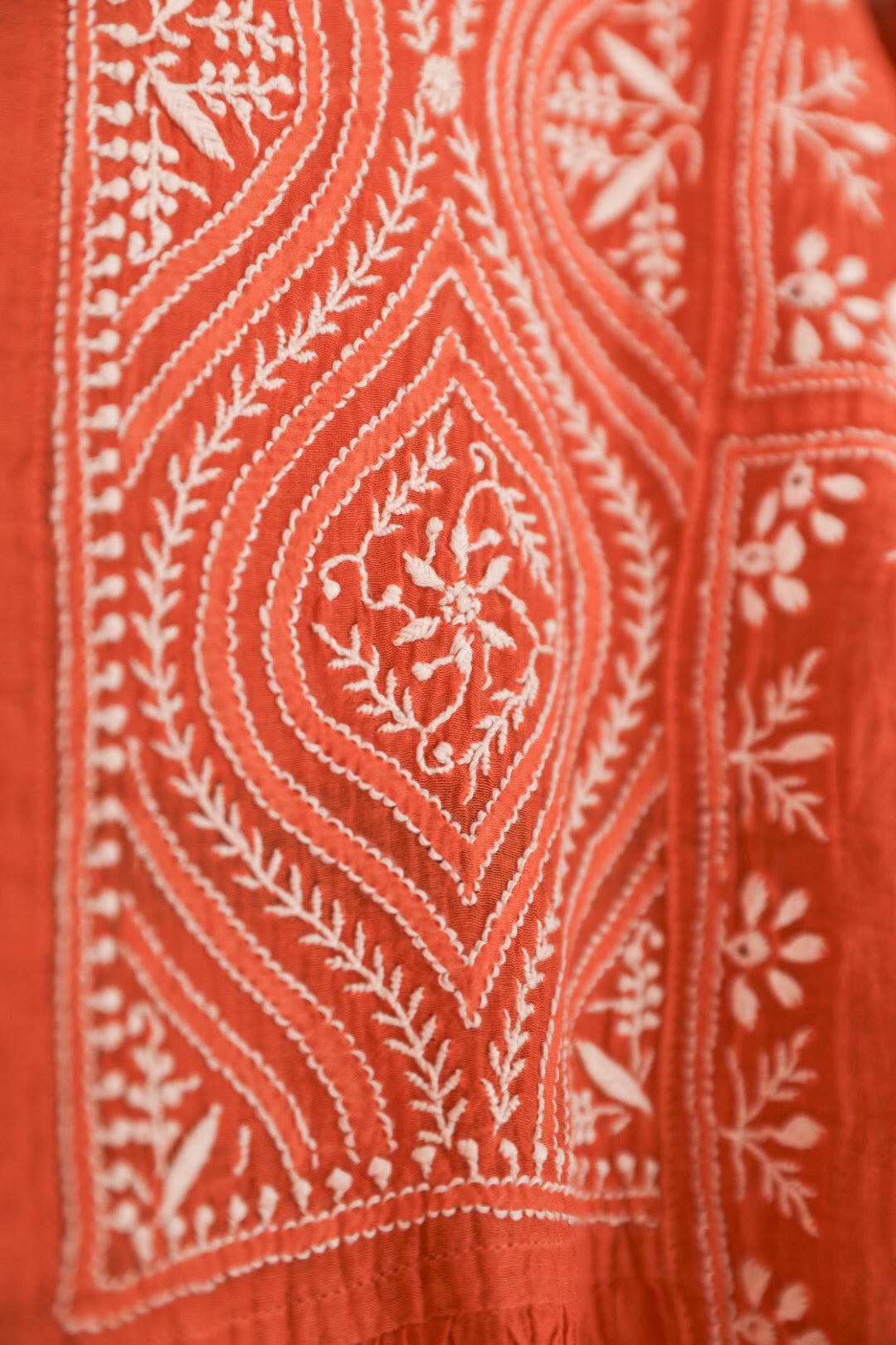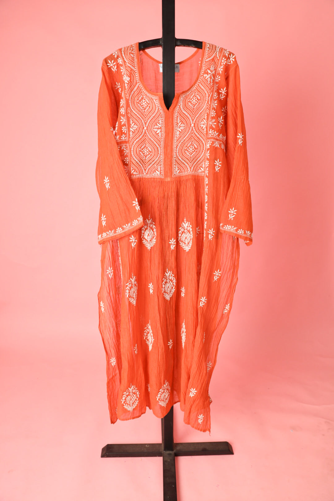 Chikankari is an Art of delicate handwork of Lucknow. It is a handcrafted process where the wooden blocks are manually carved in various designs, and the natural stew for printing is prepared, and printed on the cloth. The chikankari craftsmen then use ten ary of the needlecraft embroidery, and perform the needlework artistically. There are 32 stitches of chikankari broadly classified into Raised stitch, Embossed and Flat stitch.