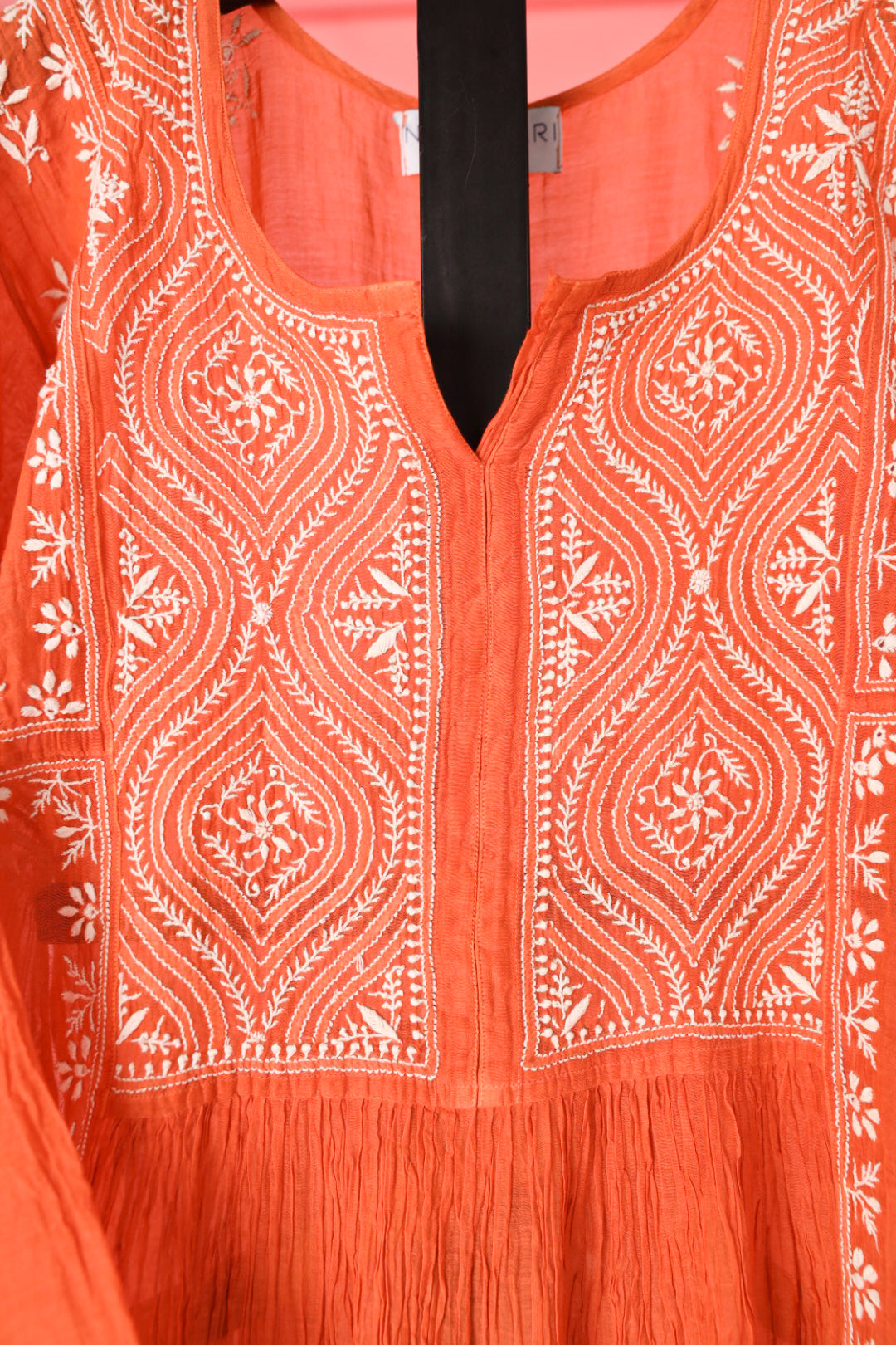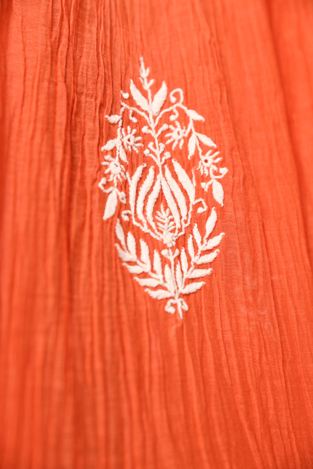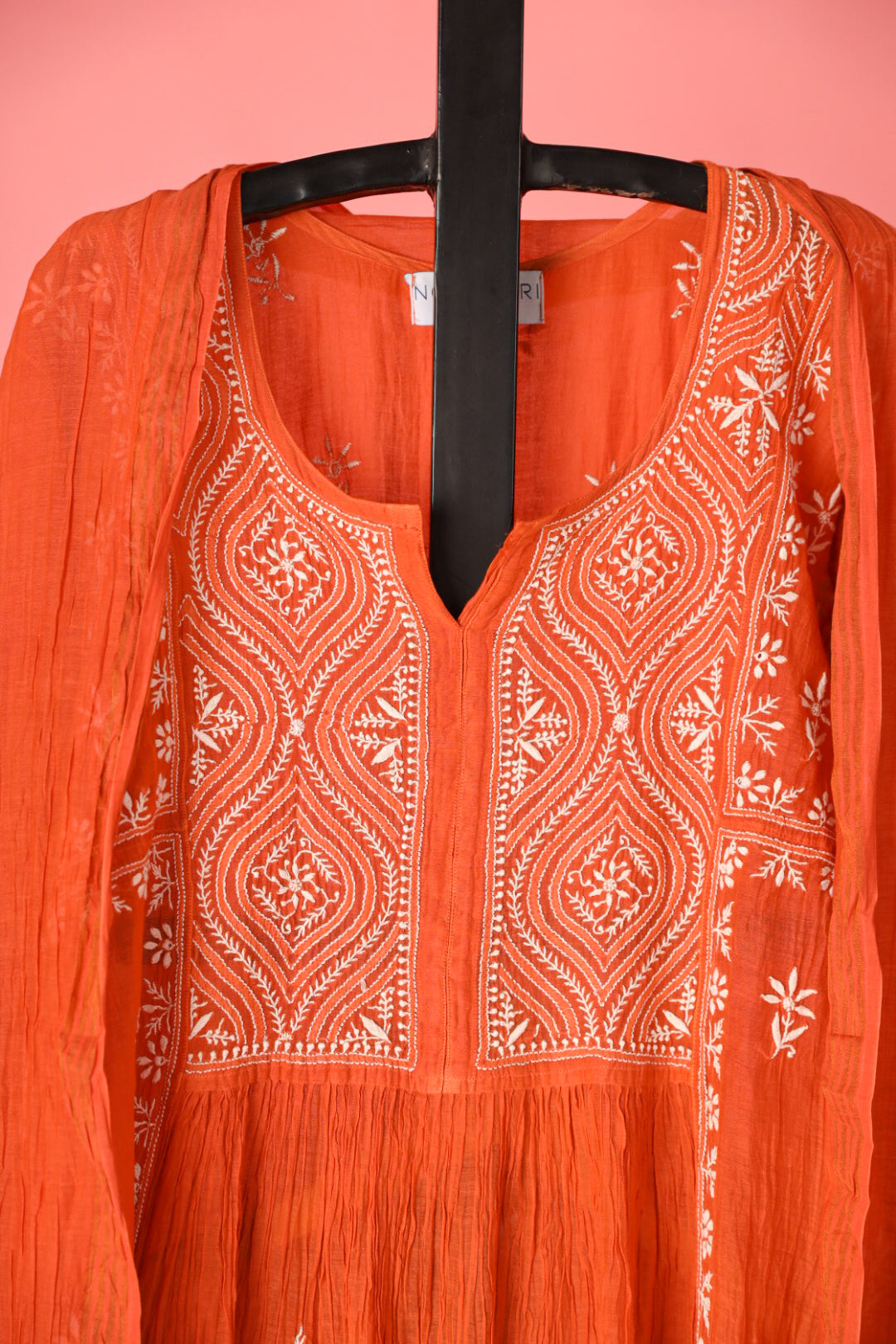 Chikankari is an Art of delicate handwork of Lucknow. It is a handcrafted process where the wooden blocks are manually carved in various designs, and the natural stew for printing is prepared, and printed on the cloth. The chikankari craftsmen then use ten ary of the needlecraft embroidery, and perform the needlework artistically. There are 32 stitches of chikankari broadly classified into Raised stitch, Embossed and Flat stitch.