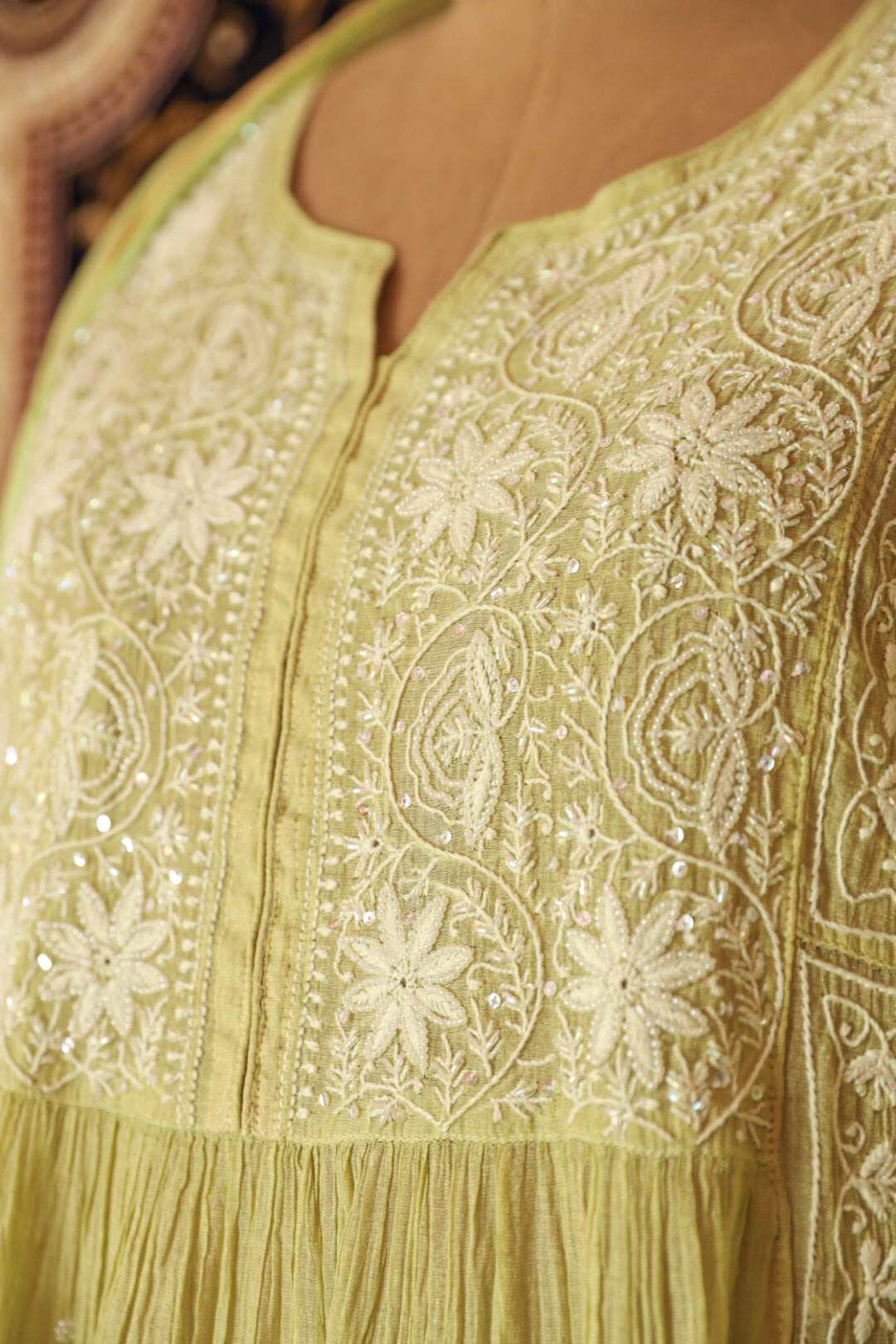 Chikankari is an Art of delicate handwork of Lucknow. It is a handcrafted process where the wooden blocks are manually carved in various designs, and the natural stew for printing is prepared, and printed on the cloth. The chikankari craftsmen then use ten ary of the needlecraft embroidery, and perform the needlework artistically. There are 32 stitches of chikankari broadly classified into Raised stitch, Embossed and Flat stitch.