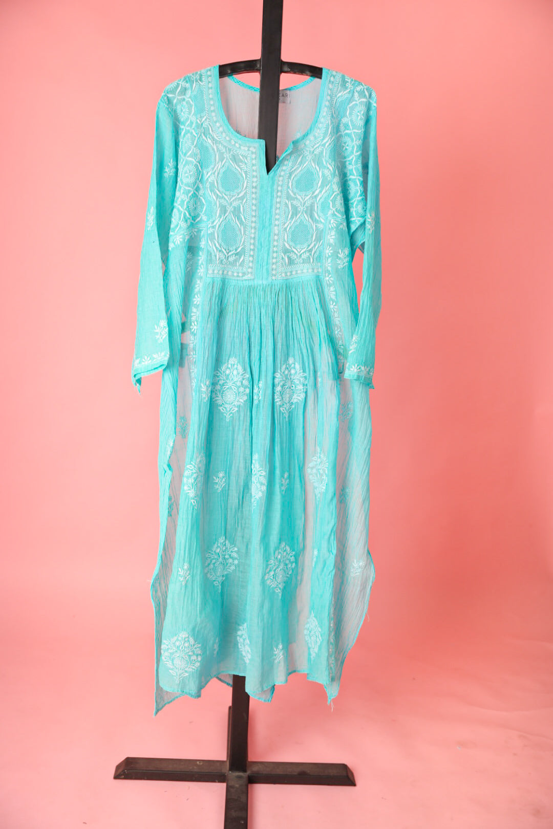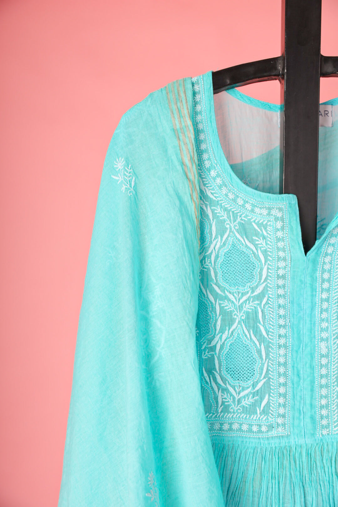 Chikankari is an Art of delicate handwork of Lucknow. It is a handcrafted process where the wooden blocks are manually carved in various designs, and the natural stew for printing is prepared, and printed on the cloth. The chikankari craftsmen then use ten ary of the needlecraft embroidery, and perform the needlework artistically. There are 32 stitches of chikankari broadly classified into Raised stitch, Embossed and Flat stitch.