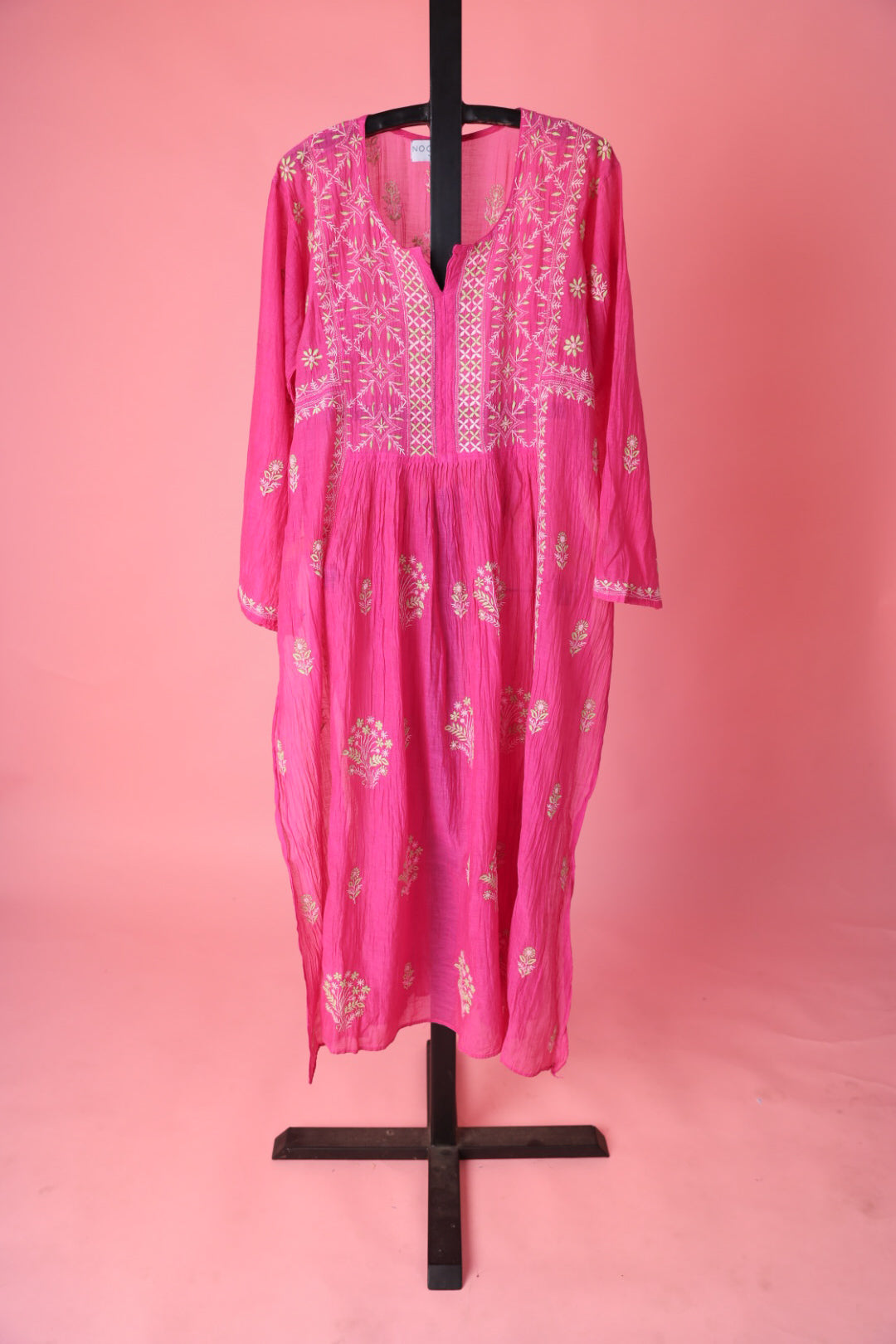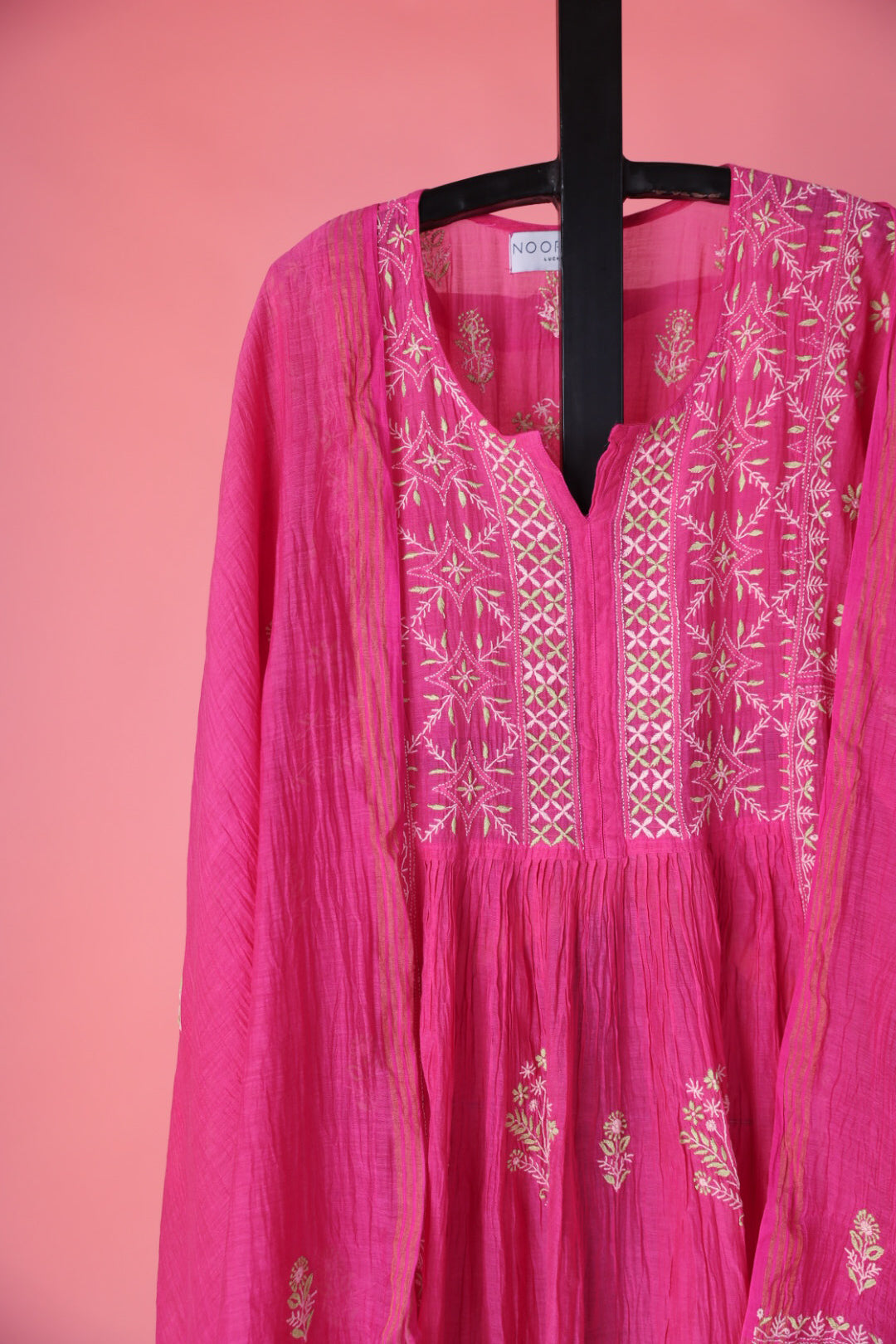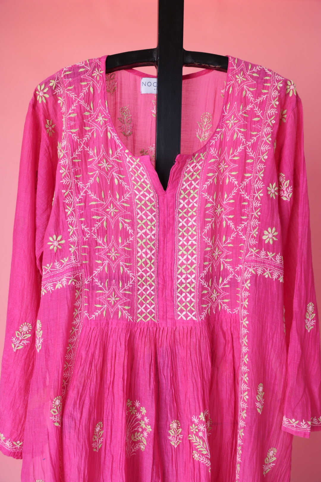 Chikankari is an Art of delicate handwork of Lucknow. It is a handcrafted process where the wooden blocks are manually carved in various designs, and the natural stew for printing is prepared, and printed on the cloth. The chikankari craftsmen then use ten ary of the needlecraft embroidery, and perform the needlework artistically. There are 32 stitches of chikankari broadly classified into Raised stitch, Embossed and Flat stitch.