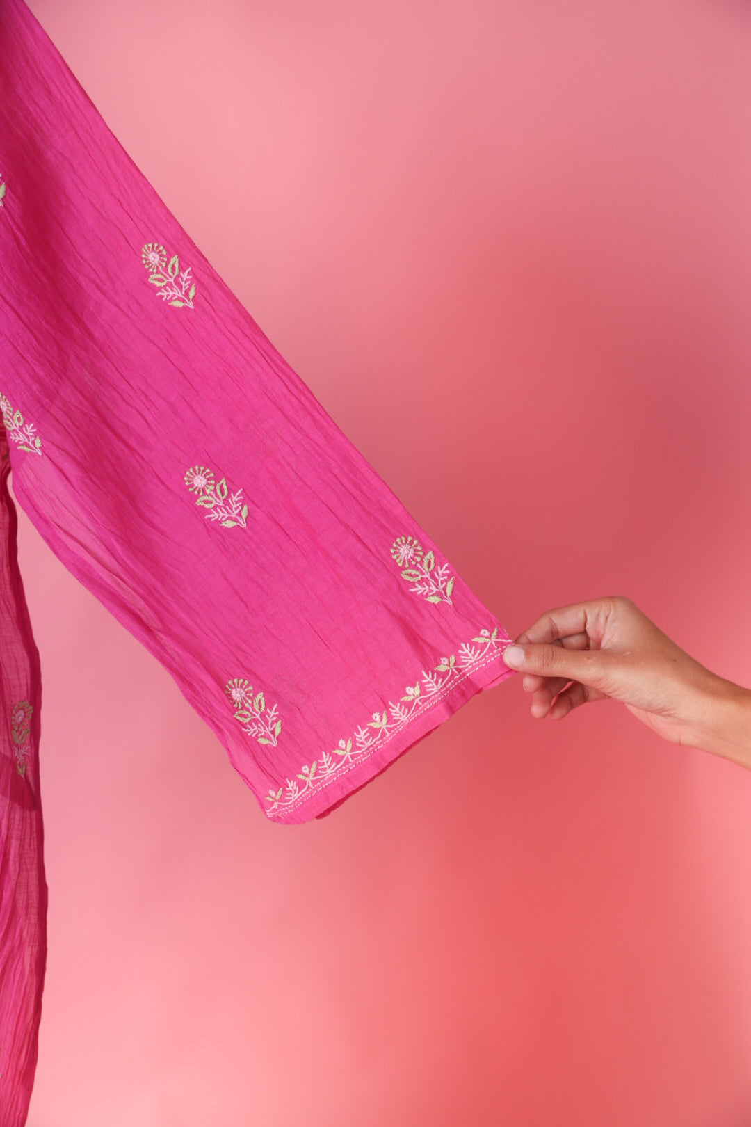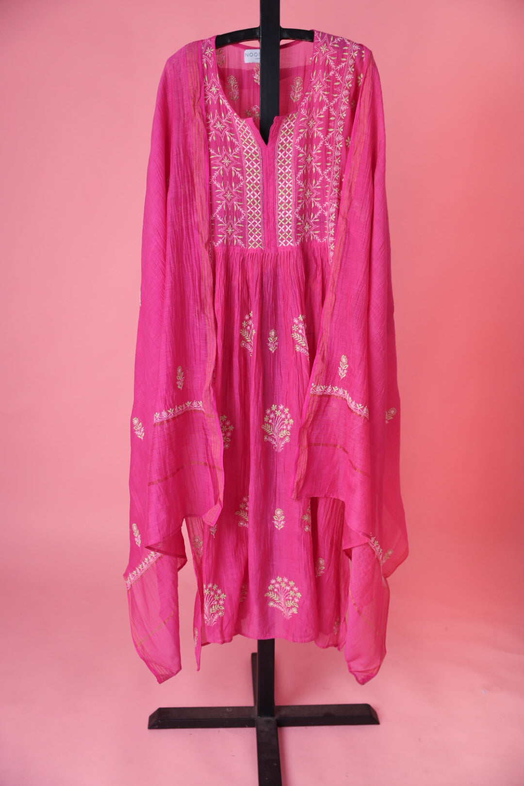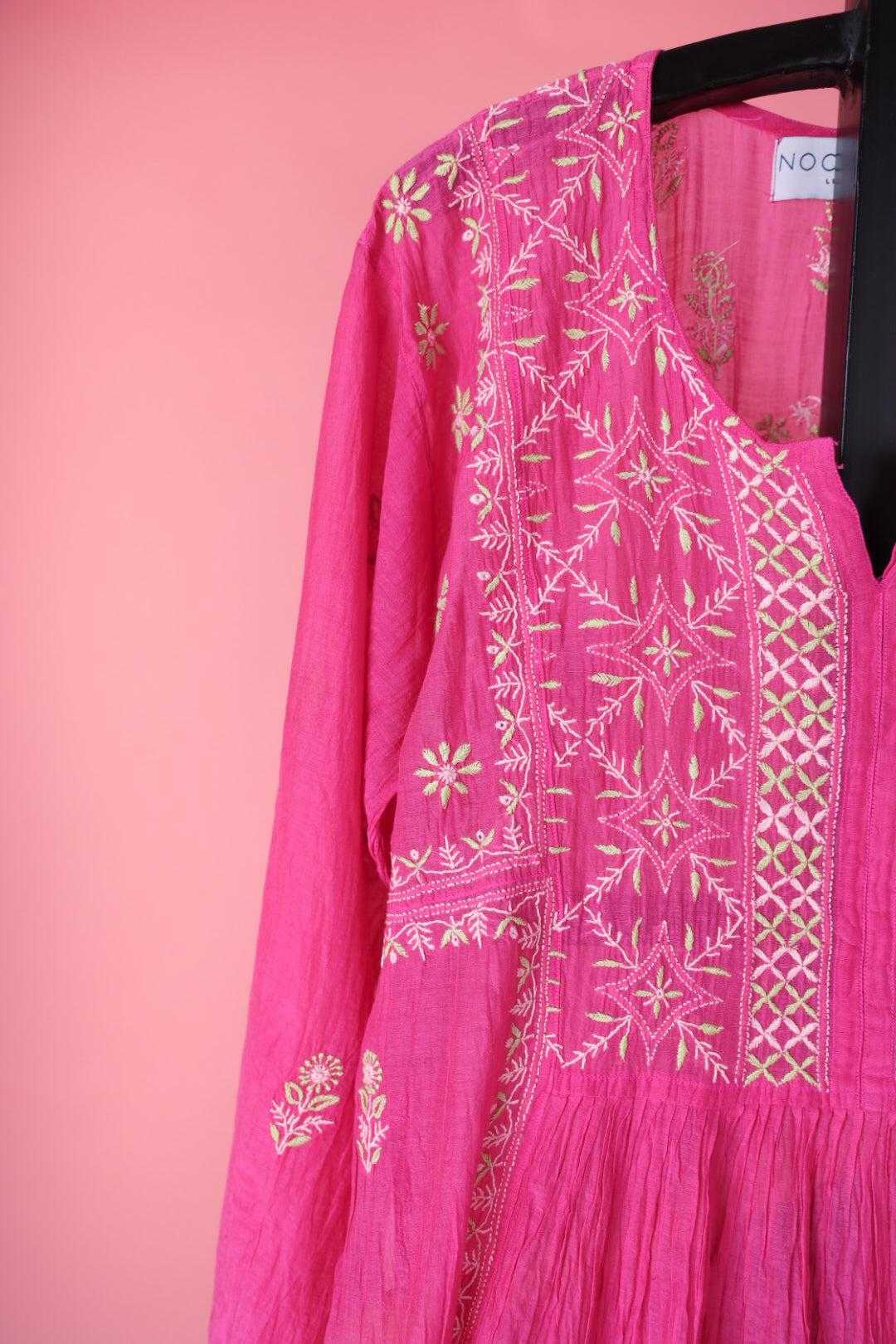 Chikankari is an Art of delicate handwork of Lucknow. It is a handcrafted process where the wooden blocks are manually carved in various designs, and the natural stew for printing is prepared, and printed on the cloth. The chikankari craftsmen then use ten ary of the needlecraft embroidery, and perform the needlework artistically. There are 32 stitches of chikankari broadly classified into Raised stitch, Embossed and Flat stitch.