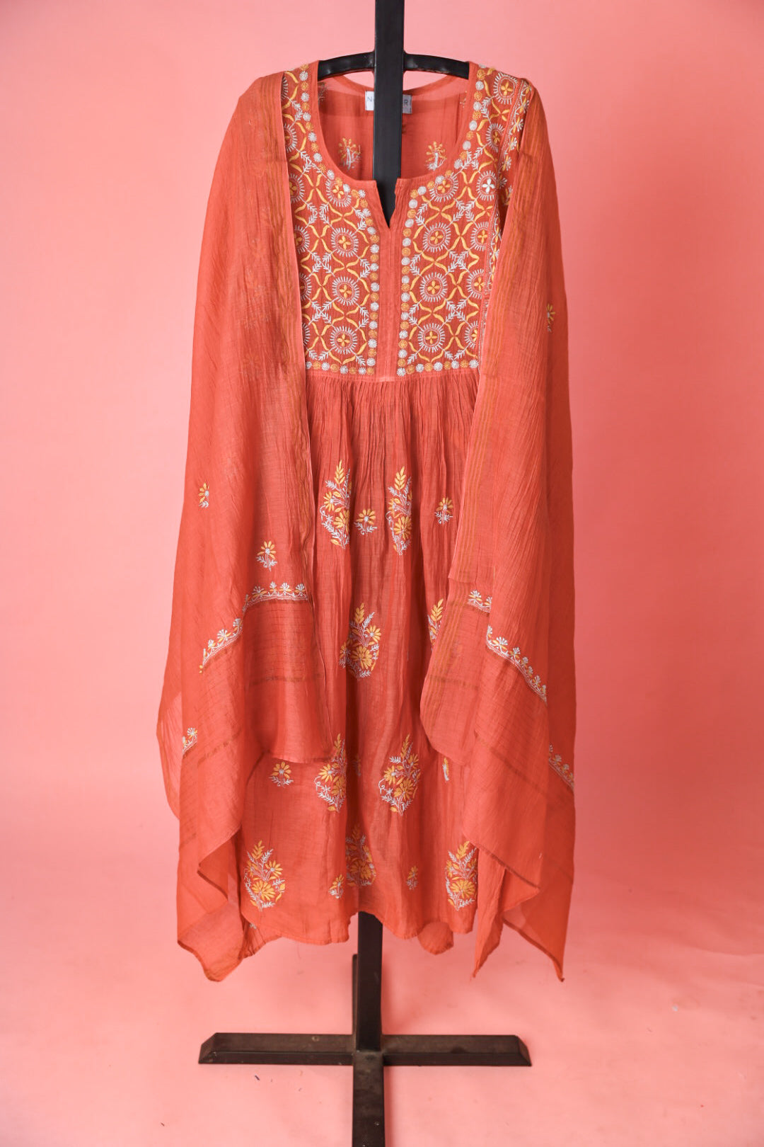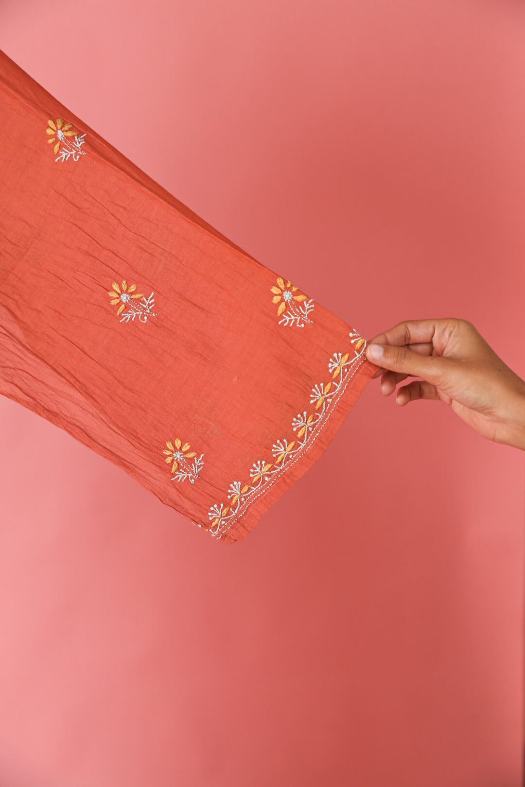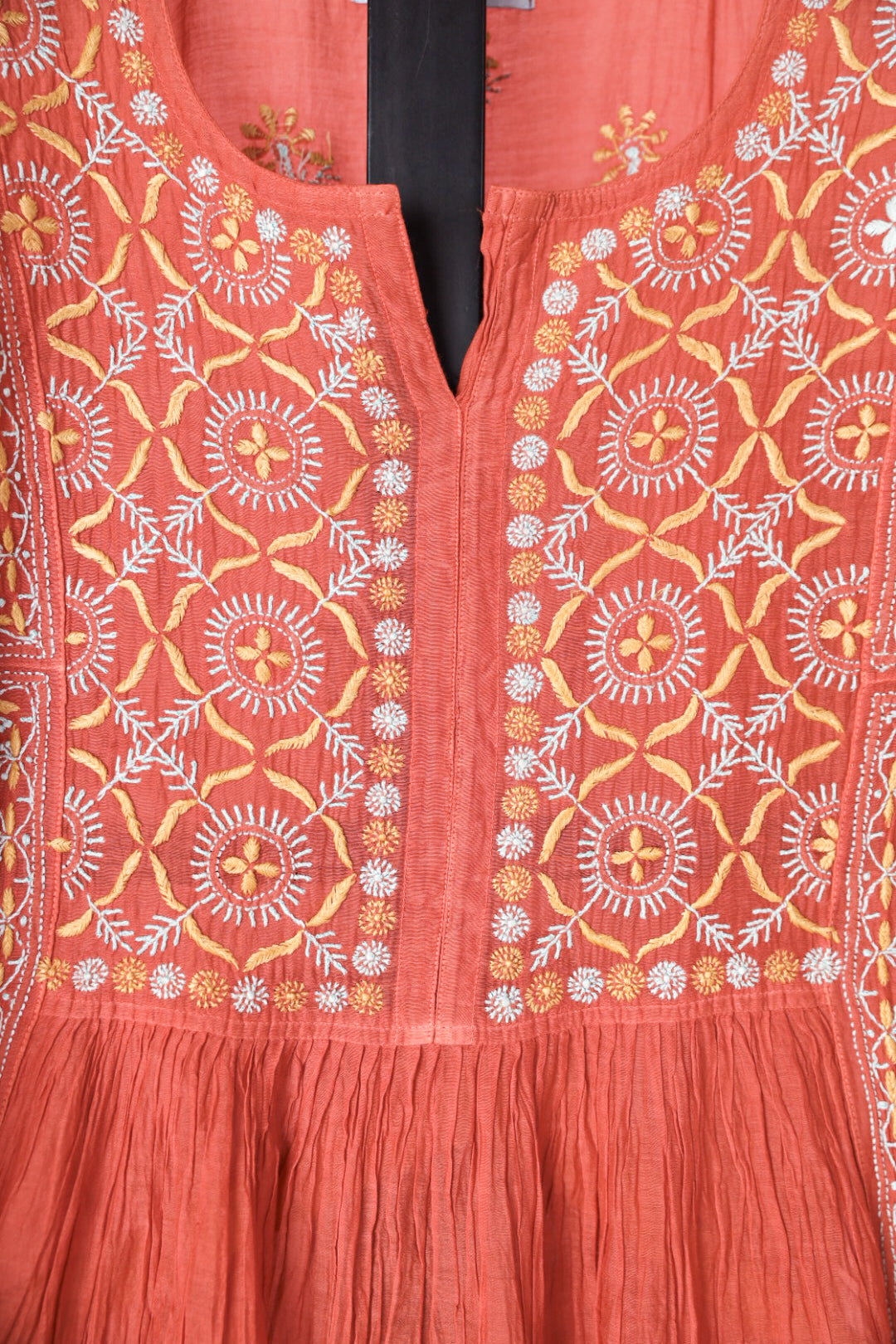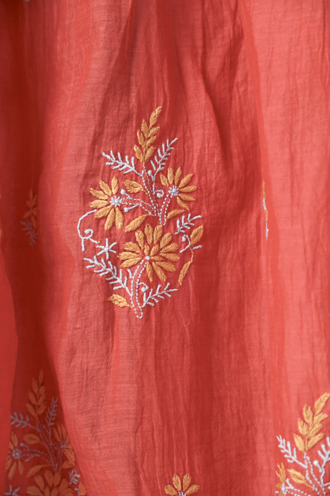 Chikankari is an Art of delicate handwork of Lucknow. It is a handcrafted process where the wooden blocks are manually carved in various designs, and the natural stew for printing is prepared, and printed on the cloth. The chikankari craftsmen then use ten ary of the needlecraft embroidery, and perform the needlework artistically. There are 32 stitches of chikankari broadly classified into Raised stitch, Embossed and Flat stitch.