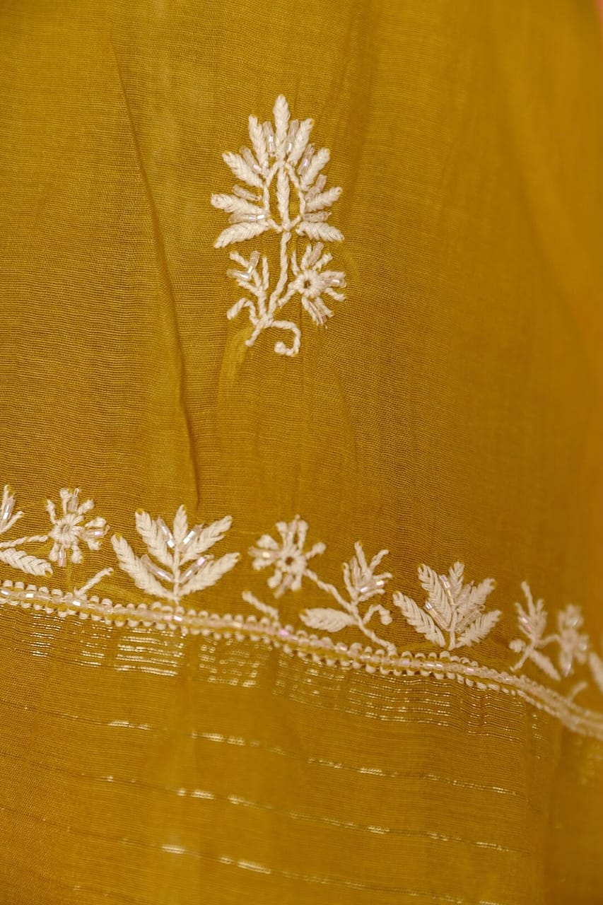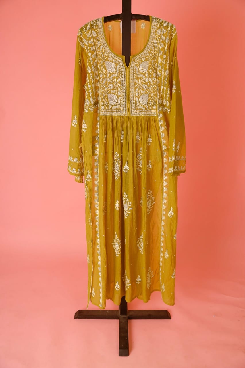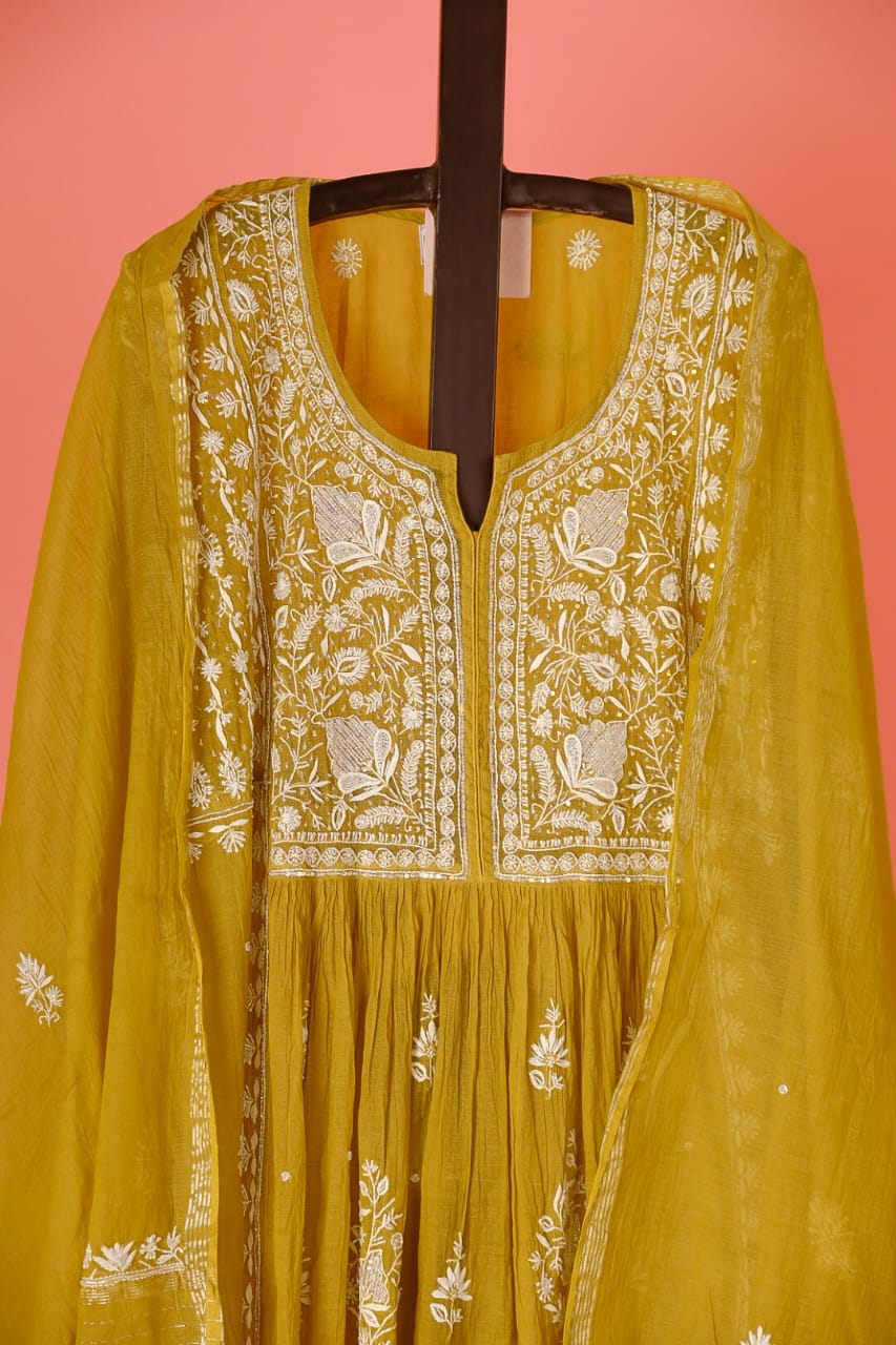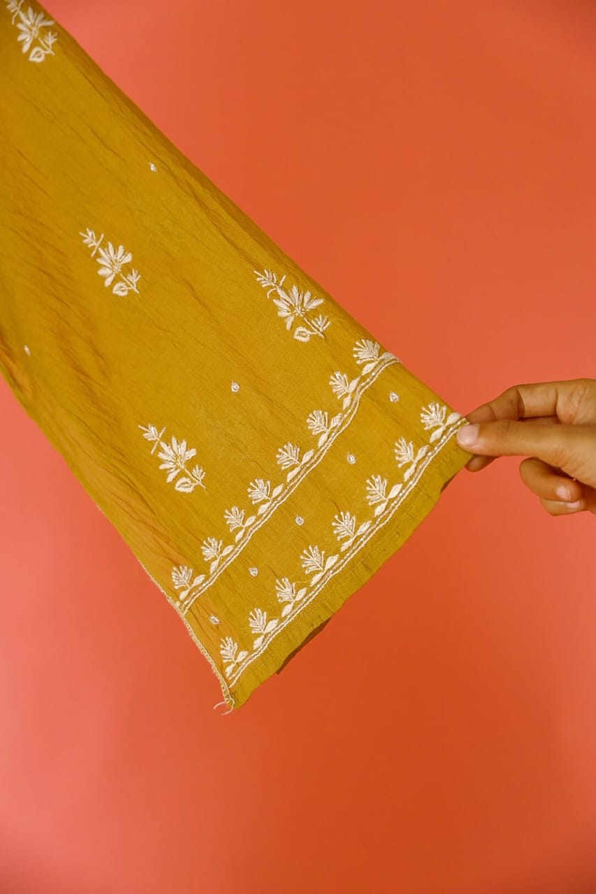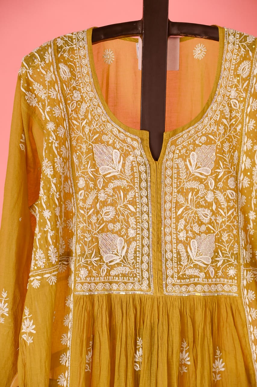 Chikankari is an Art of delicate handwork of Lucknow. It is a handcrafted process where the wooden blocks are manually carved in various designs, and the natural stew for printing is prepared, and printed on the cloth. The chikankari craftsmen then use ten ary of the needlecraft embroidery, and perform the needlework artistically. There are 32 stitches of chikankari broadly classified into Raised stitch, Embossed and Flat stitch.