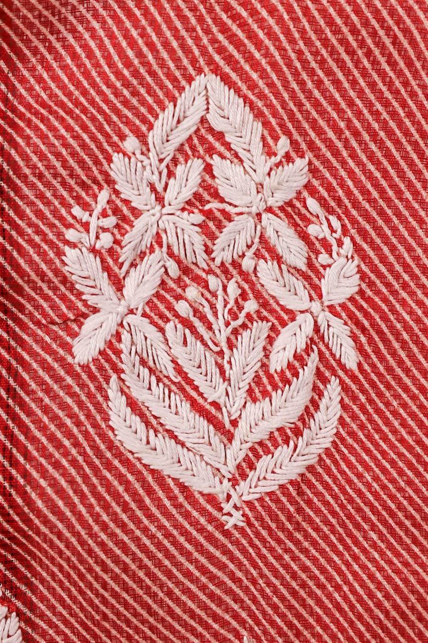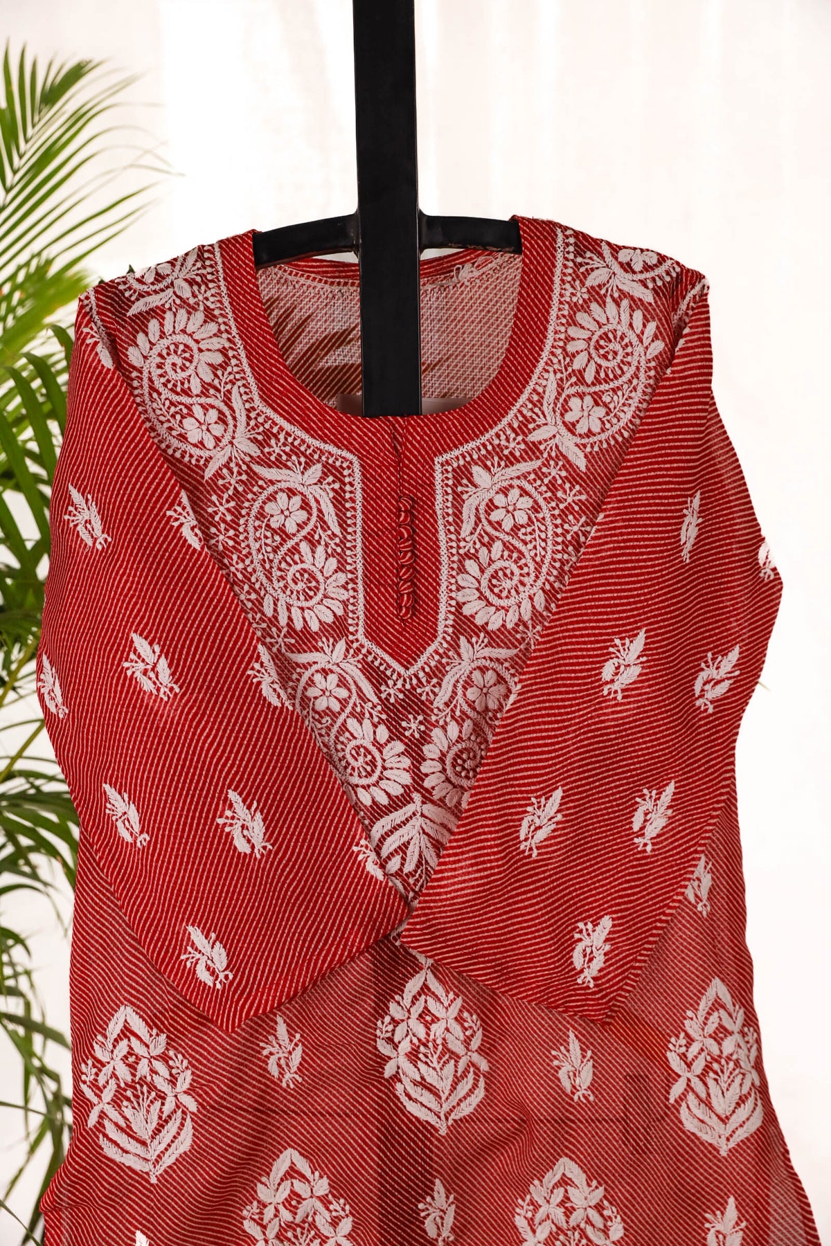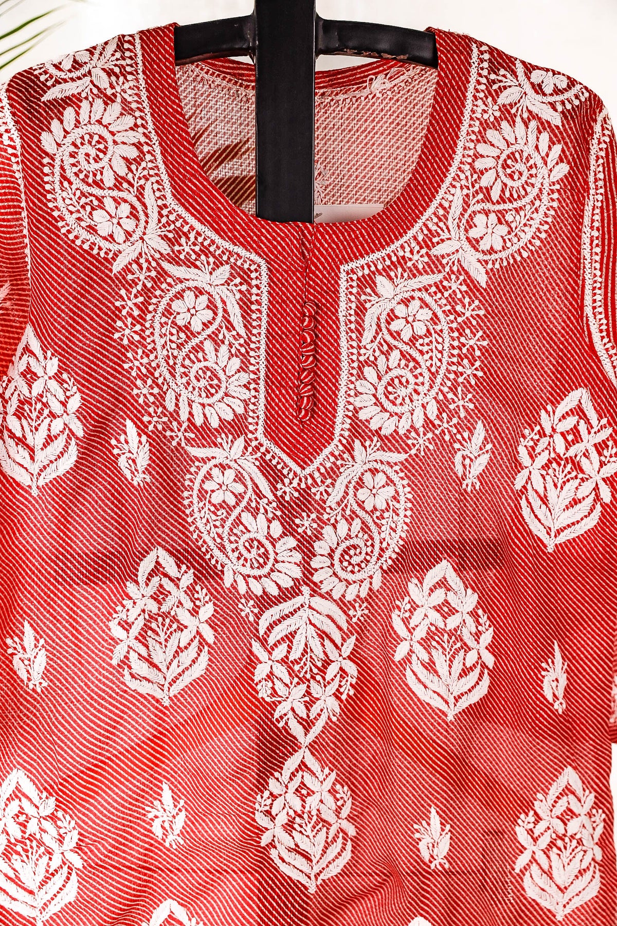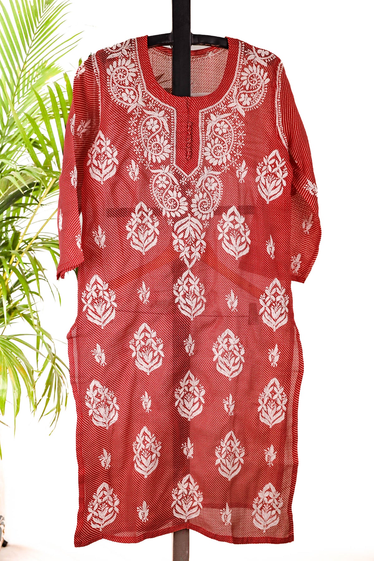 Fabric : Kota Leheriya Chest : 40 inches Length : 48 inches Embellishments -none Embroidery : 100% hand embroidered Neck : Round Neck Size. : XS ,S , M ,L,XL,XXL Washing Instructions : Dry Clean only Disclaimer : There might be a 10-15% difference in colour due to high screen resolution. slight variation in embroidery due to handcrafted nature