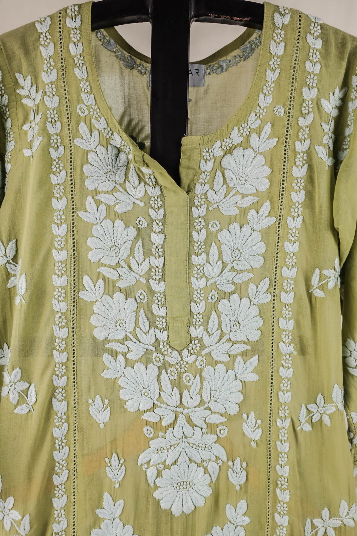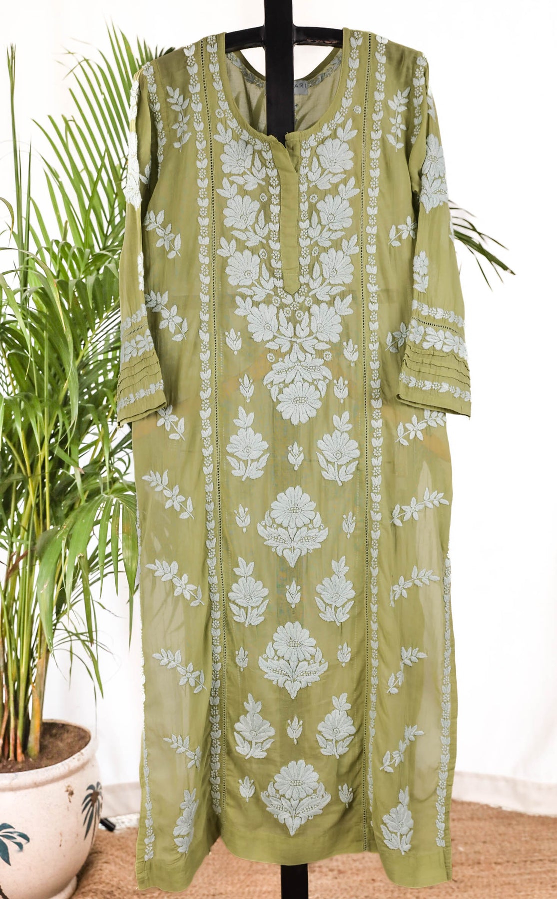 Fabric : Cotton Chest : 40 inches Length : 48 inches Embellishments -none Embroidery : 100% hand embroidered Neck : Round Neck Size. : XS ,S , M ,L,XL,XXL Washing Instructions : Dry Clean only Disclaimer : There might be a 10-15% difference in colour due to high screen resolution. slight variation in embroidery due to handcrafted nature