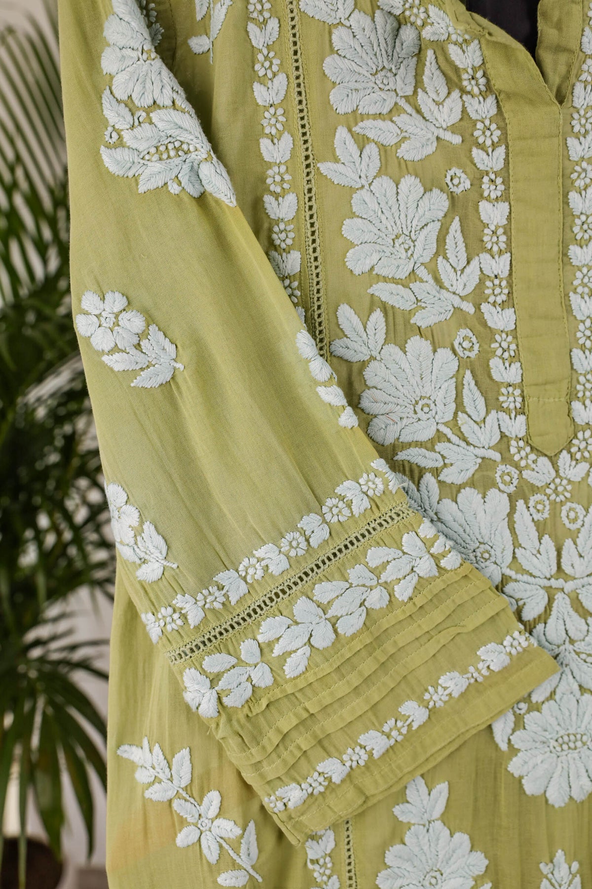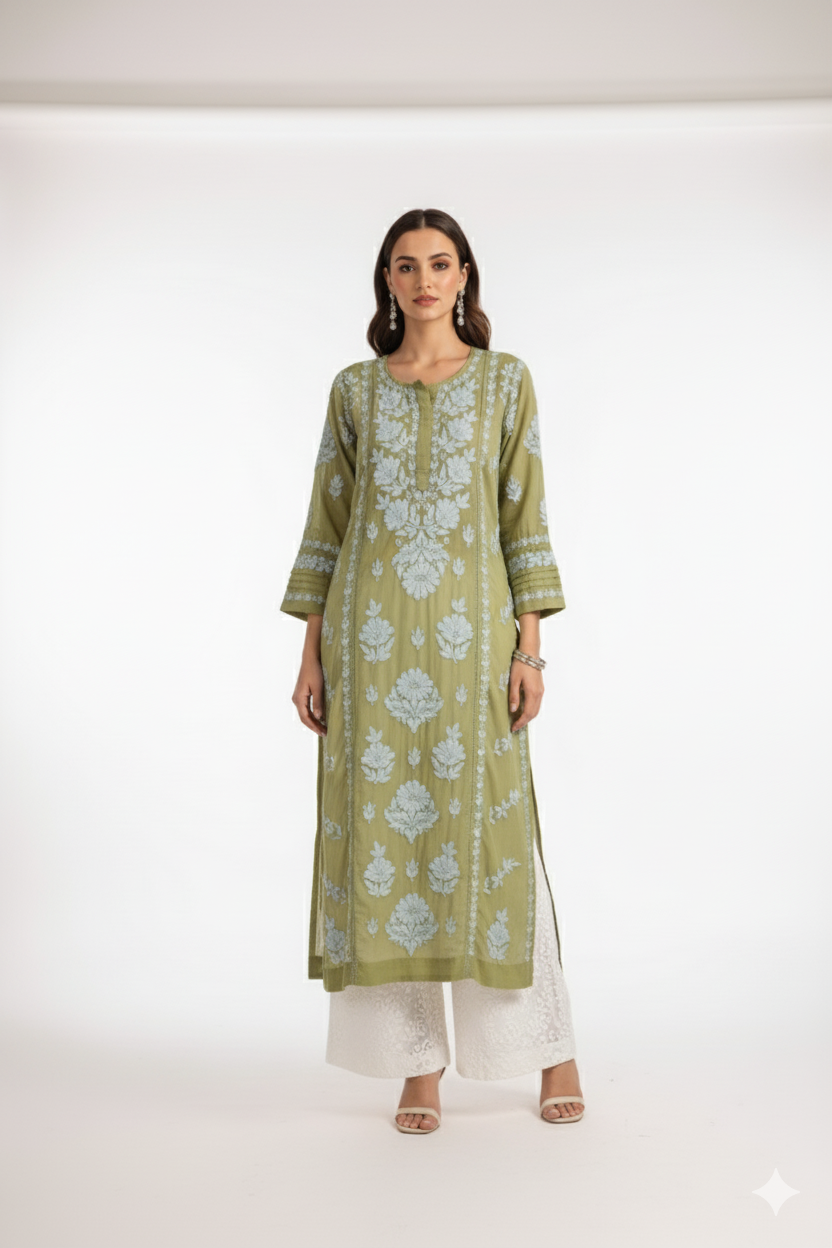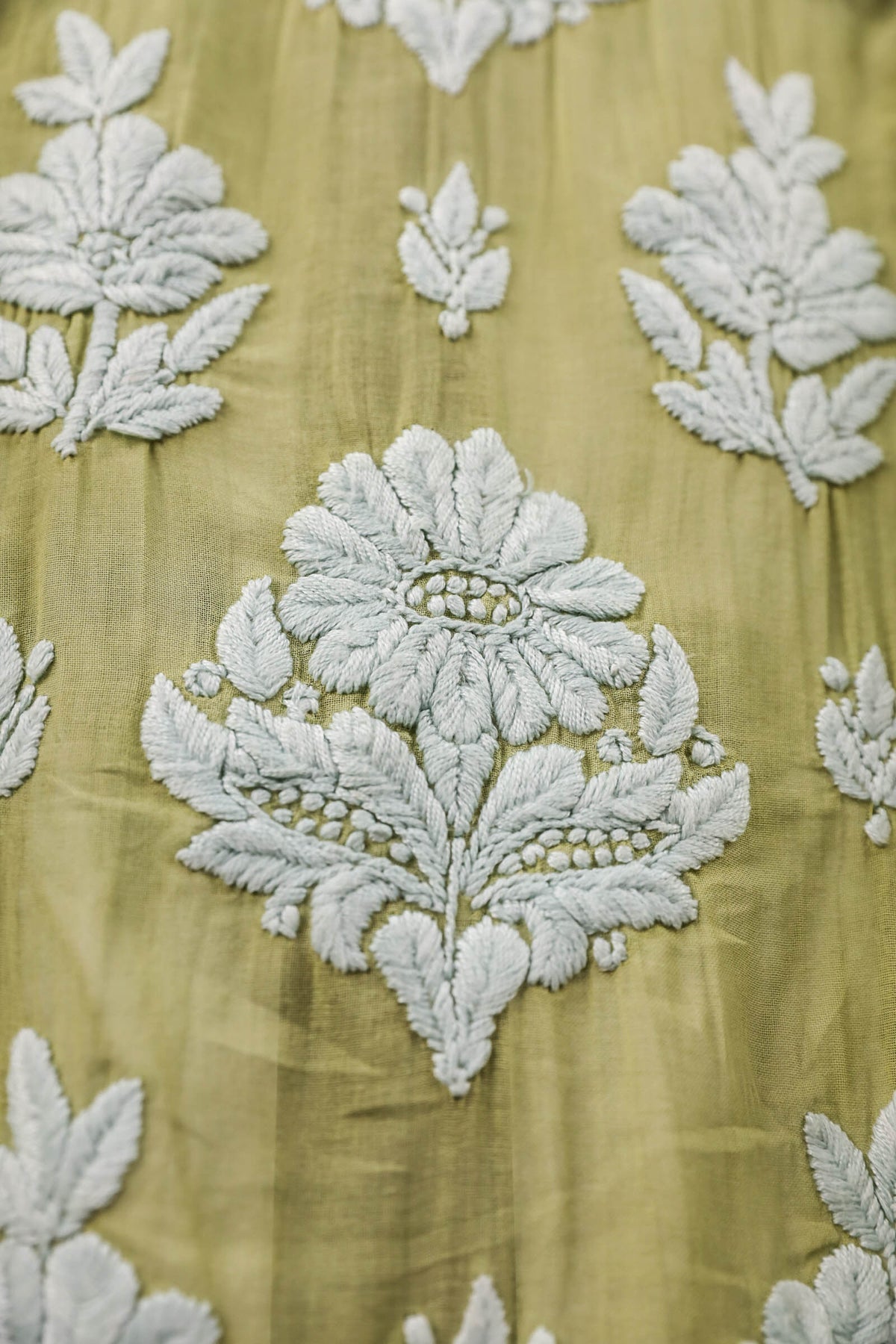 Chikankari is an Art of delicate handwork of Lucknow. It is a handcrafted process where the wooden blocks are manually carved in various designs, and the natural stew for printing is prepared, and printed on the cloth. The chikankari craftsmen then use ten ary of the needlecraft embroidery, and perform the needlework artistically. There are 32 stitches of chikankari broadly classified into Raised stitch, Embossed and Flat stitch.