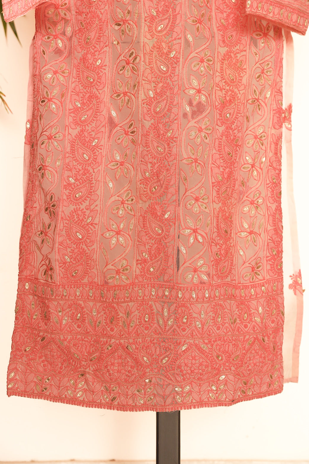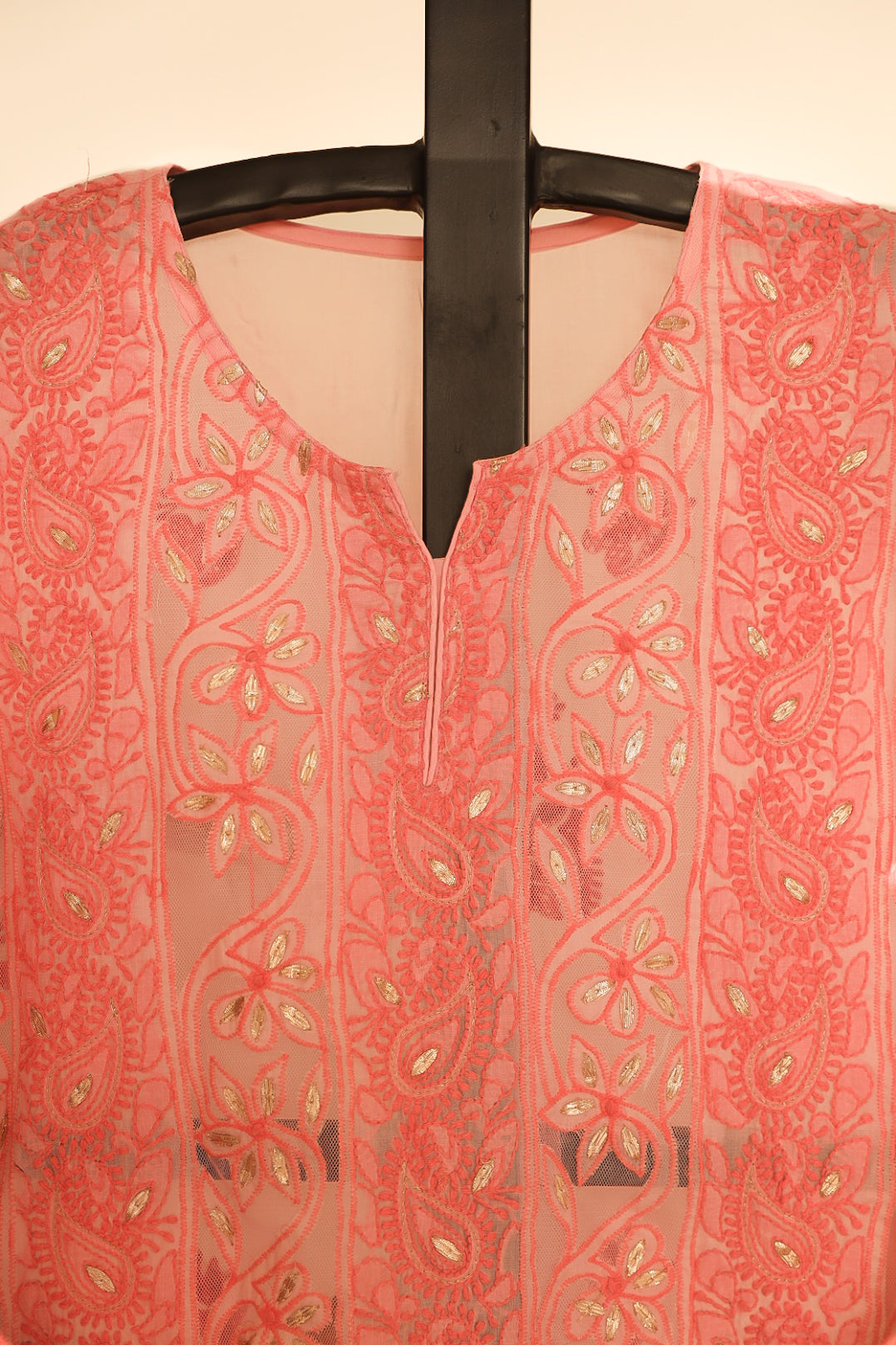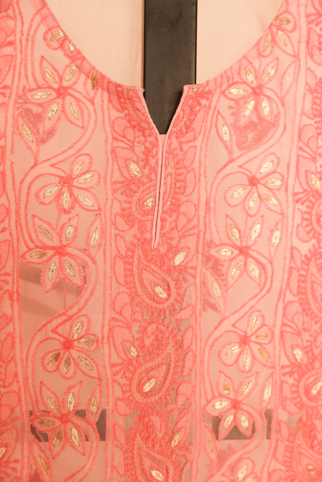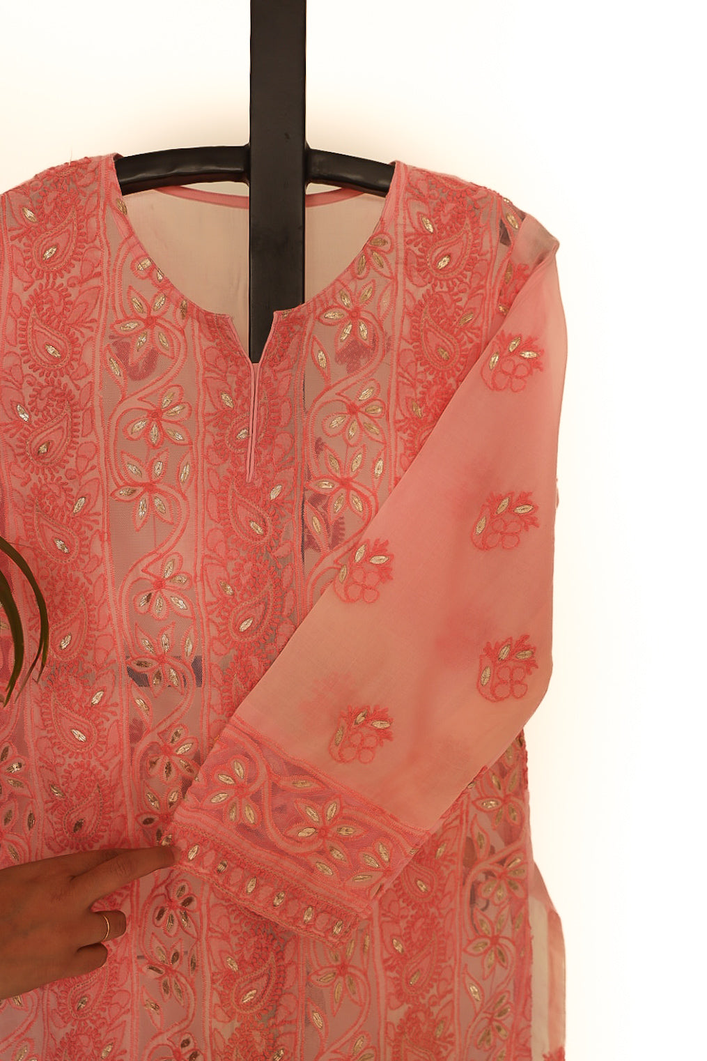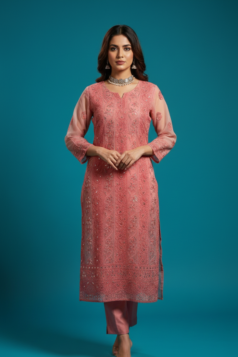 Chikankari is an Art of delicate handwork of Lucknow. It is a handcrafted process where the wooden blocks are manually carved in various designs, and the natural stew for printing is prepared, and printed on the cloth. The chikankari craftsmen then use ten ary of the needlecraft embroidery, and perform the needlework artistically. There are 32 stitches of chikankari broadly classified into Raised stitch, Embossed and Flat stitch.