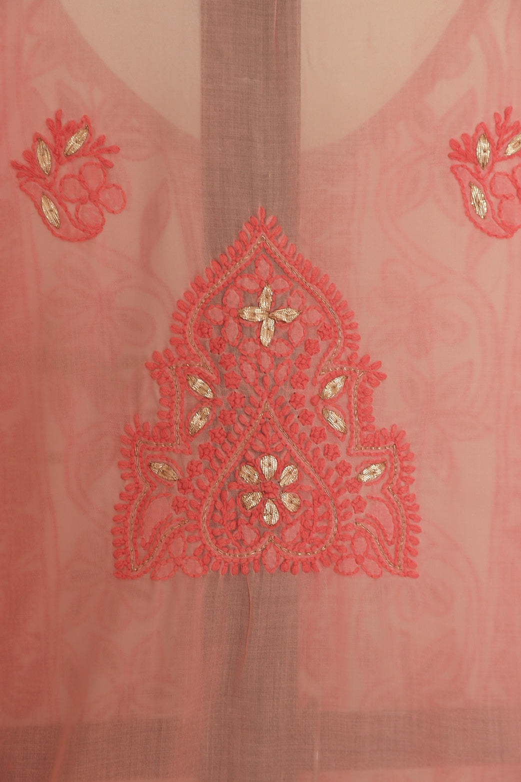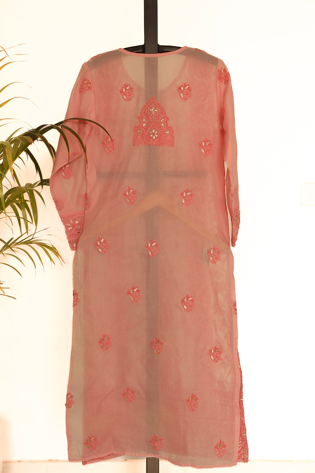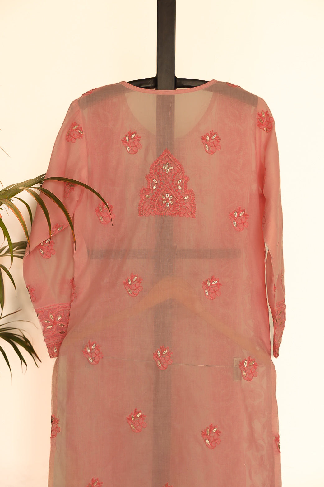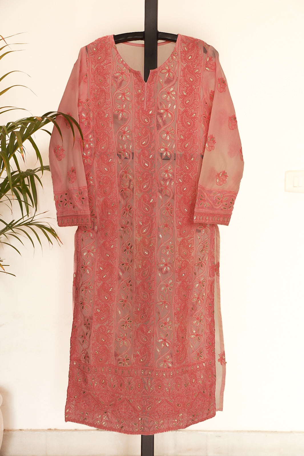 Chikankari is an Art of delicate handwork of Lucknow. It is a handcrafted process where the wooden blocks are manually carved in various designs, and the natural stew for printing is prepared, and printed on the cloth. The chikankari craftsmen then use ten ary of the needlecraft embroidery, and perform the needlework artistically. There are 32 stitches of chikankari broadly classified into Raised stitch, Embossed and Flat stitch.