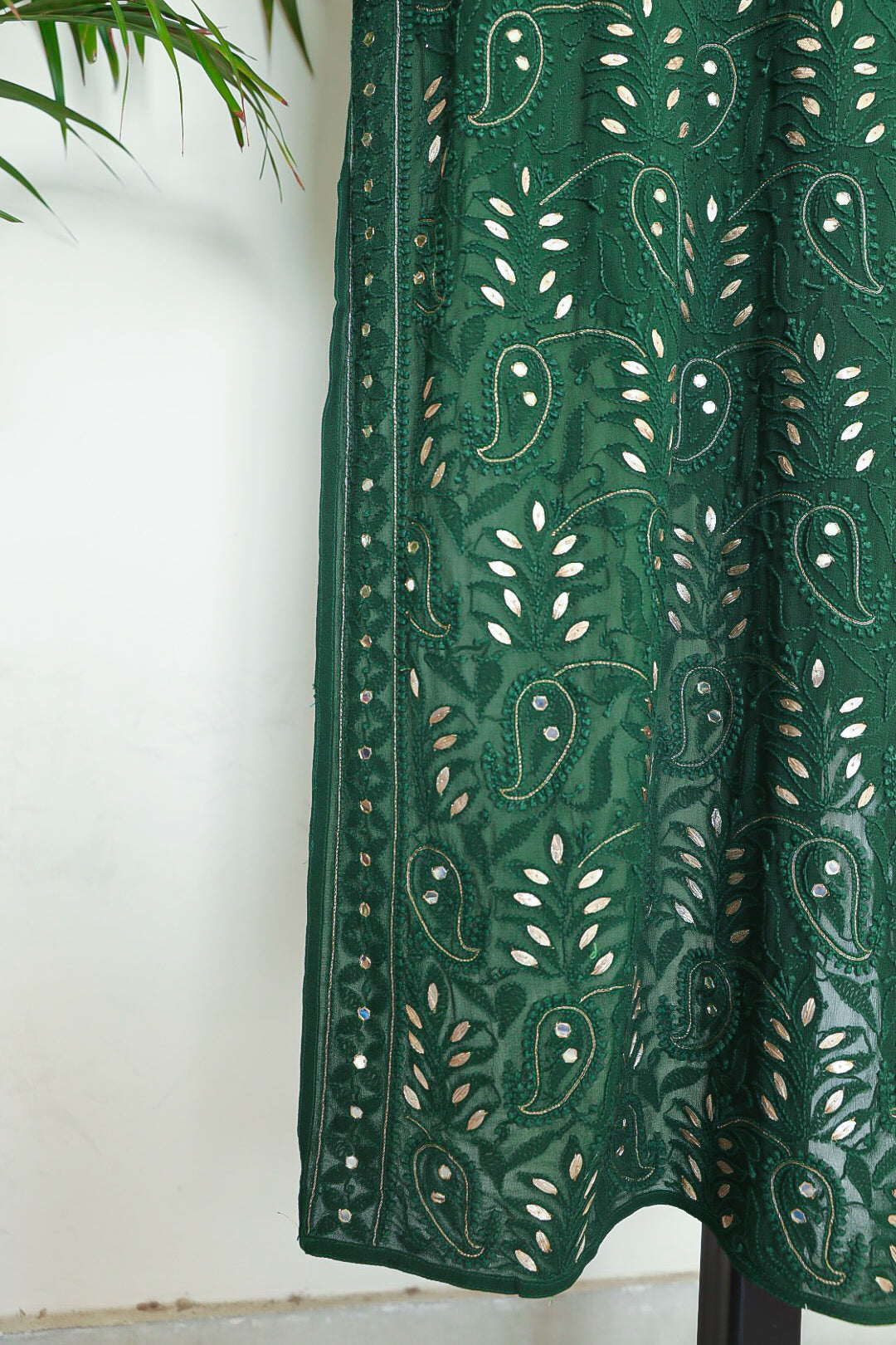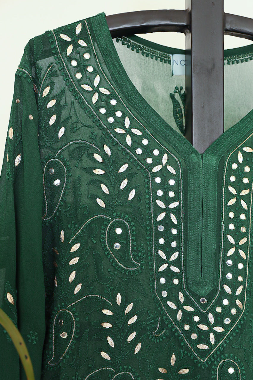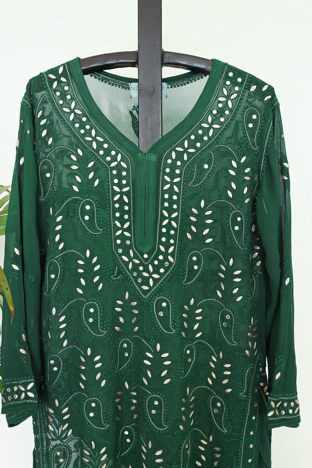 Chikankari is an Art of delicate handwork of Lucknow. It is a handcrafted process where the wooden blocks are manually carved in various designs, and the natural stew for printing is prepared, and printed on the cloth. The chikankari craftsmen then use ten ary of the needlecraft embroidery, and perform the needlework artistically. There are 32 stitches of chikankari broadly classified into Raised stitch, Embossed and Flat stitch.