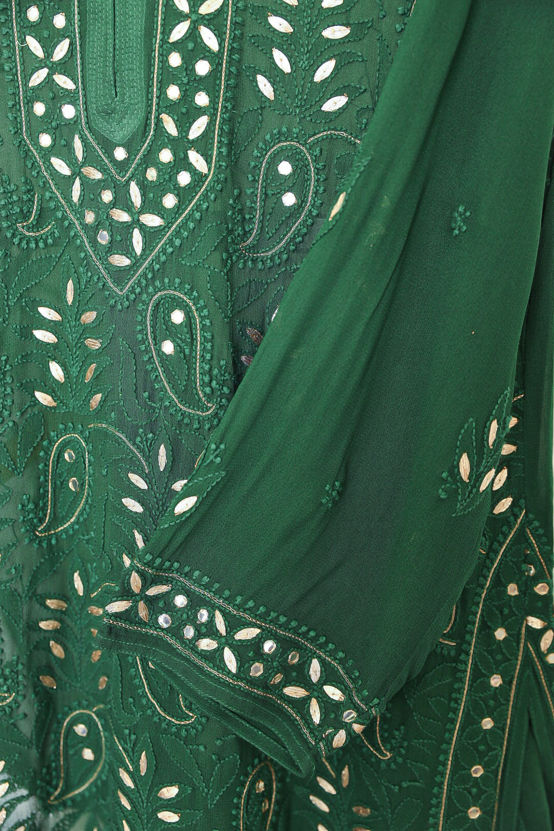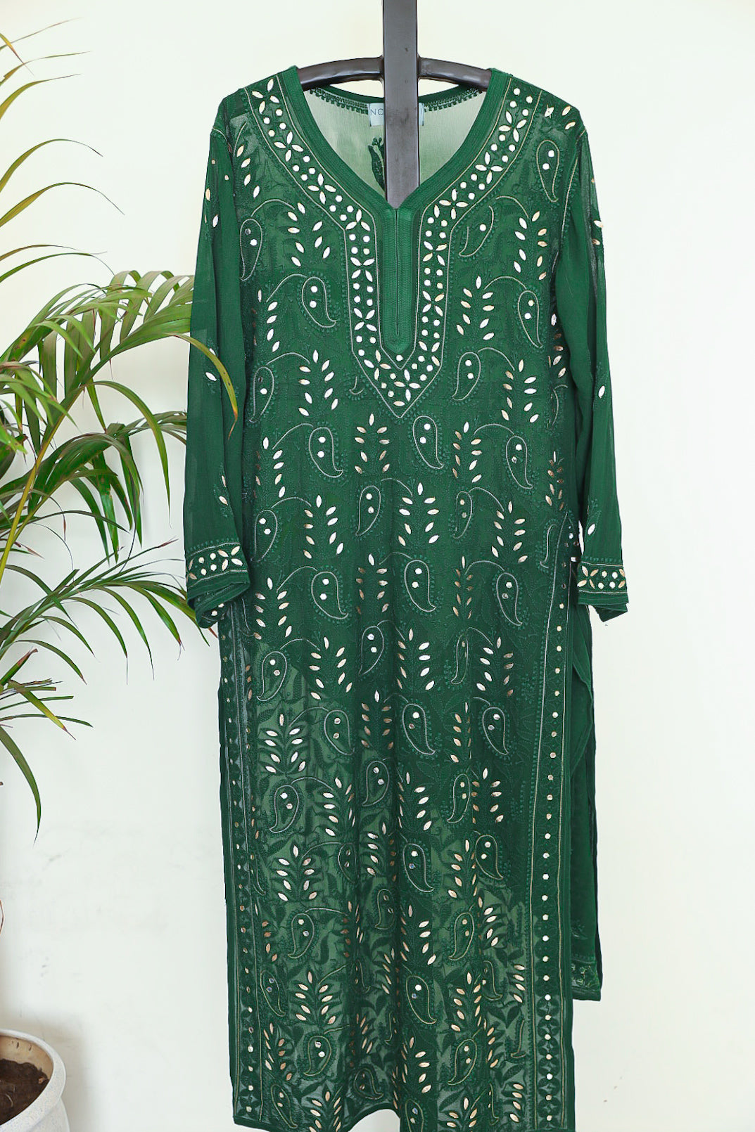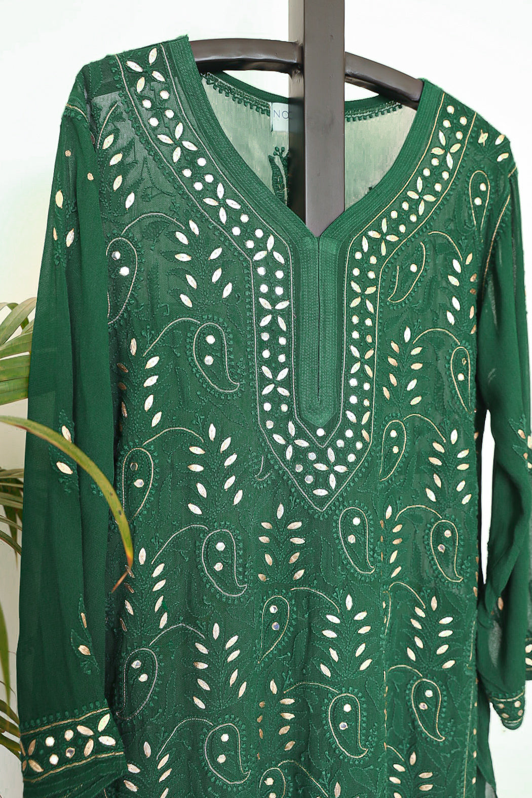 Chikankari is an Art of delicate handwork of Lucknow. It is a handcrafted process where the wooden blocks are manually carved in various designs, and the natural stew for printing is prepared, and printed on the cloth. The chikankari craftsmen then use ten ary of the needlecraft embroidery, and perform the needlework artistically. There are 32 stitches of chikankari broadly classified into Raised stitch, Embossed and Flat stitch.