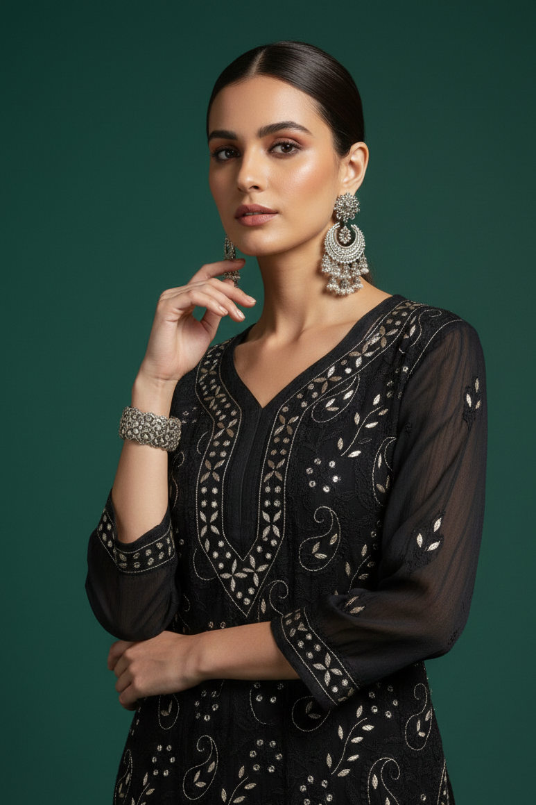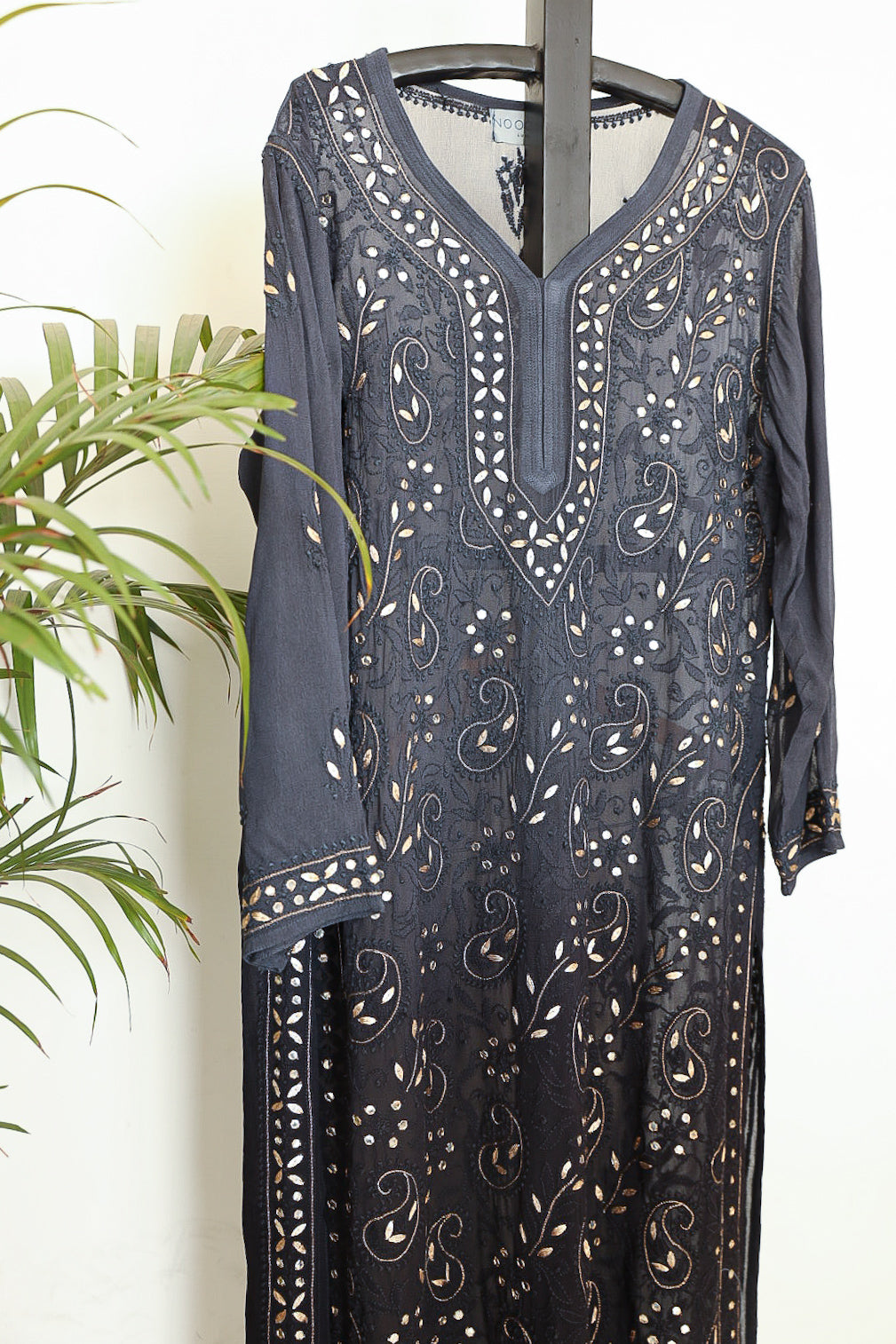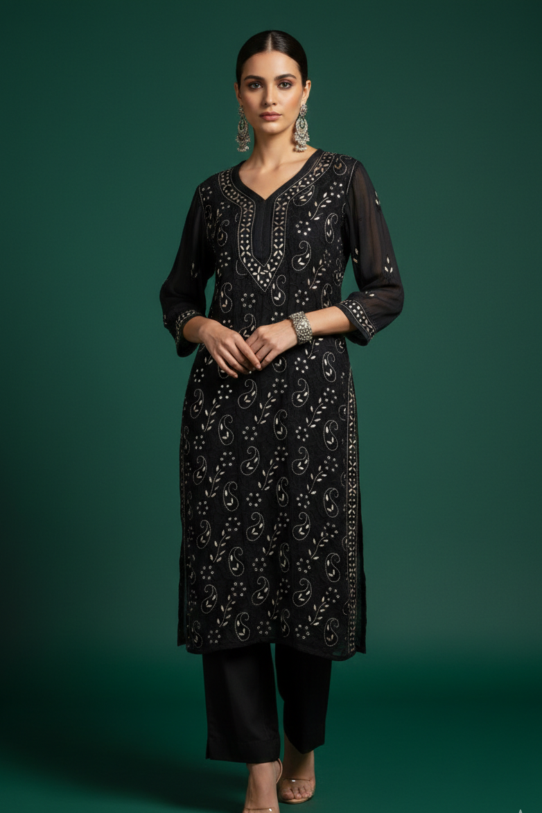Chikankari is an Art of delicate handwork of Lucknow. It is a handcrafted process where the wooden blocks are manually carved in various designs, and the natural stew for printing is prepared, and printed on the cloth. The chikankari craftsmen then use ten ary of the needlecraft embroidery, and perform the needlework artistically. There are 32 stitches of chikankari broadly classified into Raised stitch, Embossed and Flat stitch.