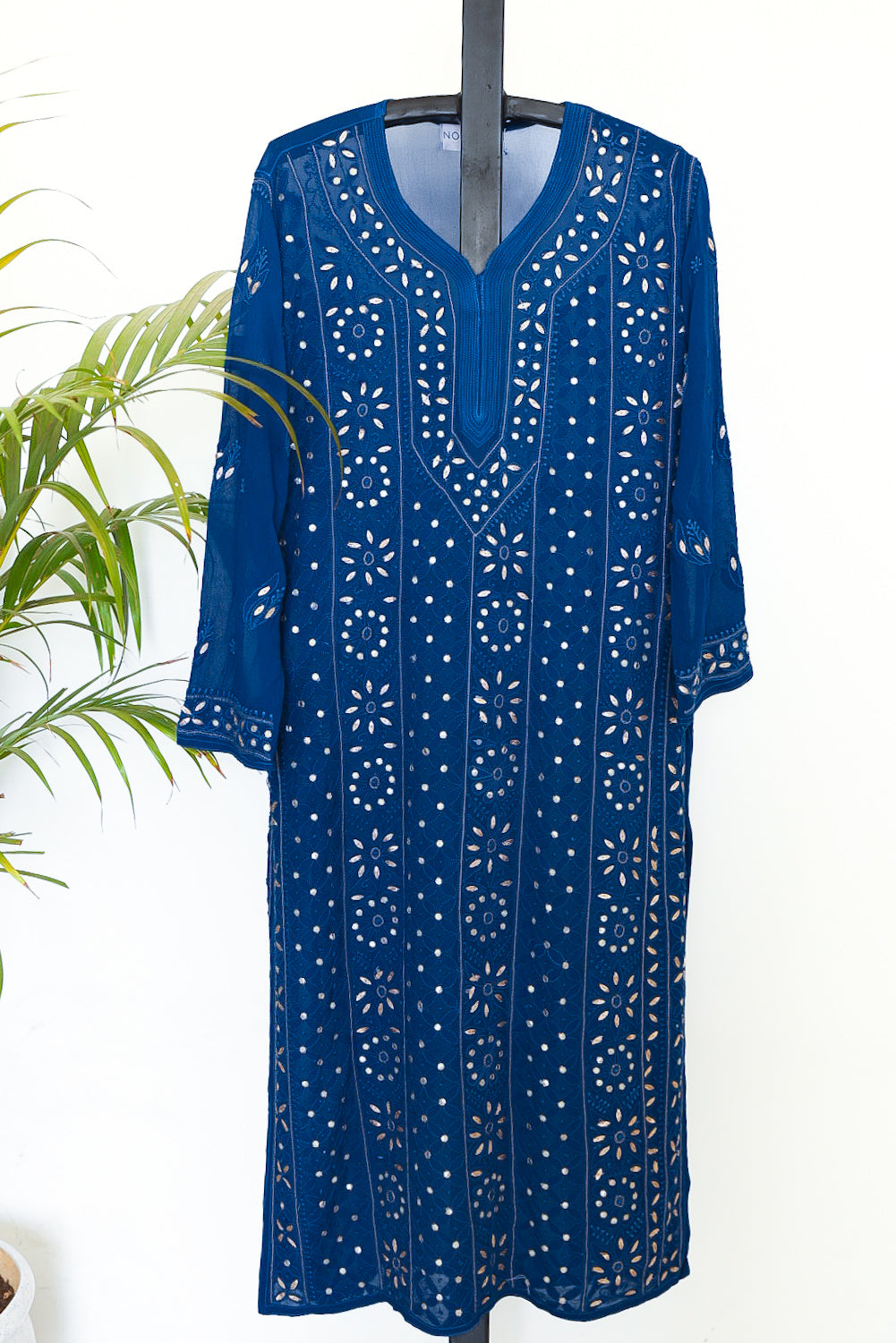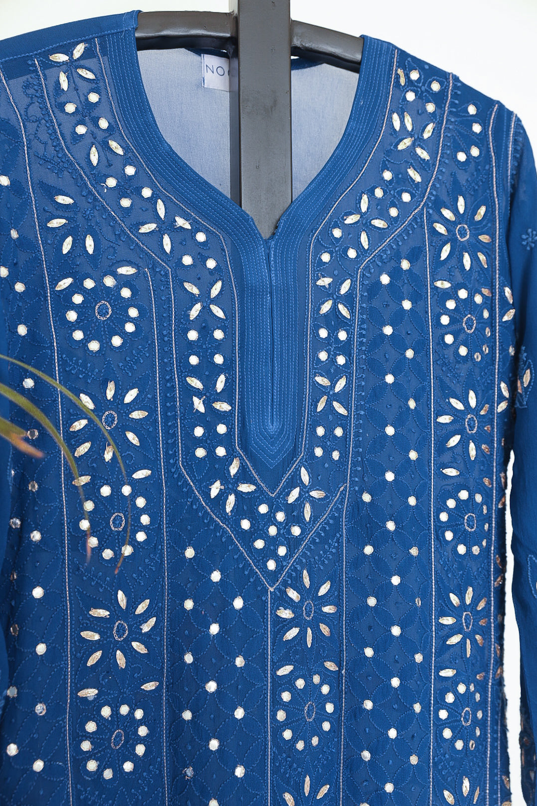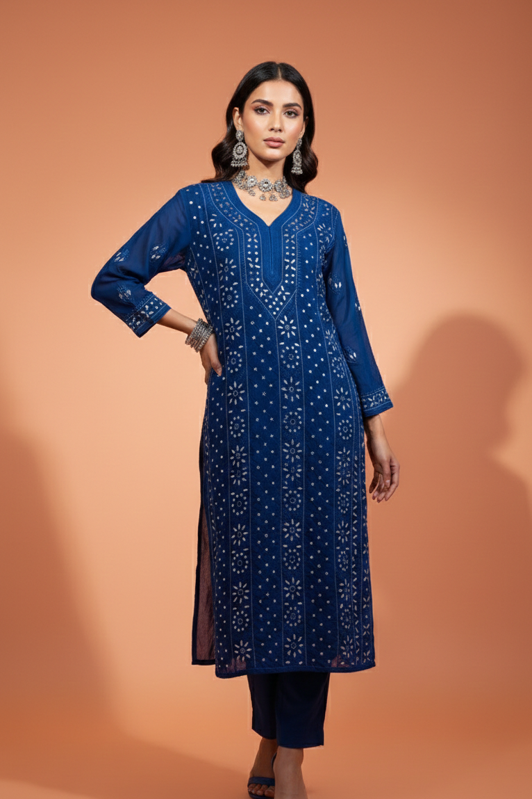 Chikankari is an Art of delicate handwork of Lucknow. It is a handcrafted process where the wooden blocks are manually carved in various designs, and the natural stew for printing is prepared, and printed on the cloth. The chikankari craftsmen then use ten ary of the needlecraft embroidery, and perform the needlework artistically. There are 32 stitches of chikankari broadly classified into Raised stitch, Embossed and Flat stitch.