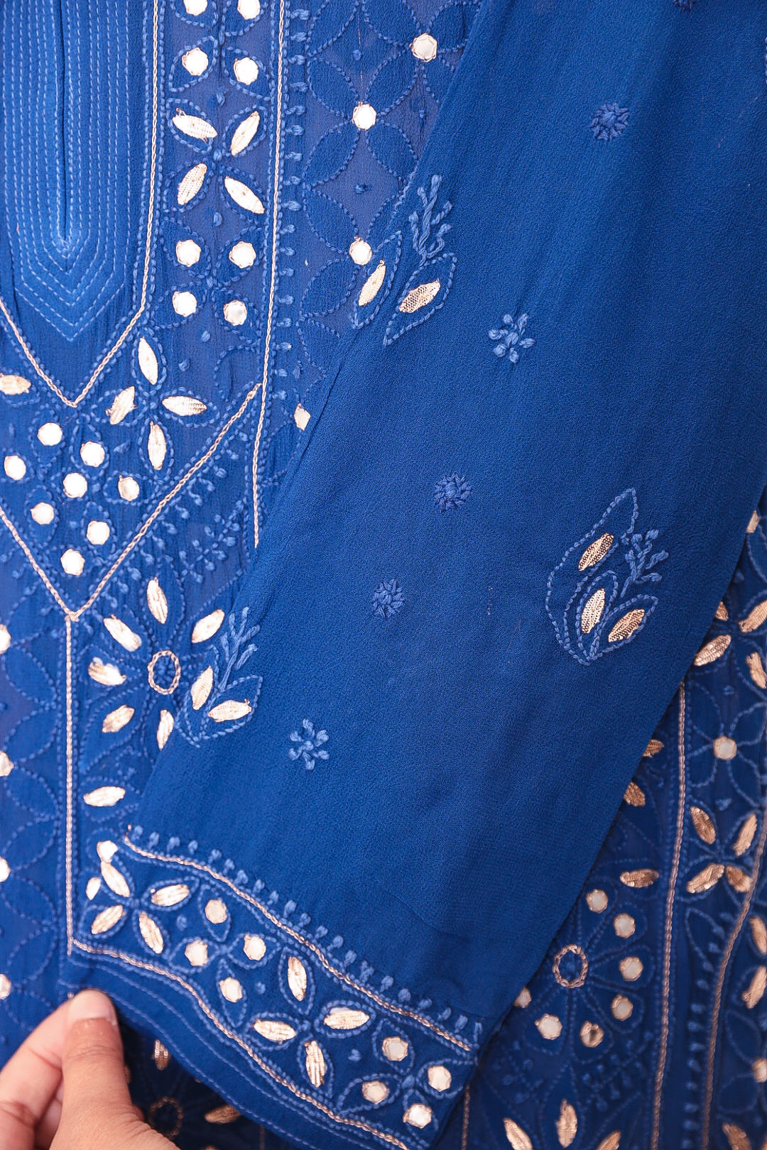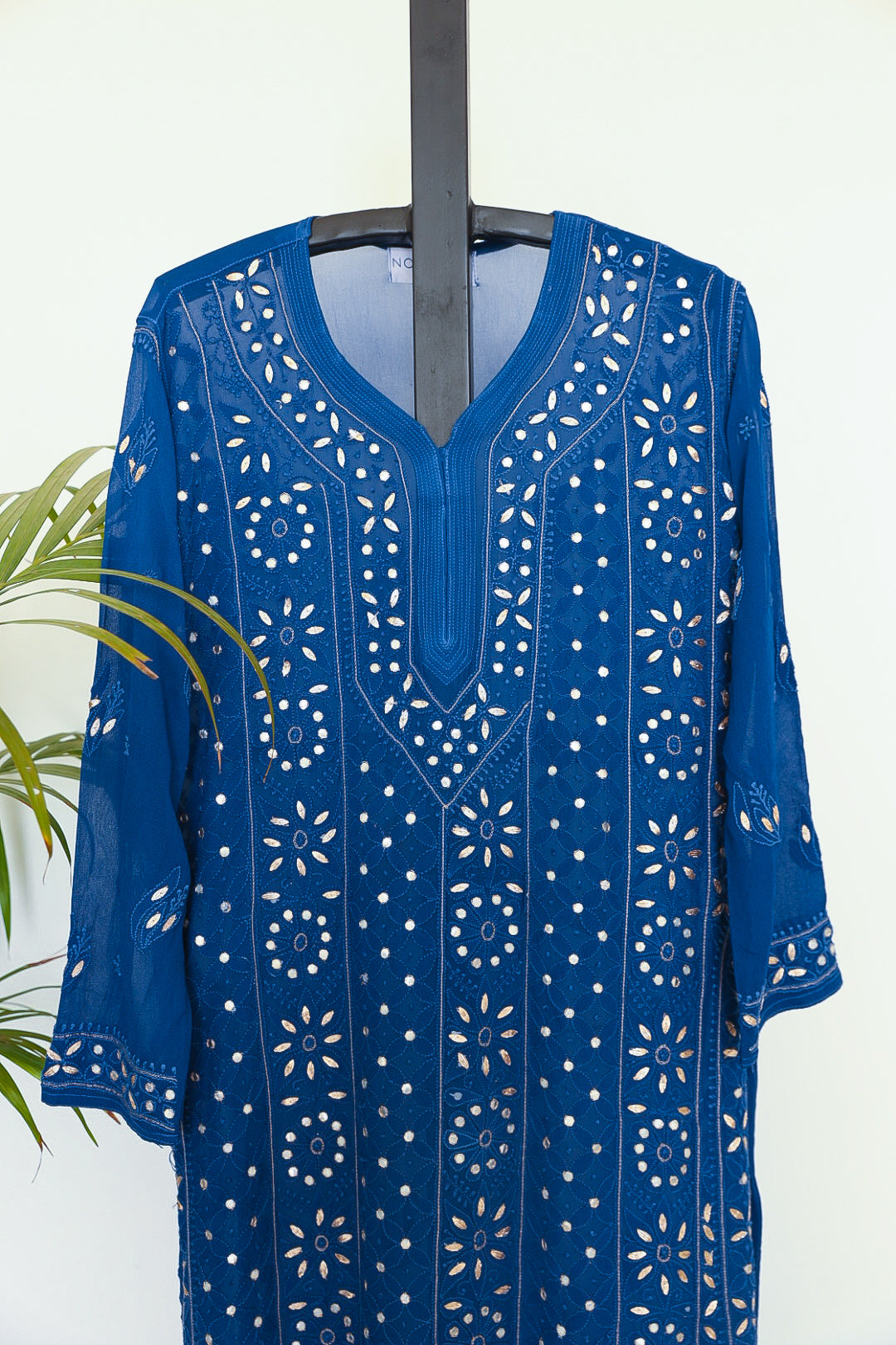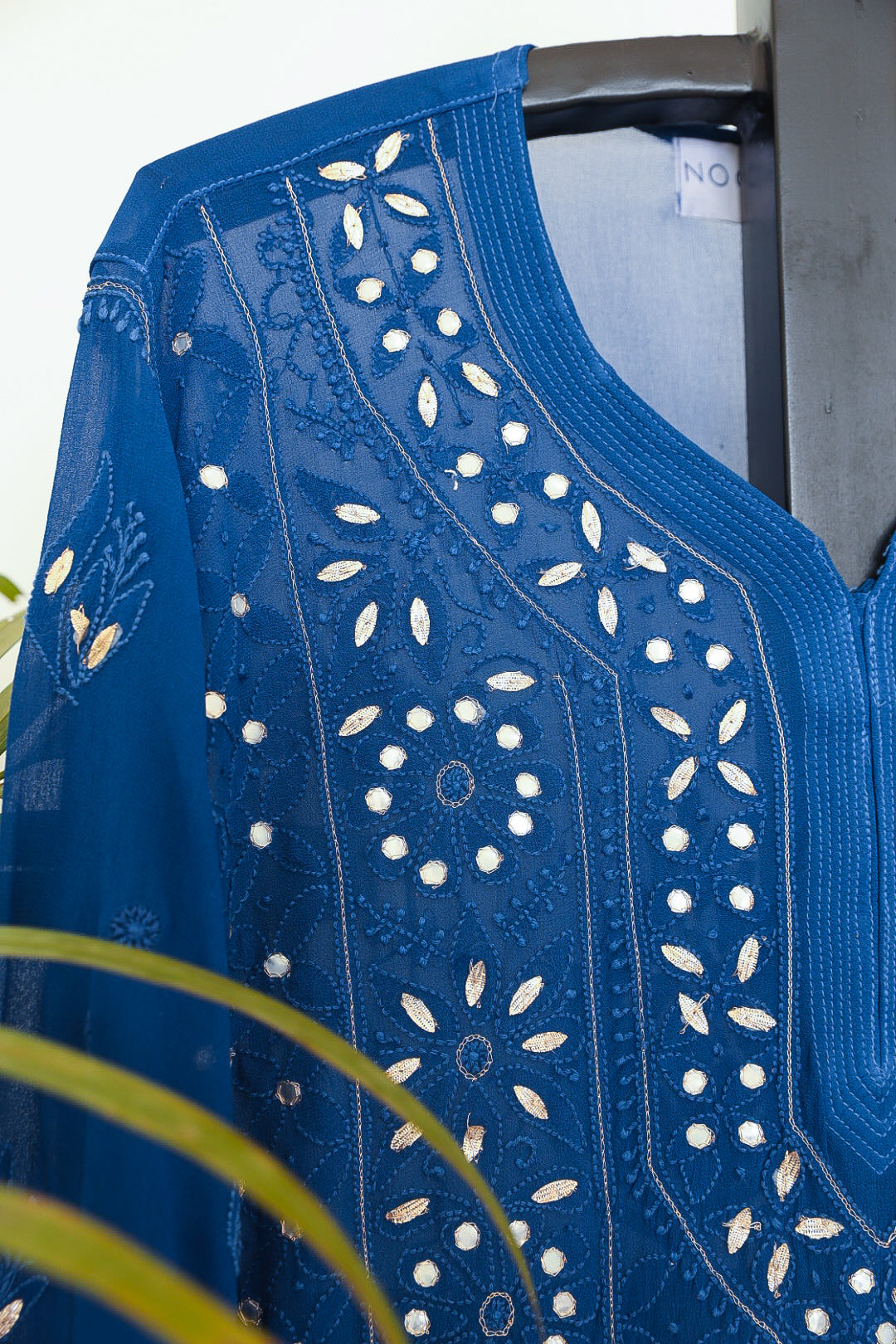 Chikankari is an Art of delicate handwork of Lucknow. It is a handcrafted process where the wooden blocks are manually carved in various designs, and the natural stew for printing is prepared, and printed on the cloth. The chikankari craftsmen then use ten ary of the needlecraft embroidery, and perform the needlework artistically. There are 32 stitches of chikankari broadly classified into Raised stitch, Embossed and Flat stitch.