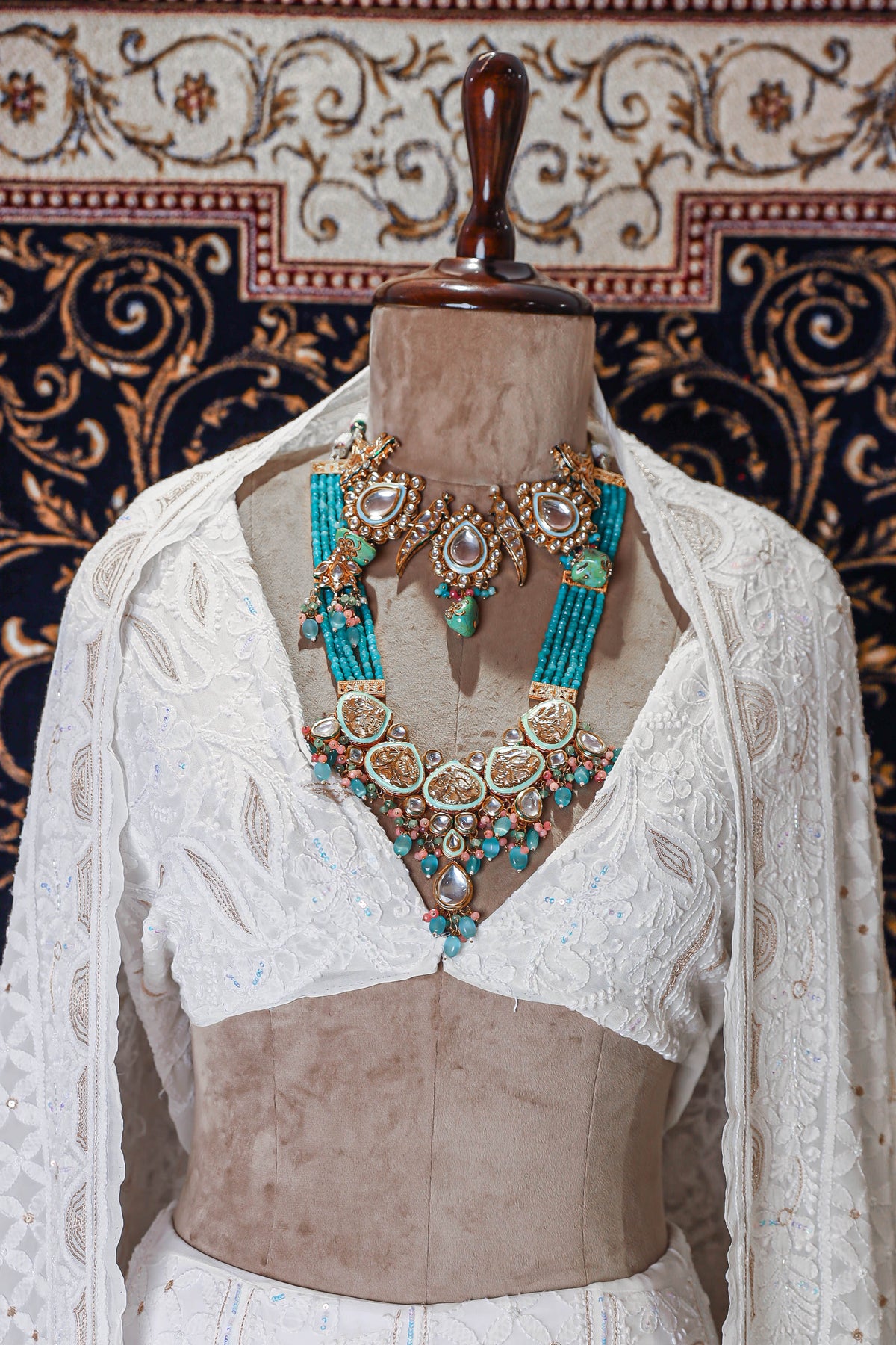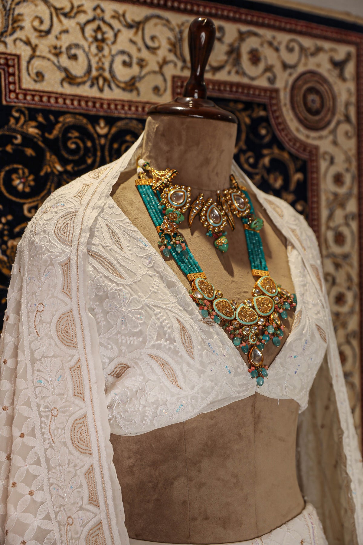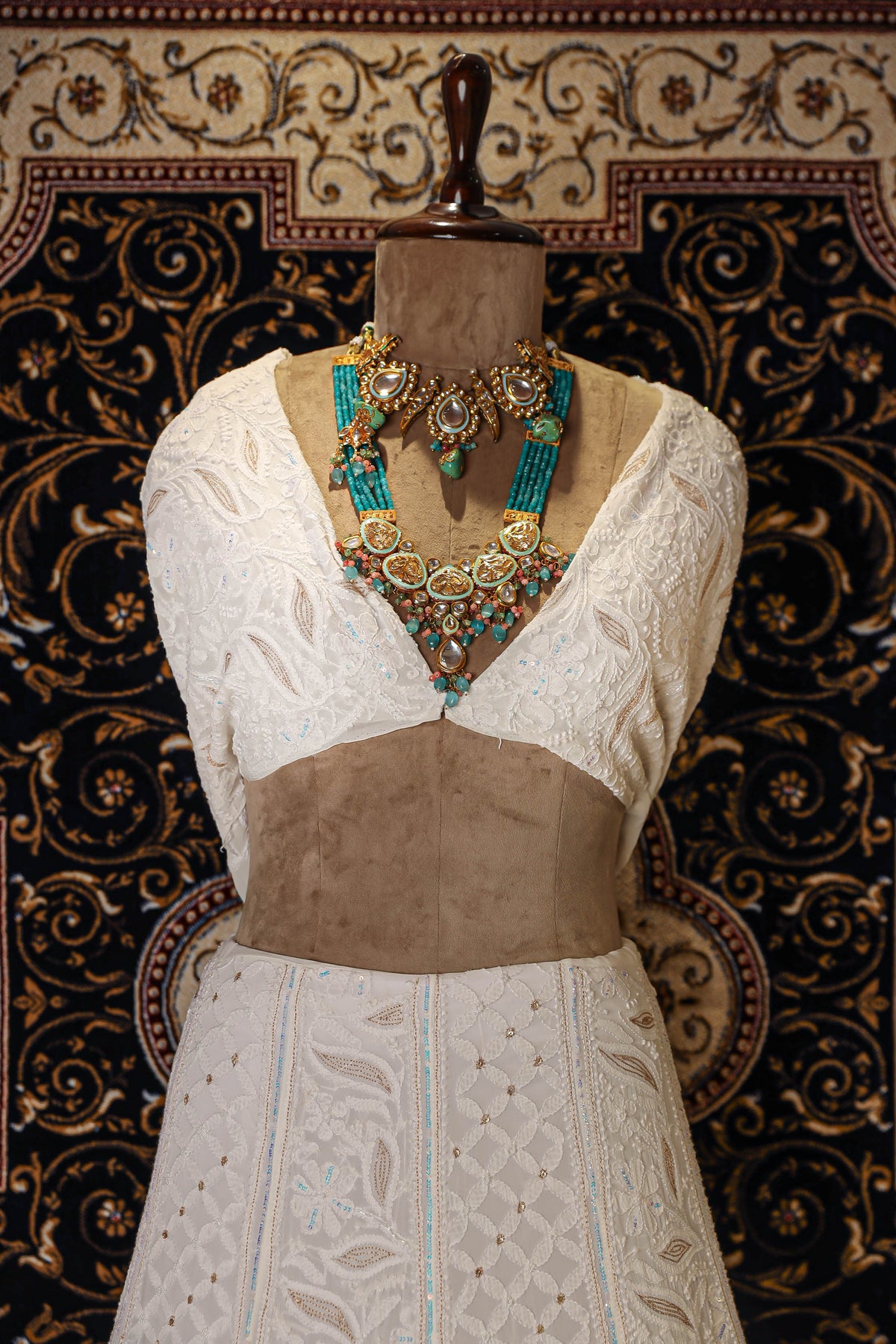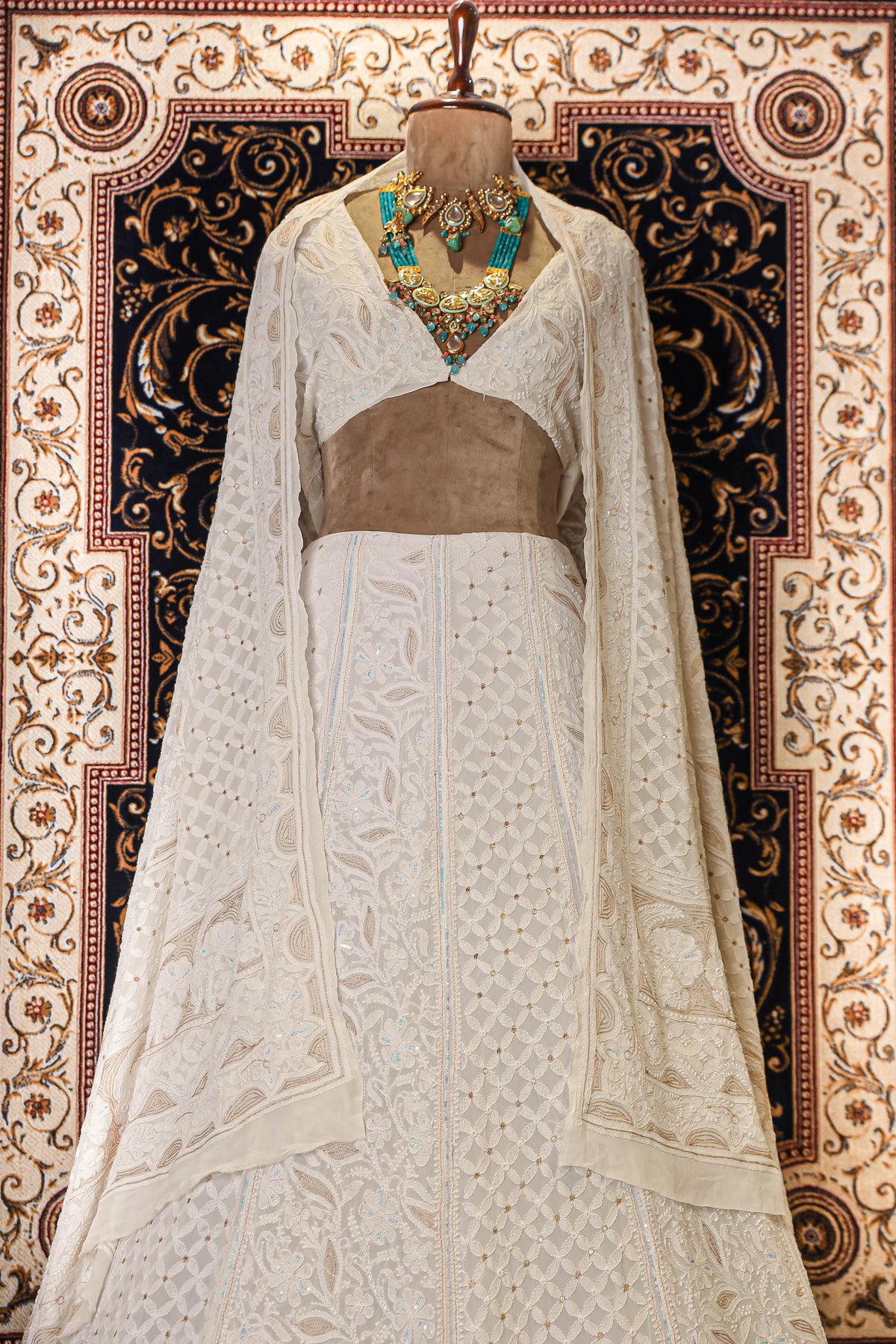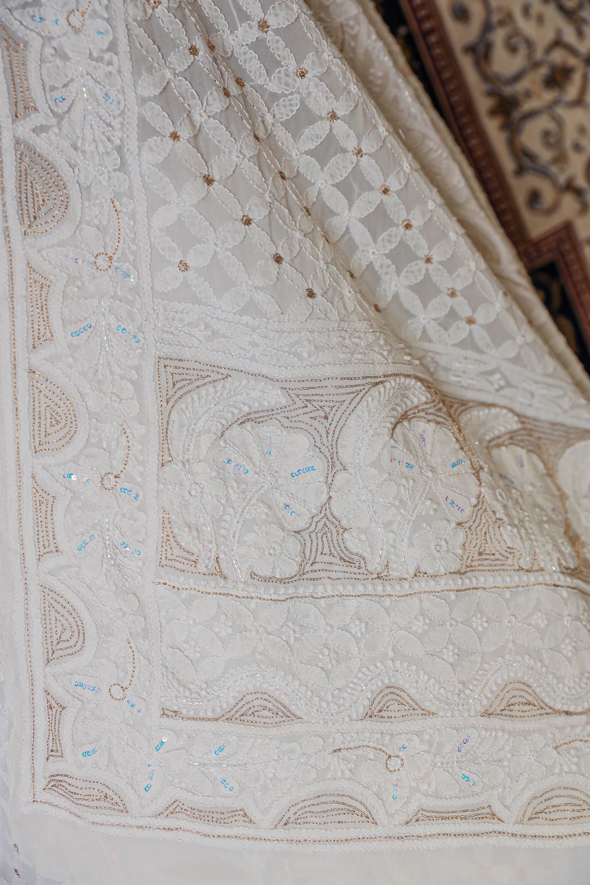 Chikankari is an Art of delicate handwork of Lucknow. It is a handcrafted process where the wooden blocks are manually carved in various designs, and the natural stew for printing is prepared, and printed on the cloth. The chikankari craftsmen then use ten ary of the needlecraft embroidery, and perform the needlework artistically. There are 32 stitches of chikankari broadly classified into Raised stitch, Embossed and Flat stitch.