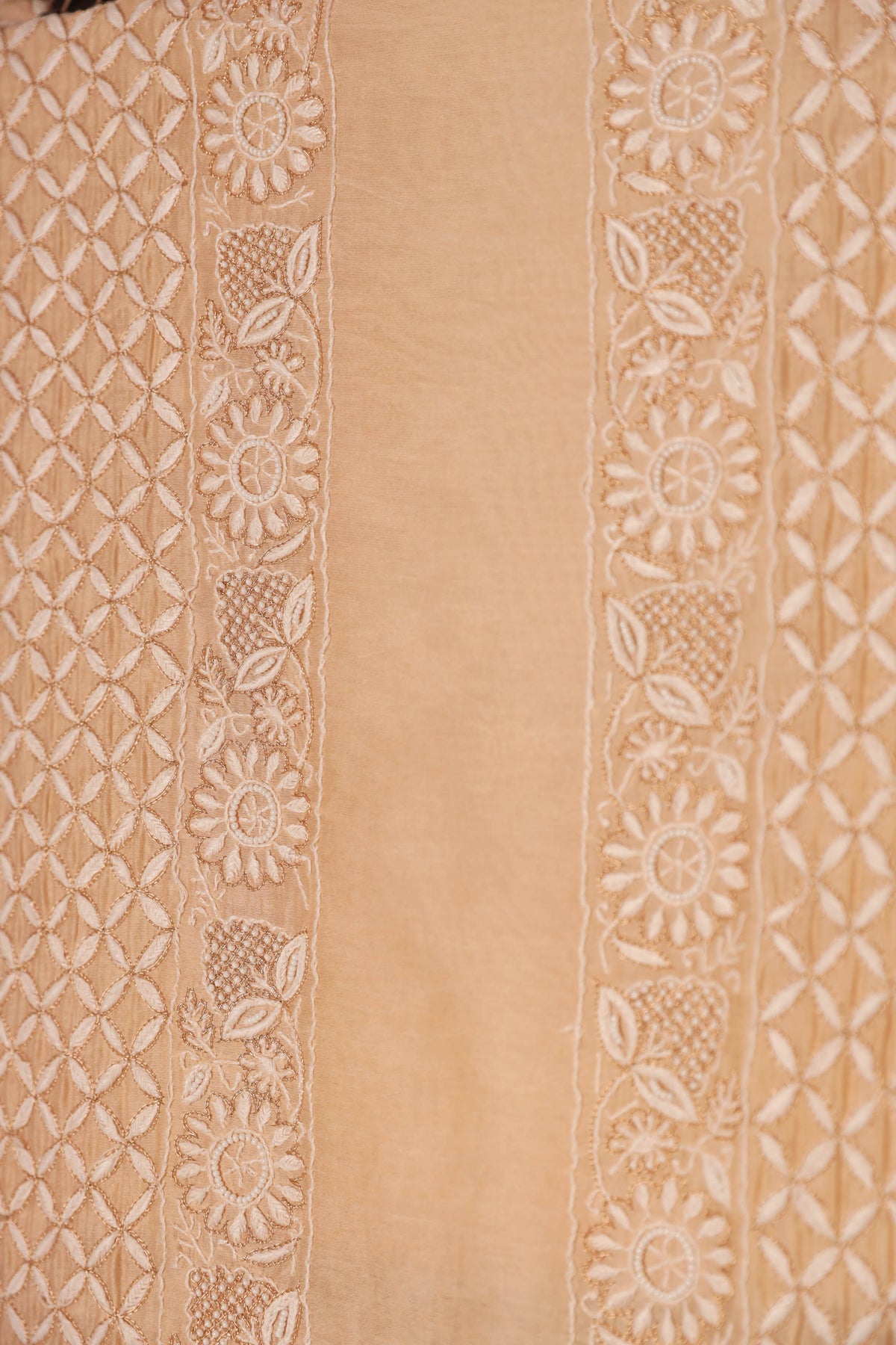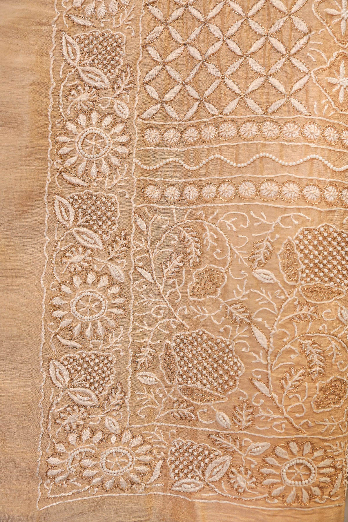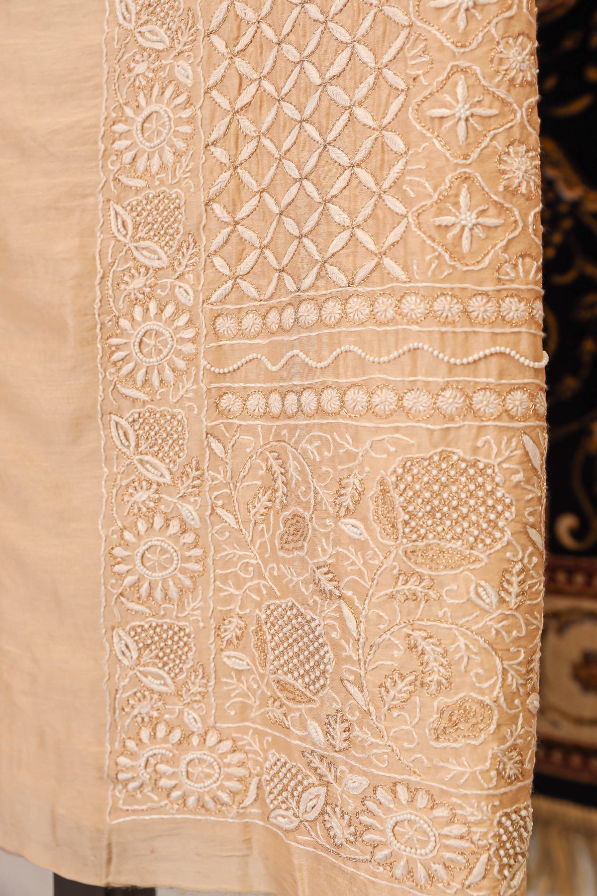 Chikankari is an Art of delicate handwork of Lucknow. It is a handcrafted process where the wooden blocks are manually carved in various designs, and the natural stew for printing is prepared, and printed on the cloth. The chikankari craftsmen then use ten ary of the needlecraft embroidery, and perform the needlework artistically. There are 32 stitches of chikankari broadly classified into Raised stitch, Embossed and Flat stitch.