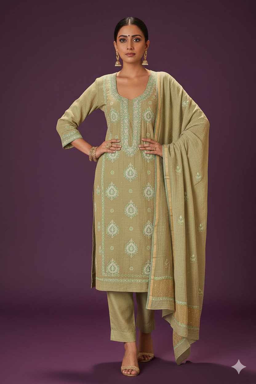 Stitched Devika Tissue Chikankari 3 Piece Suit Set