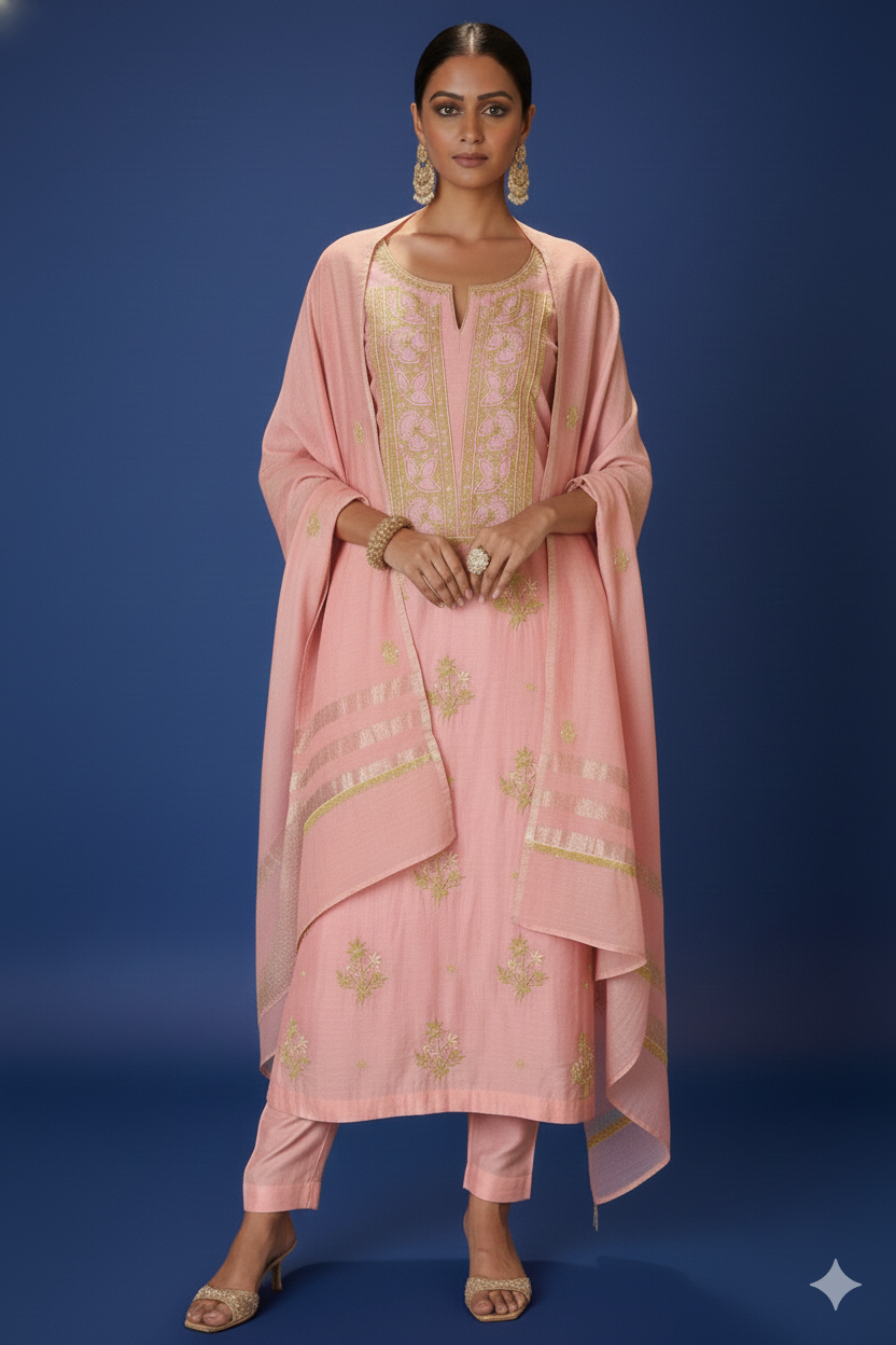 Chikankari is an Art of delicate handwork of Lucknow. It is a handcrafted process where the wooden blocks are manually carved in various designs, and the natural stew for printing is prepared, and printed on the cloth. The chikankari craftsmen then use ten ary of the needlecraft embroidery, and perform the needlework artistically. There are 32 stitches of chikankari broadly classified into Raised stitch, Embossed and Flat stitch.