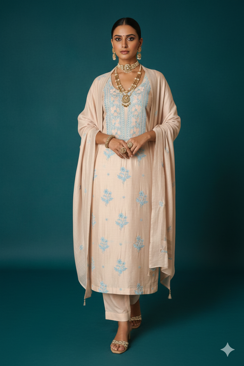 Trivia : Chikankari is an Art of delicate handwork of Lucknow. It is a handcrafted process where the wooden blocks are manually carved in various designs, and the natural stew for printing is prepared, and printed on the cloth. The chikankari craftsmen then use ten ary of the needlecraft embroidery, and perform the needlework artistically. There are 32 stitches of chikankari broadly classified into Raised stitch, Embossed and Flat stitch.