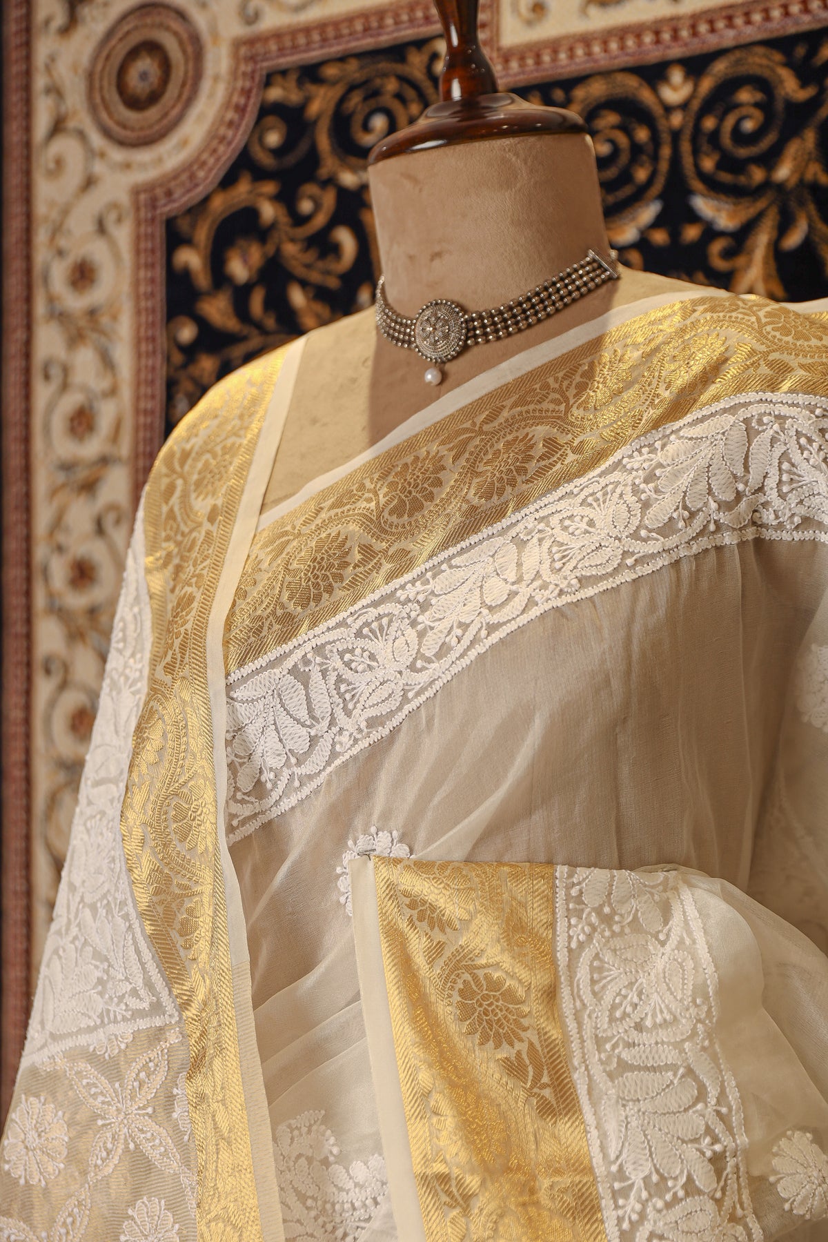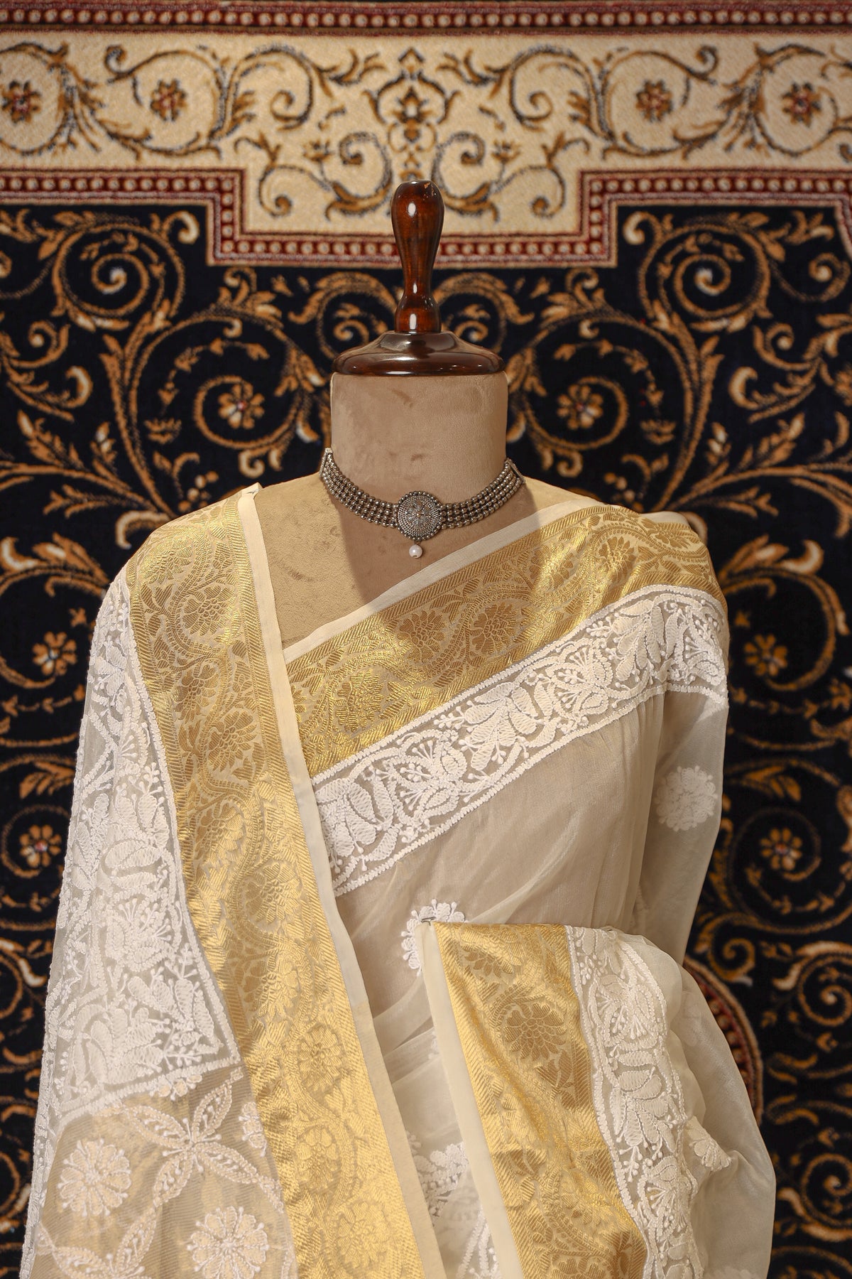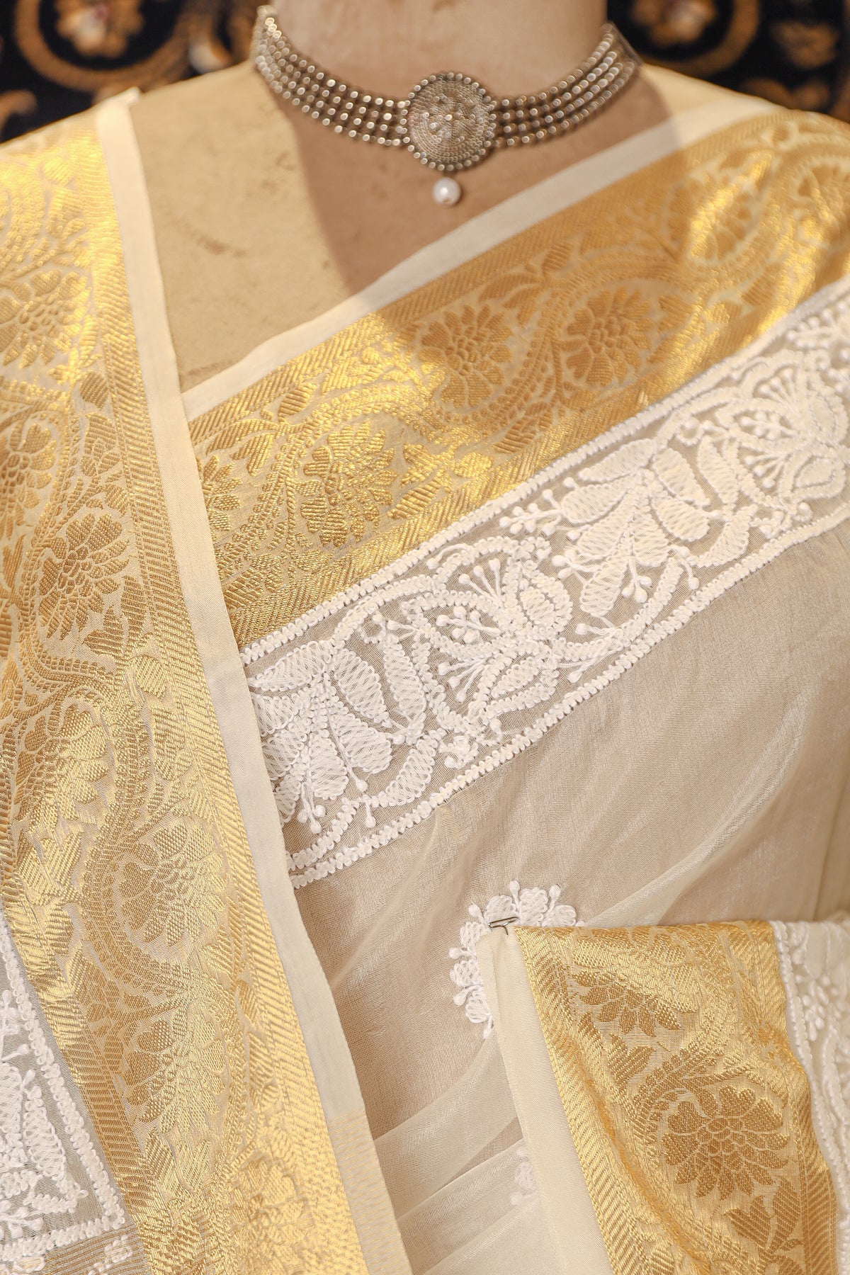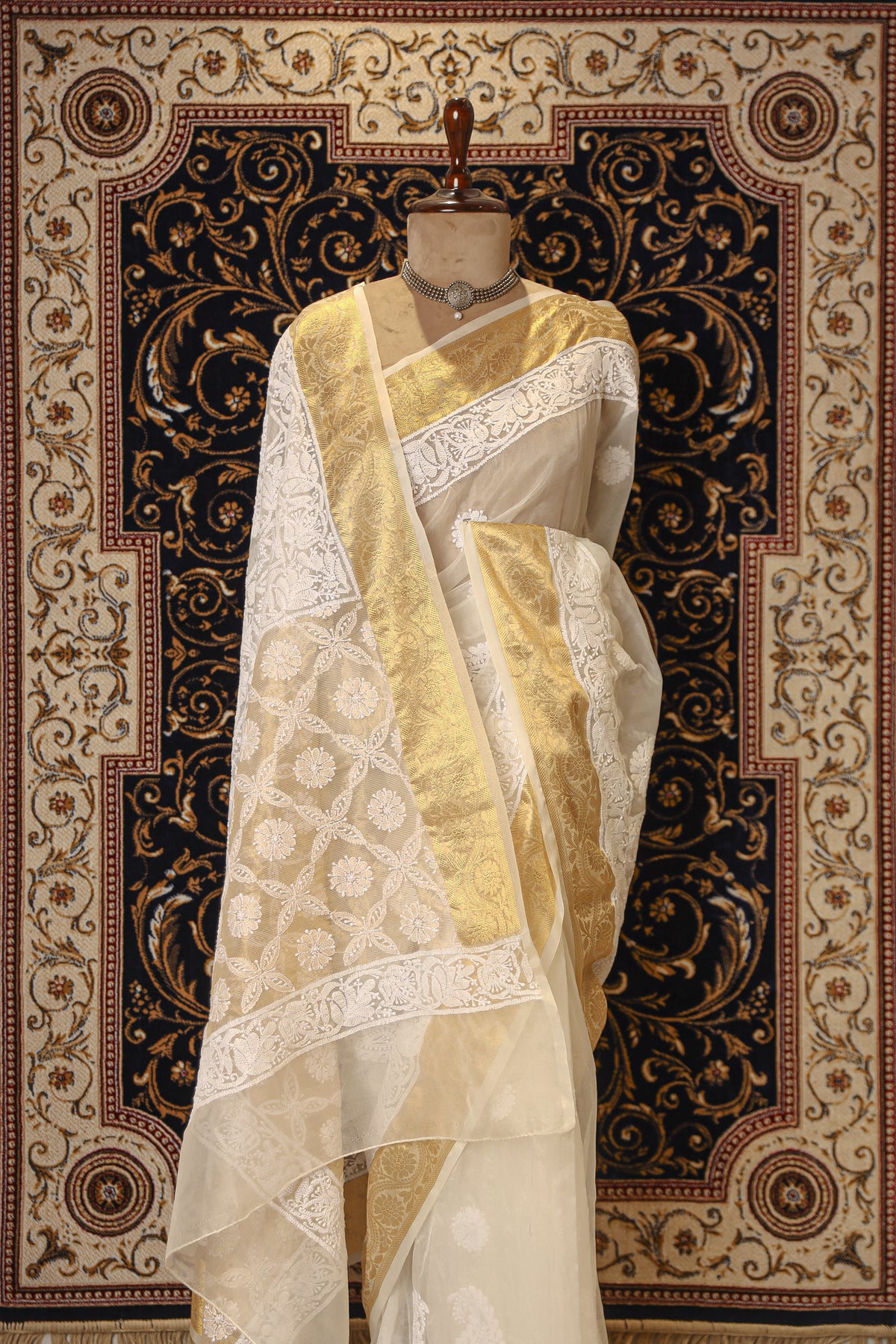 Chikankari is an Art of delicate handwork of Lucknow. It is a handcrafted process where the wooden blocks are manually carved in various designs, and the natural stew for printing is prepared, and printed on the cloth. The chikankari craftsmen then use ten ary of the needlecraft embroidery, and perform the needlework artistically. There are 32 stitches of chikankari broadly classified into Raised stitch, Embossed and Flat stitch.
