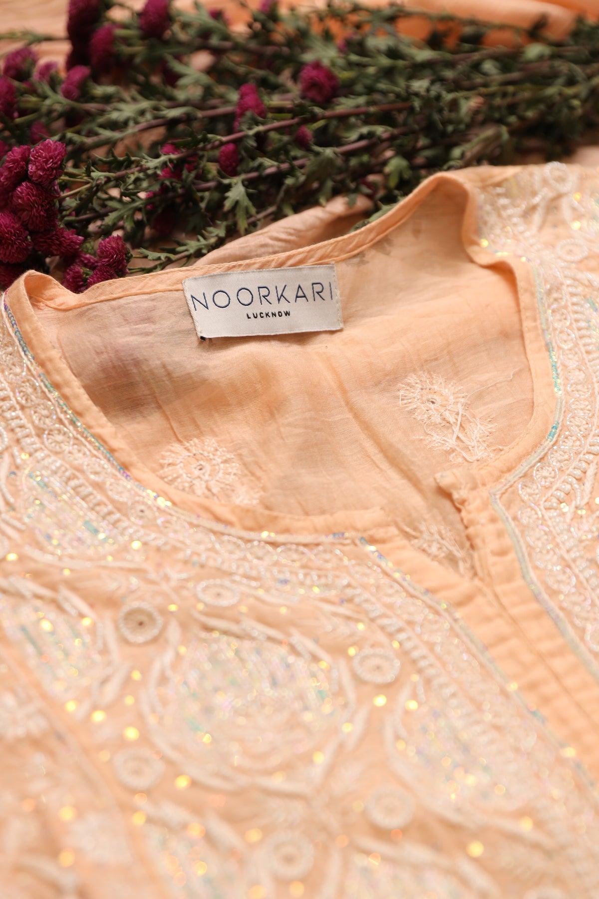 Chikankari is an Art of delicate handwork of Lucknow. It is a handcrafted process where the wooden blocks are manually carved in various designs, and the natural stew for printing is prepared, and printed on the cloth. The chikankari craftsmen then use ten ary of the needlecraft embroidery, and perform the needlework artistically. There are 32 stitches of chikankari broadly classified into Raised stitch, Embossed and Flat stitch.