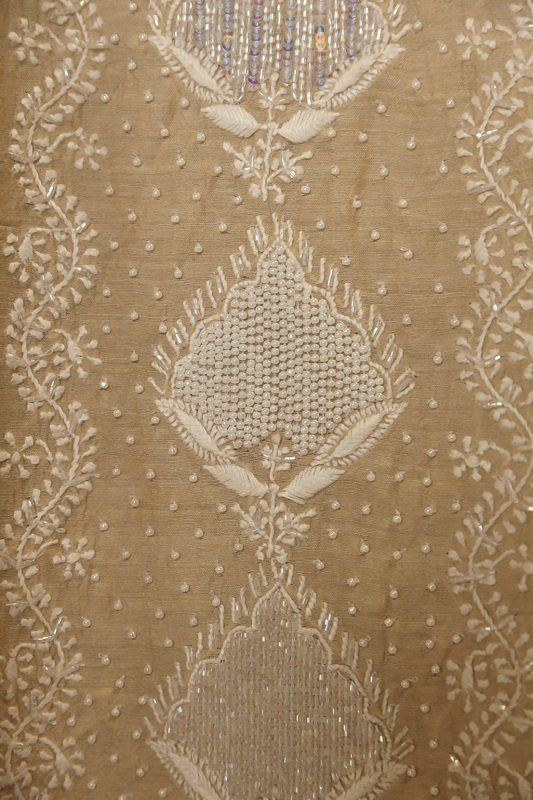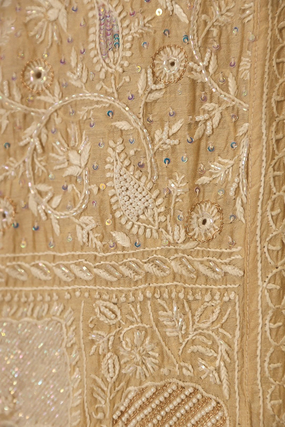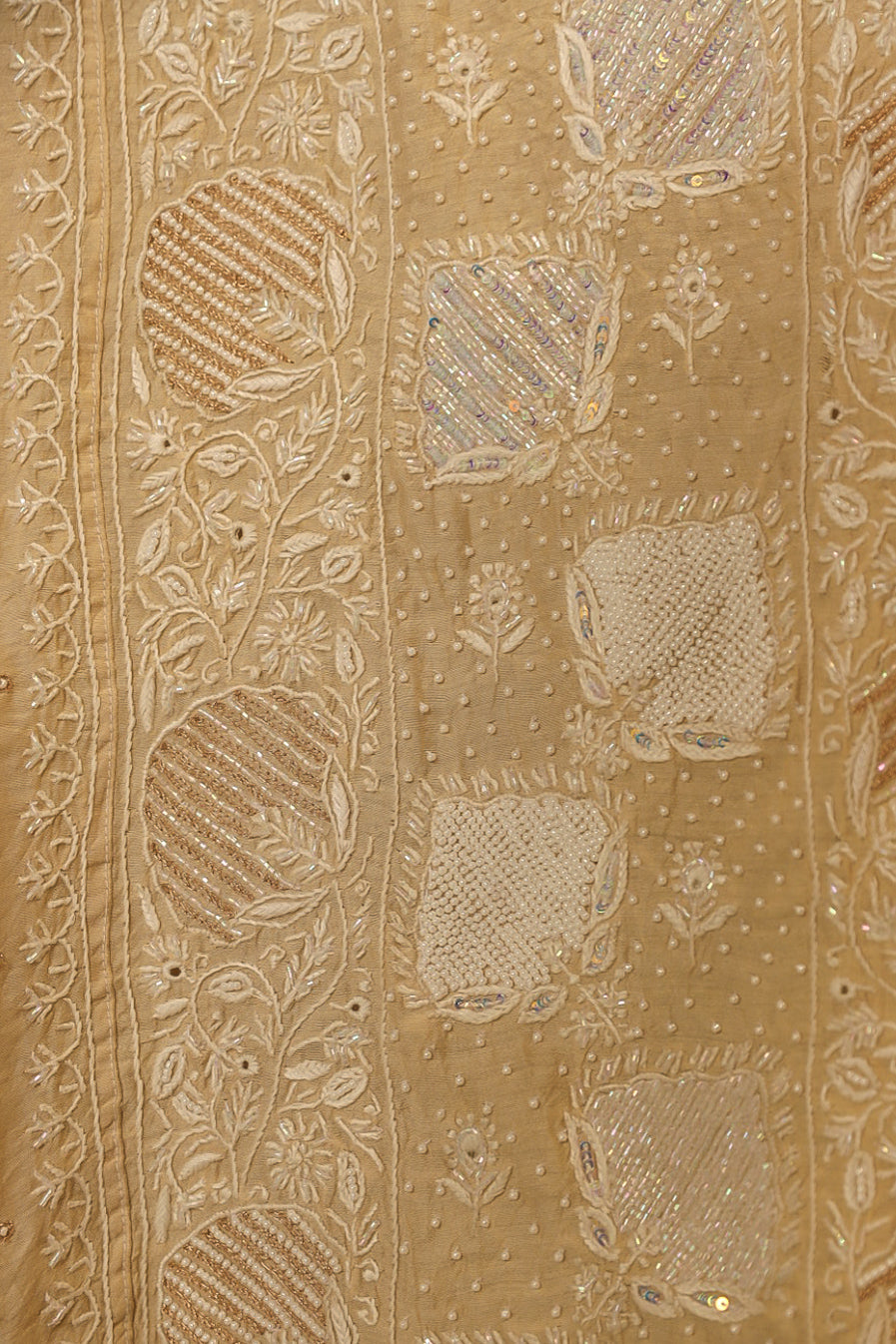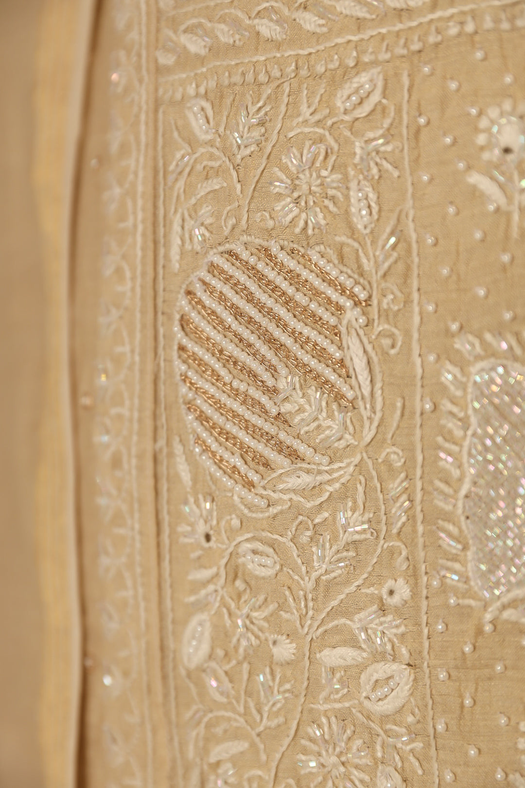 Chikankari is an Art of delicate handwork of Lucknow. It is a handcrafted process where the wooden blocks are manually carved in various designs, and the natural stew for printing is prepared, and printed on the cloth. The chikankari craftsmen then use ten ary of the needlecraft embroidery, and perform the needlework artistically. There are 32 stitches of chikankari broadly classified into Raised stitch, Embossed and Flat stitch.