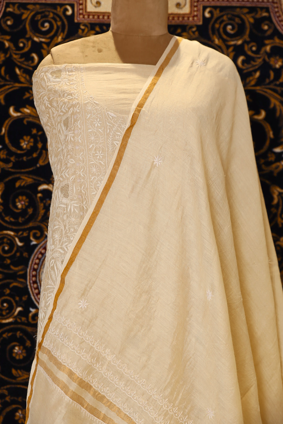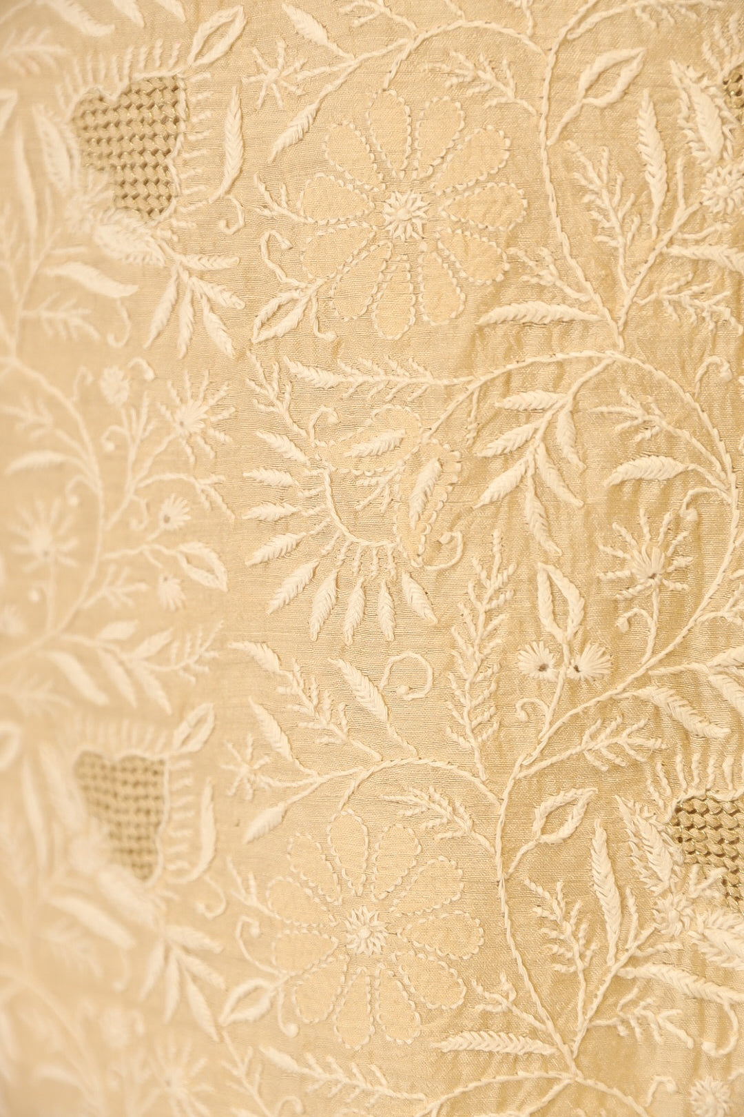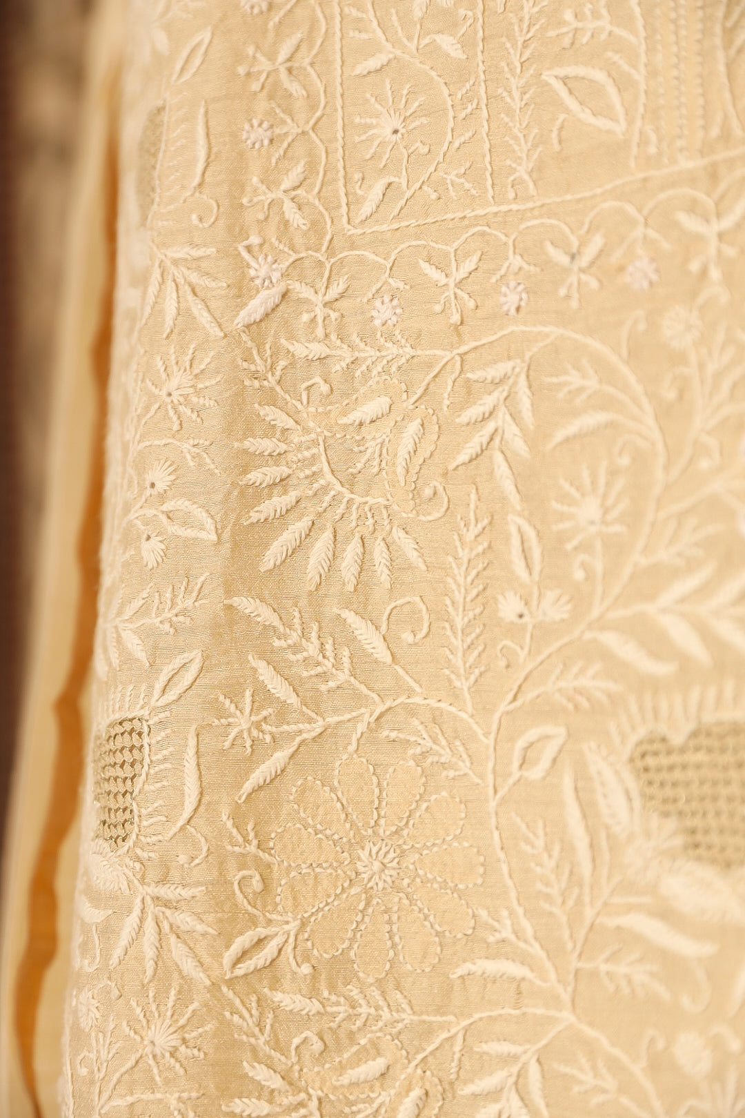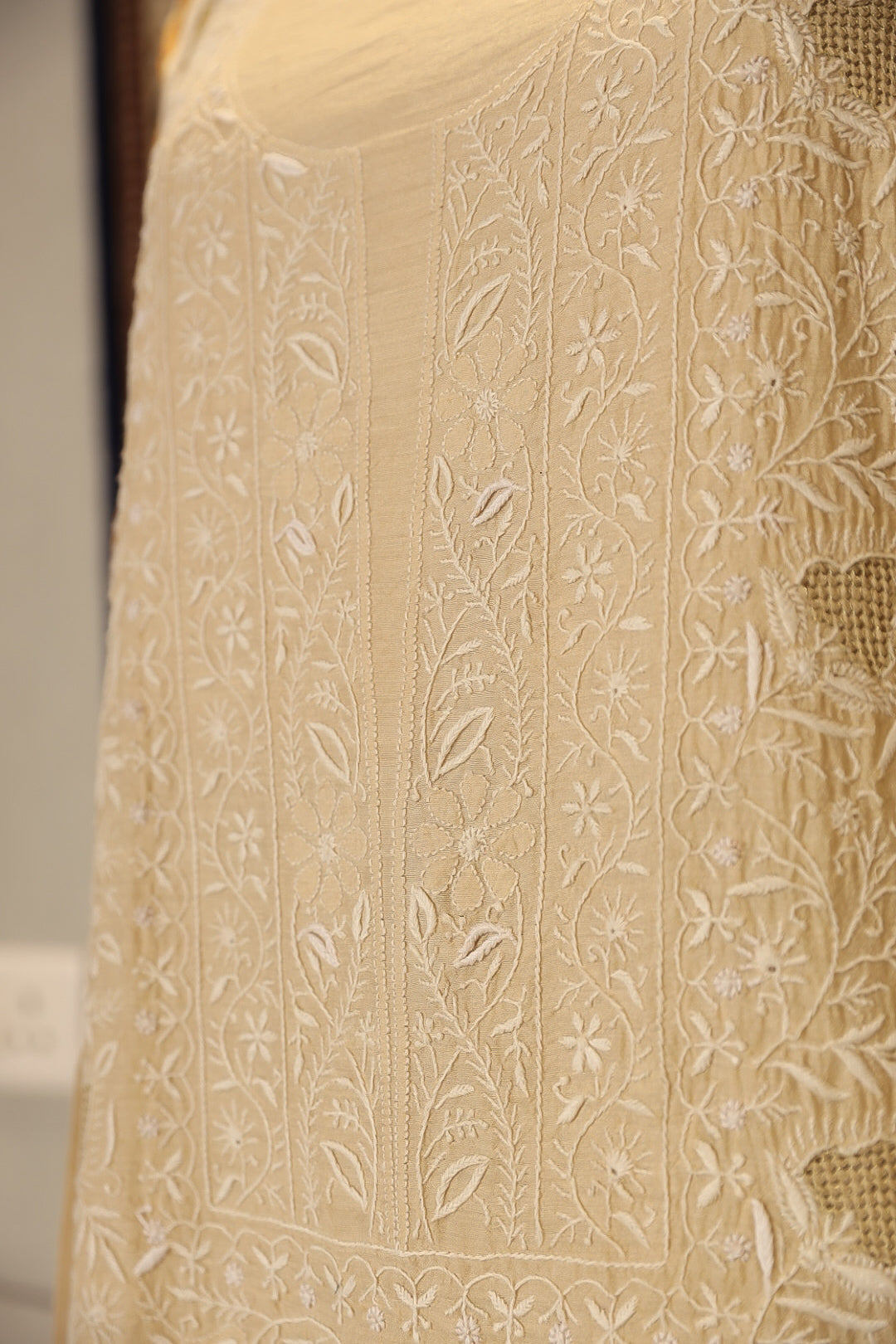 Chikankari is an Art of delicate handwork of Lucknow. It is a handcrafted process where the wooden blocks are manually carved in various designs, and the natural stew for printing is prepared, and printed on the cloth. The chikankari craftsmen then use ten ary of the needlecraft embroidery, and perform the needlework artistically. There are 32 stitches of chikankari broadly classified into Raised stitch, Embossed and Flat stitch.