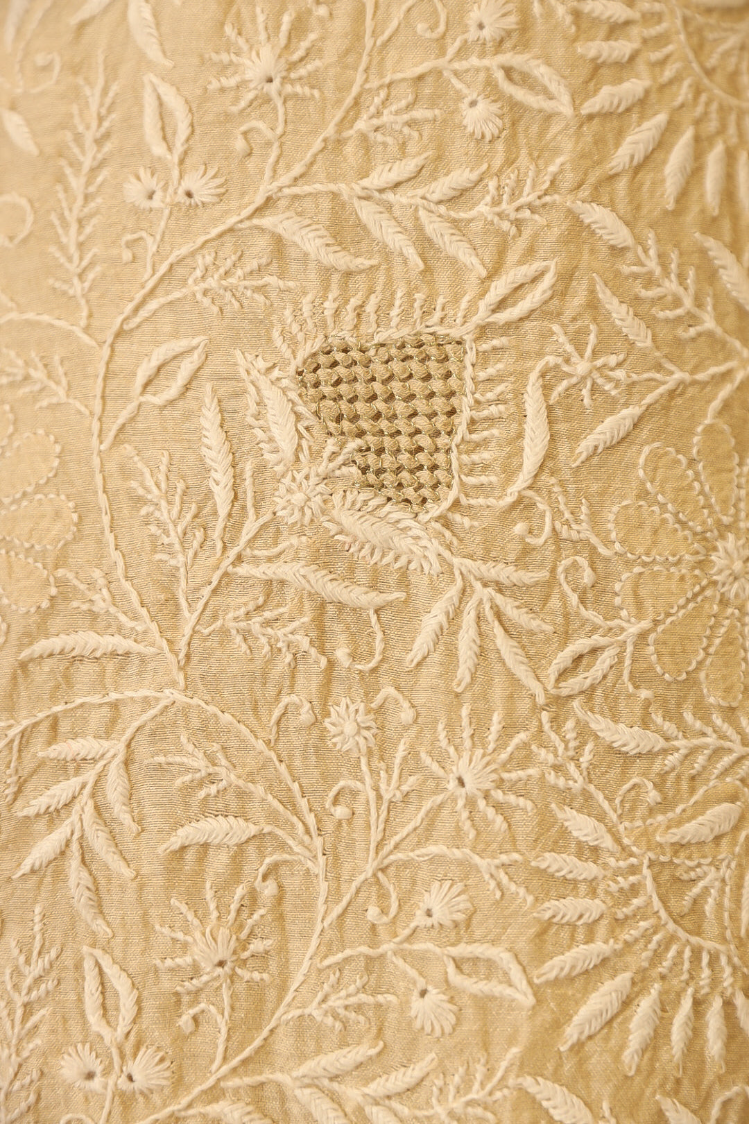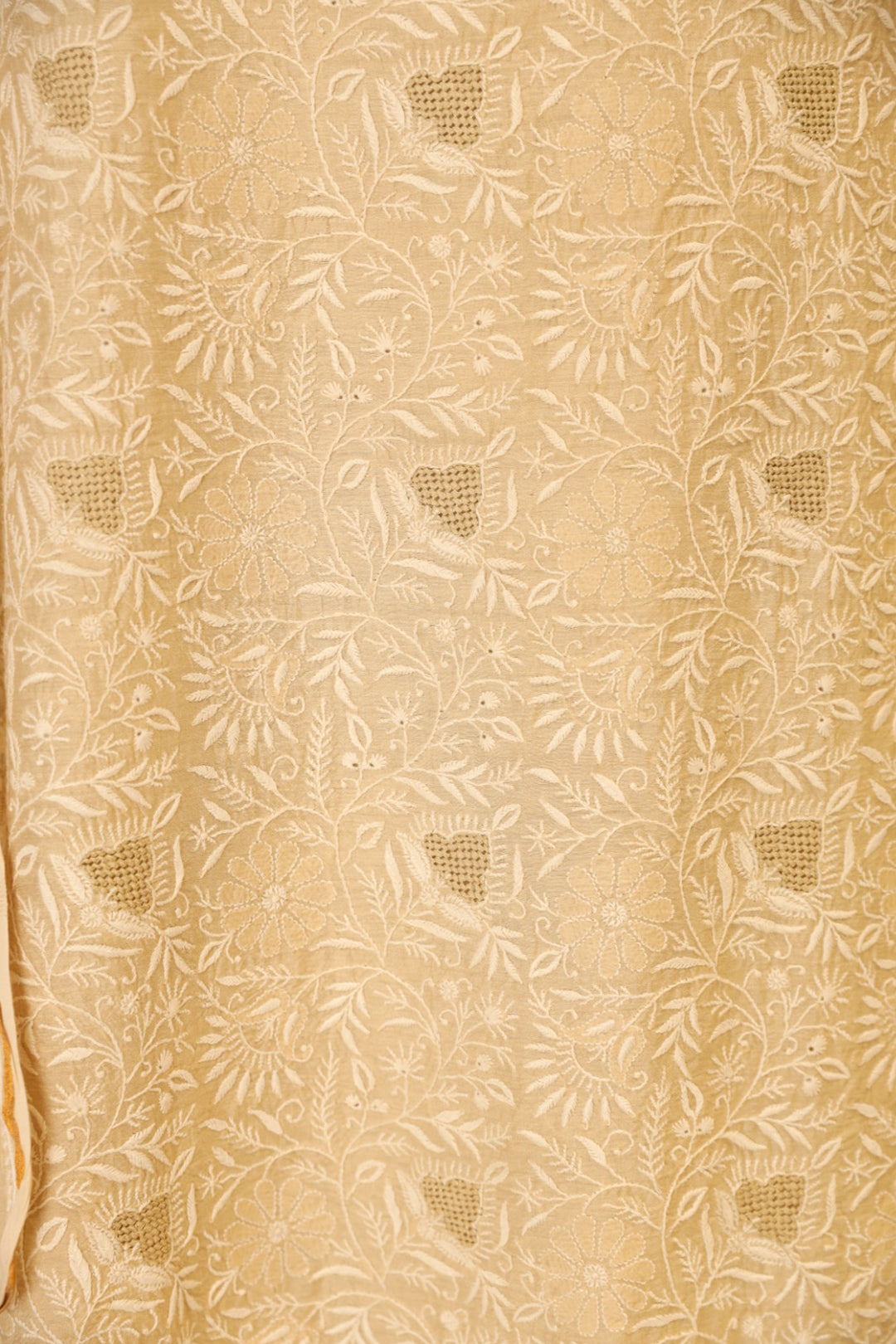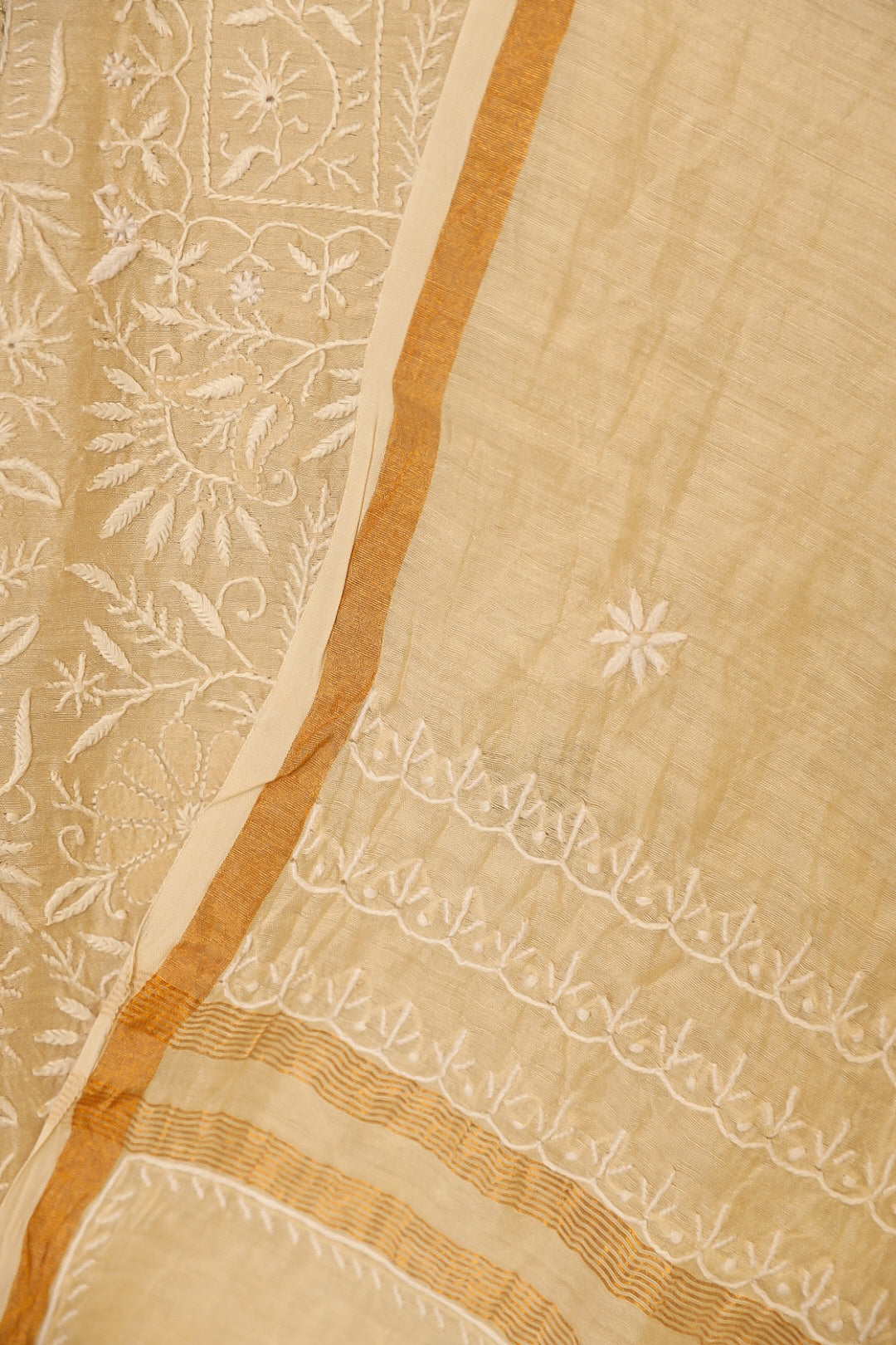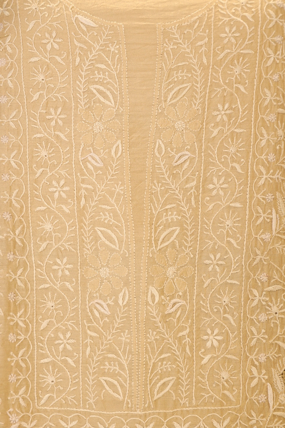 Chikankari is an Art of delicate handwork of Lucknow. It is a handcrafted process where the wooden blocks are manually carved in various designs, and the natural stew for printing is prepared, and printed on the cloth. The chikankari craftsmen then use ten ary of the needlecraft embroidery, and perform the needlework artistically. There are 32 stitches of chikankari broadly classified into Raised stitch, Embossed and Flat stitch.