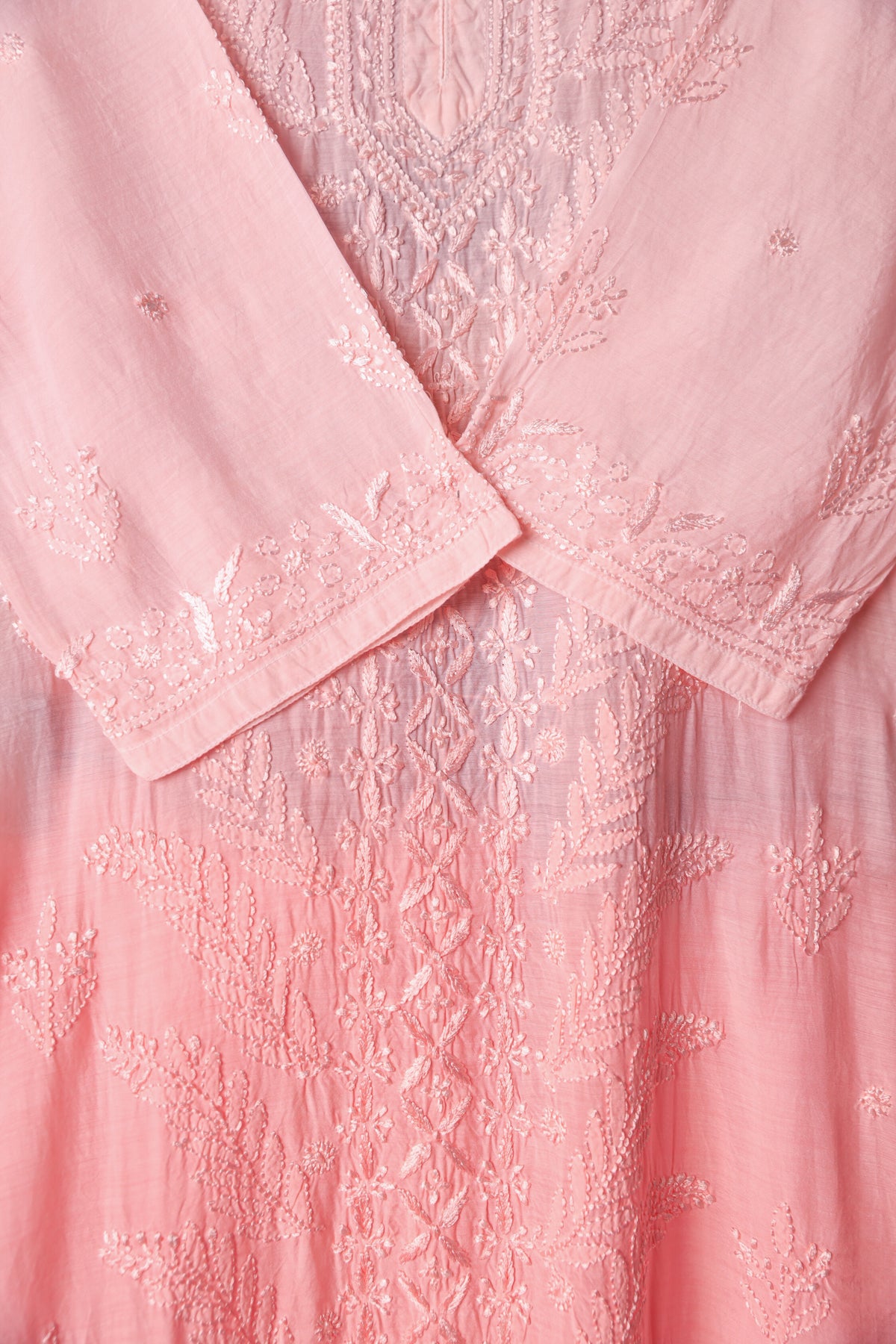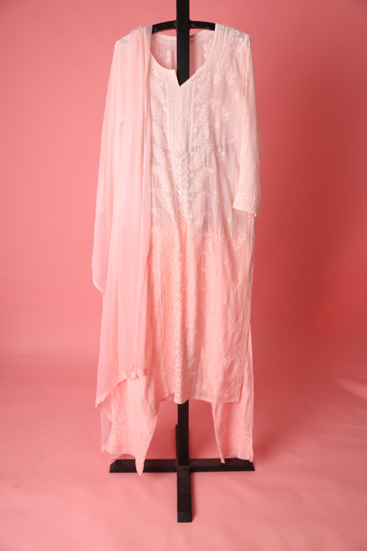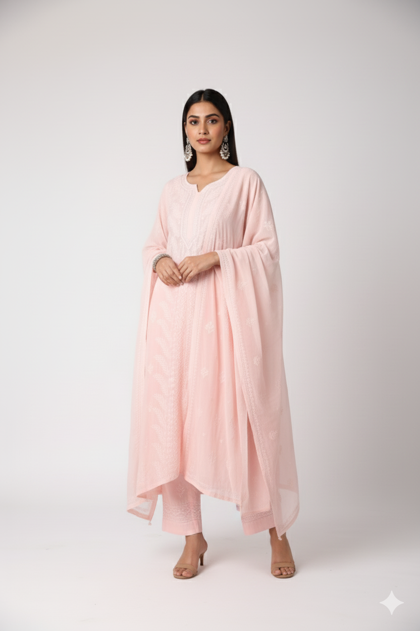 Chikankari is an Art of delicate handwork of Lucknow. It is a handcrafted process where the wooden blocks are manually carved in various designs, and the natural stew for printing is prepared, and printed on the cloth. The chikankari craftsmen then use ten ary of the needlecraft embroidery, and perform the needlework artistically. There are 32 stitches of chikankari broadly classified into Raised stitch, Embossed and Flat stitch.