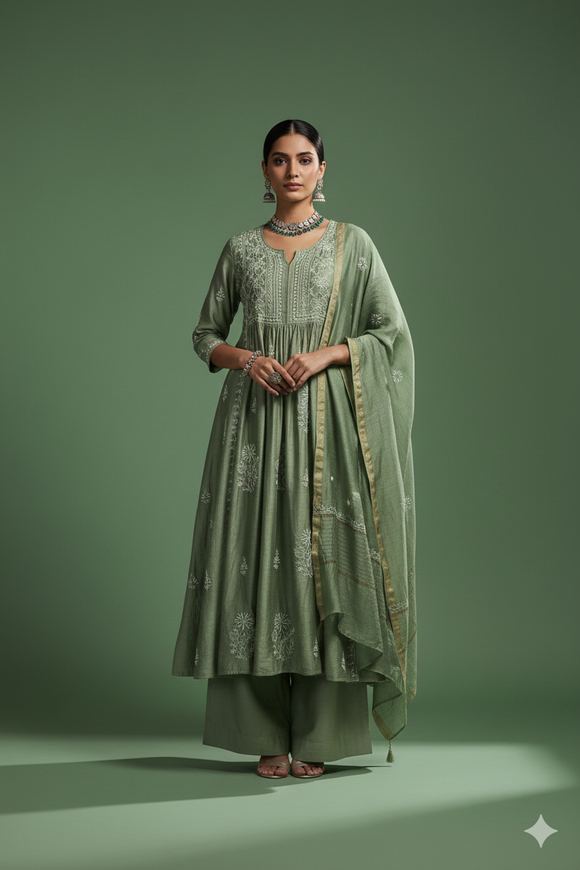 Chikankari is an Art of delicate handwork of Lucknow. It is a handcrafted process where the wooden blocks are manually carved in various designs, and the natural stew for printing is prepared, and printed on the cloth. The chikankari craftsmen then use ten ary of the needlecraft embroidery, and perform the needlework artistically. There are 32 stitches of chikankari broadly classified into Raised stitch, Embossed and Flat stitch.