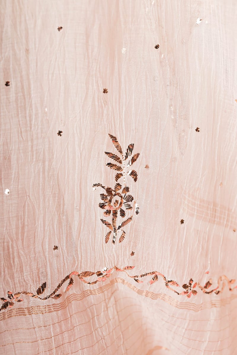 Chikankari is an Art of delicate handwork of Lucknow. It is a handcrafted process where the wooden blocks are manually carved in various designs, and the natural stew for printing is prepared, and printed on the cloth. The chikankari craftsmen then use ten ary of the needlecraft embroidery, and perform the needlework artistically. There are 32 stitches of chikankari broadly classified into Raised stitch, Embossed and Flat stitch.