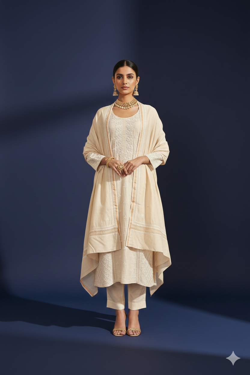 Trivia : Chikankari is an Art of delicate handwork of Lucknow. It is a handcrafted process where the wooden blocks are manually carved in various designs, and the natural stew for printing is prepared, and printed on the cloth. The chikankari craftsmen then use ten ary of the needlecraft embroidery, and perform the needlework artistically. There are 32 stitches of chikankari broadly classified into Raised stitch, Embossed and Flat stitch.