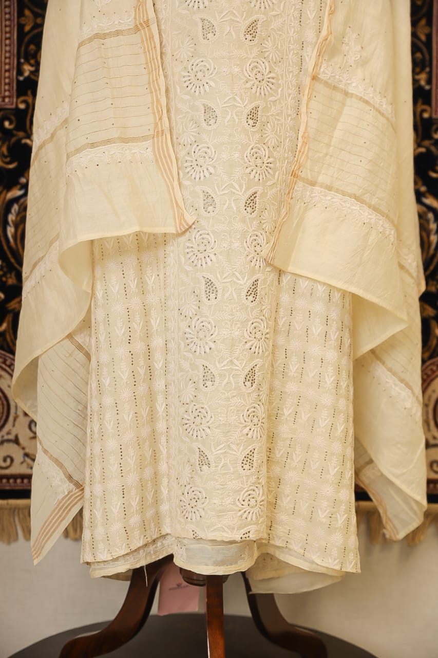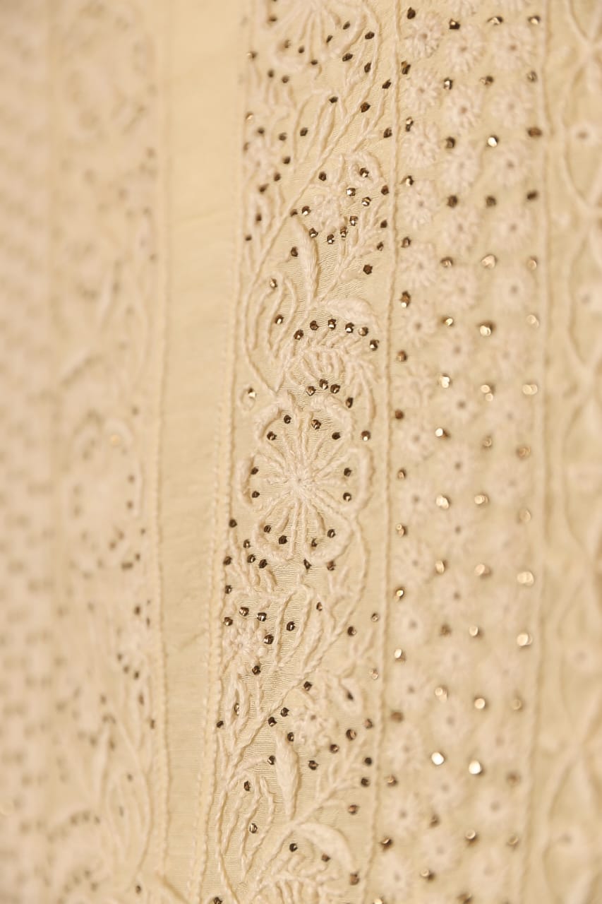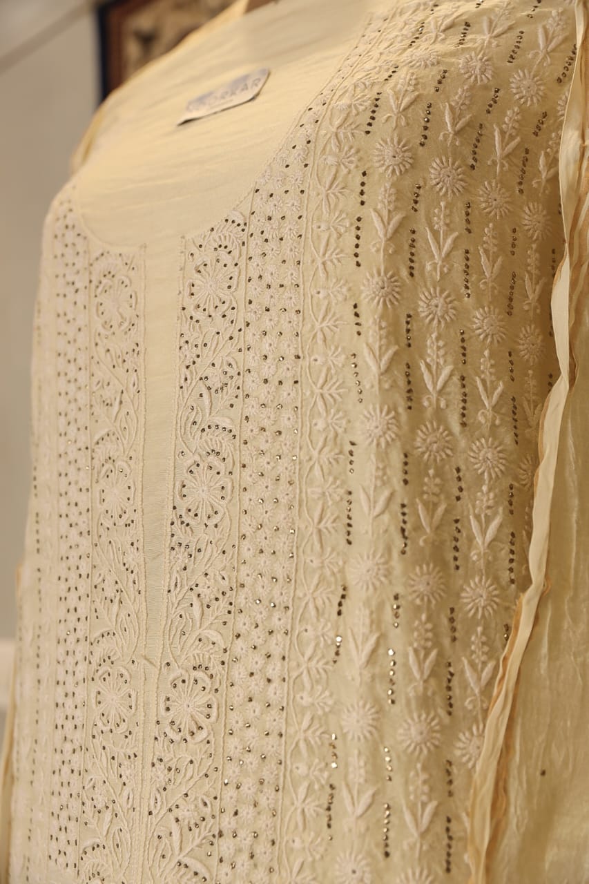 Chikankari is an Art of delicate handwork of Lucknow. It is a handcrafted process where the wooden blocks are manually carved in various designs, and the natural stew for printing is prepared, and printed on the cloth. The chikankari craftsmen then use ten ary of the needlecraft embroidery, and perform the needlework artistically. There are 32 stitches of chikankari broadly classified into Raised stitch, Embossed and Flat stitch.