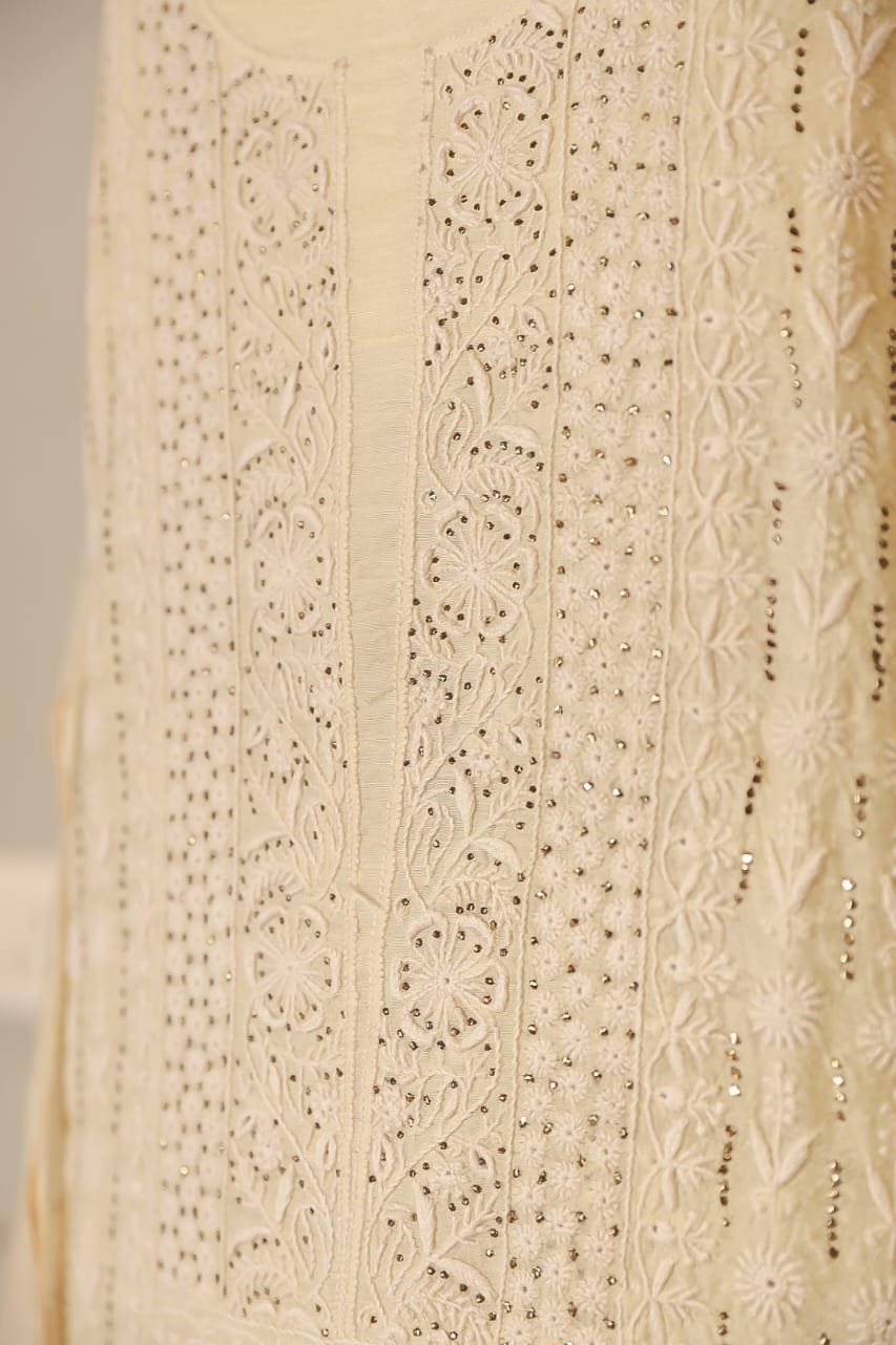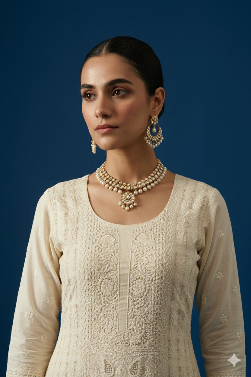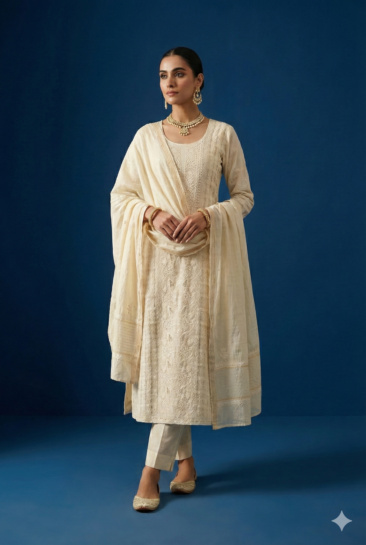 Chikankari is an Art of delicate handwork of Lucknow. It is a handcrafted process where the wooden blocks are manually carved in various designs, and the natural stew for printing is prepared, and printed on the cloth. The chikankari craftsmen then use ten ary of the needlecraft embroidery, and perform the needlework artistically. There are 32 stitches of chikankari broadly classified into Raised stitch, Embossed and Flat stitch.