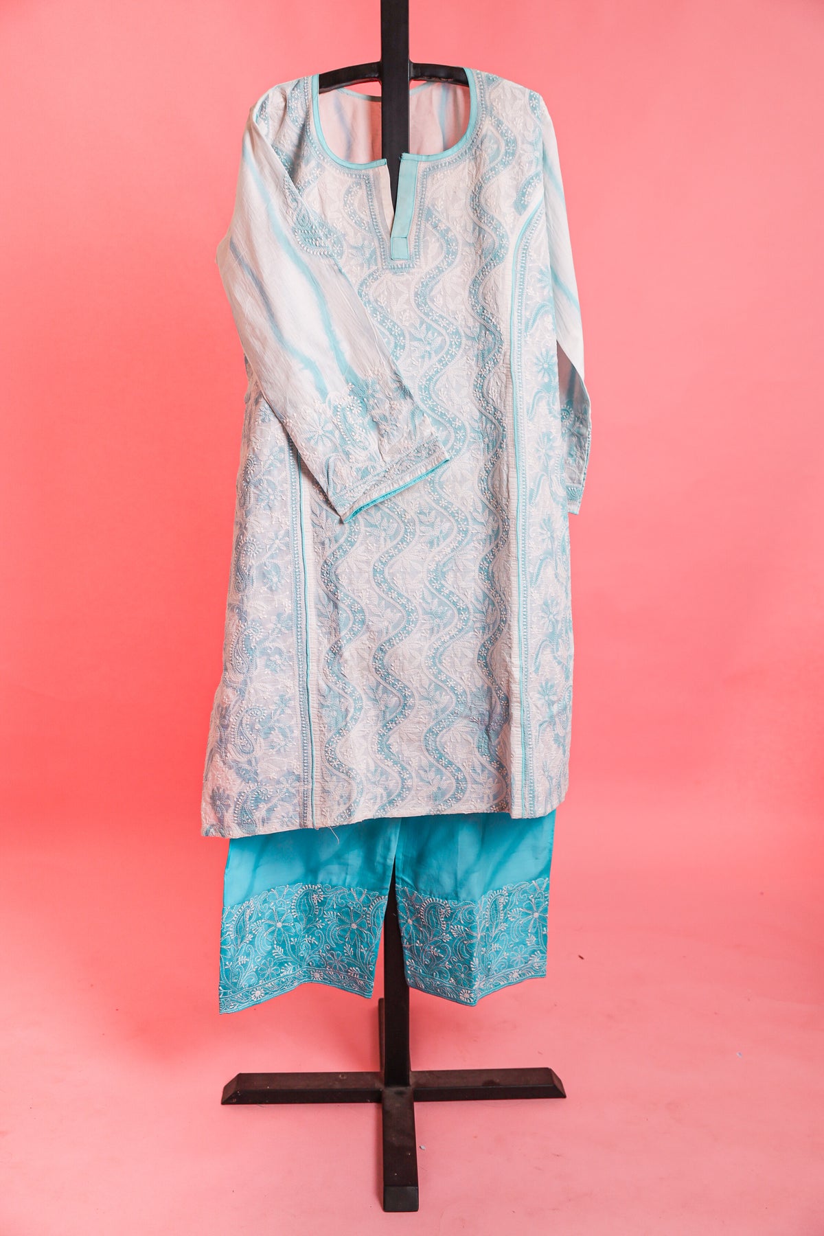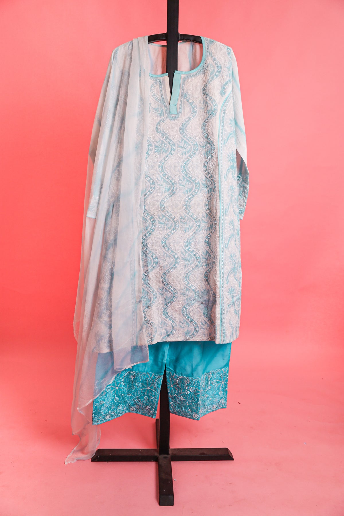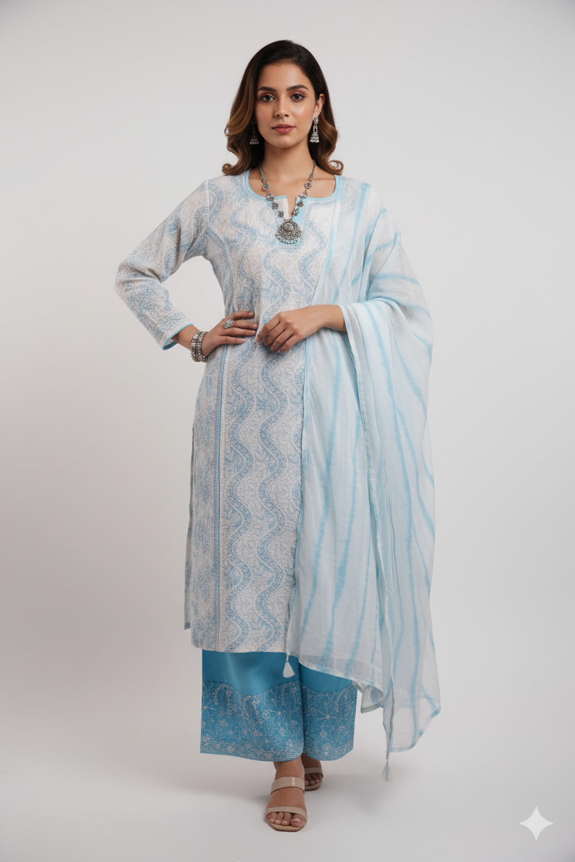 Chikankari is an Art of delicate handwork of Lucknow. It is a handcrafted process where the wooden blocks are manually carved in various designs, and the natural stew for printing is prepared, and printed on the cloth. The chikankari craftsmen then use ten ary of the needlecraft embroidery, and perform the needlework artistically. There are 32 stitches of chikankari broadly classified into Raised stitch, Embossed and Flat stitch.