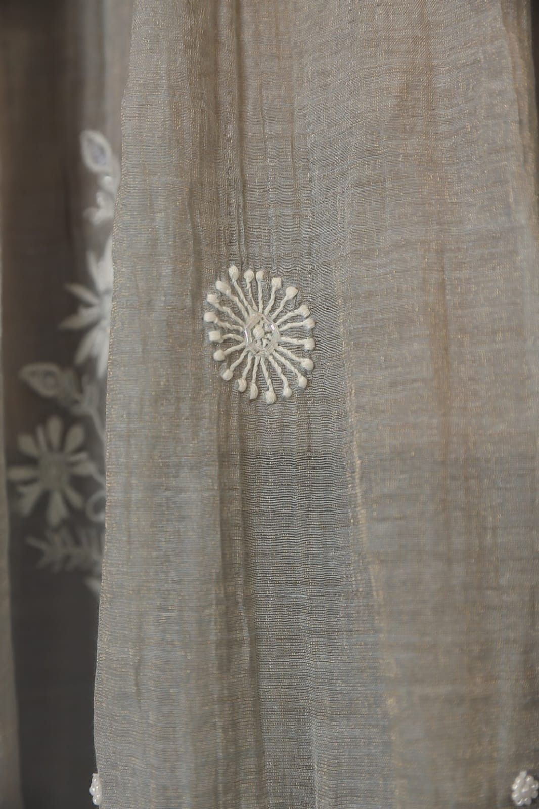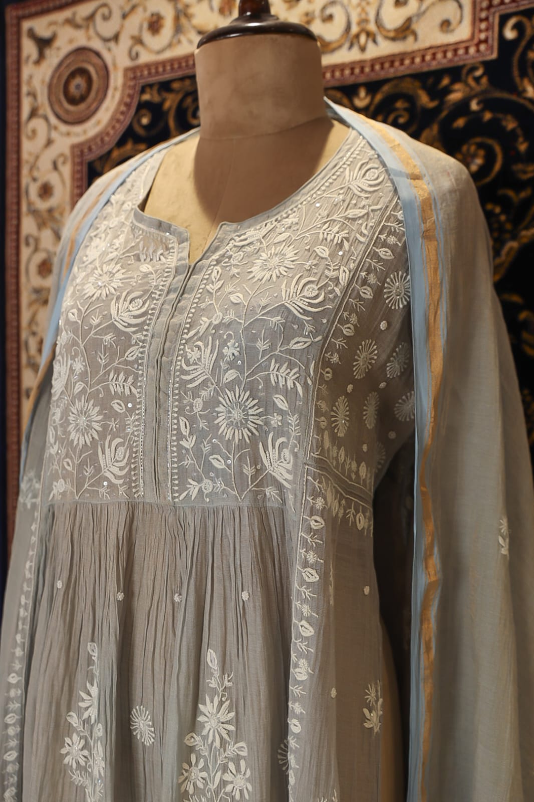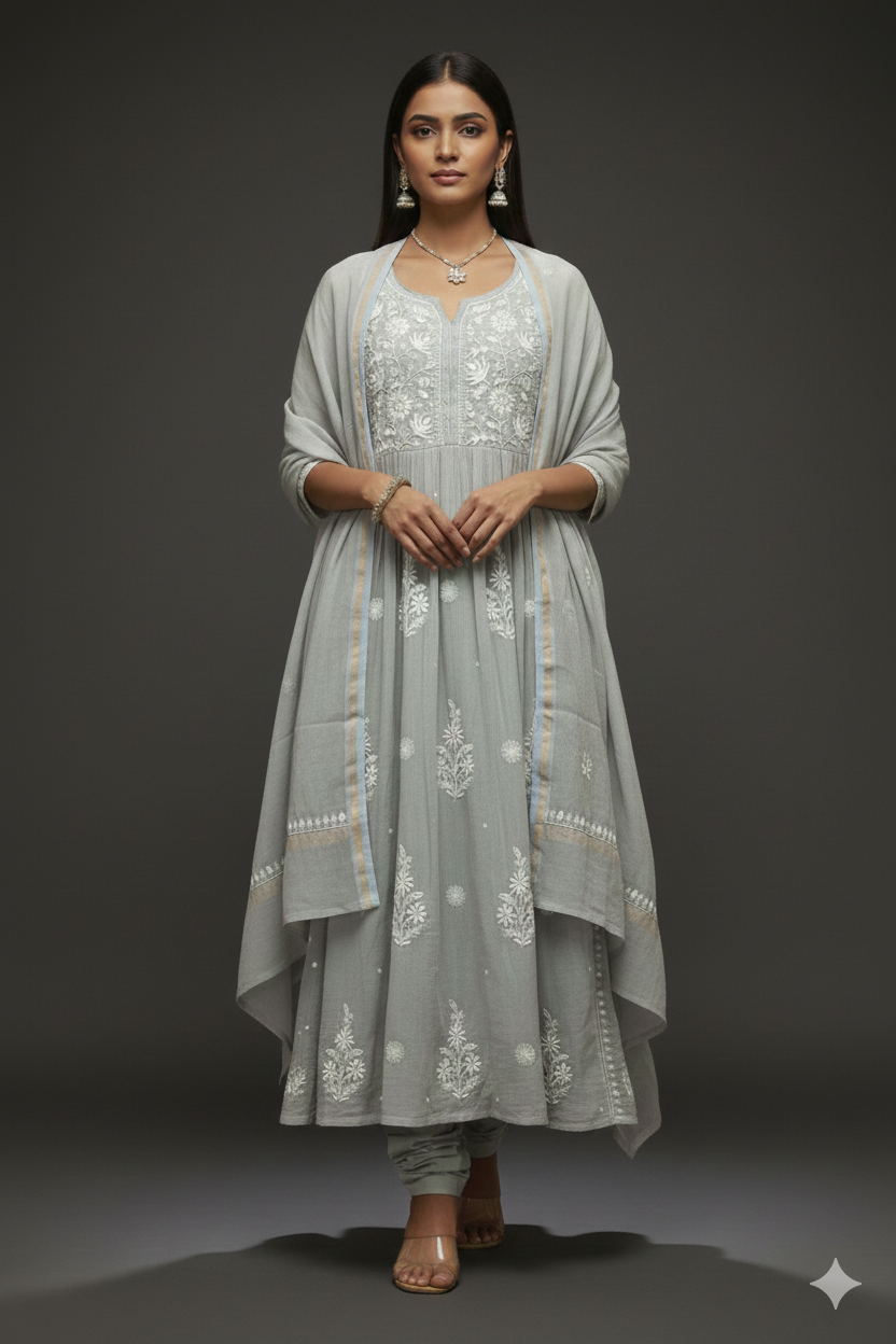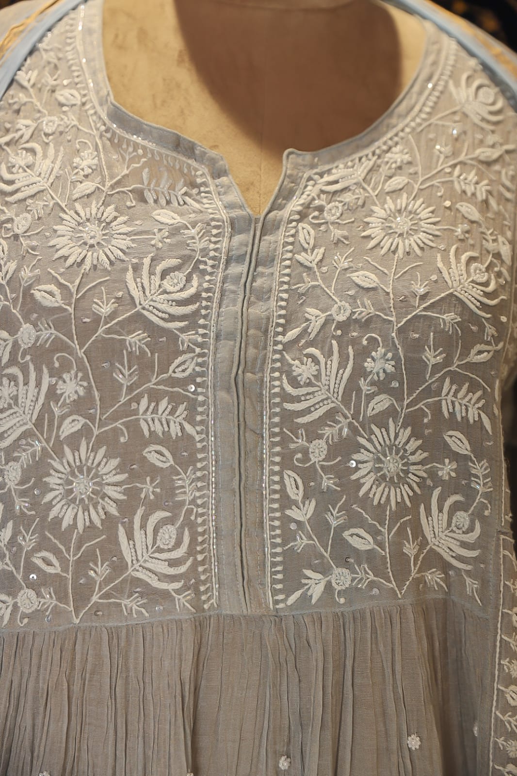 Chikankari is an Art of delicate handwork of Lucknow. It is a handcrafted process where the wooden blocks are manually carved in various designs, and the natural stew for printing is prepared, and printed on the cloth. The chikankari craftsmen then use ten ary of the needlecraft embroidery, and perform the needlework artistically. There are 32 stitches of chikankari broadly classified into Raised stitch, Embossed and Flat stitch.