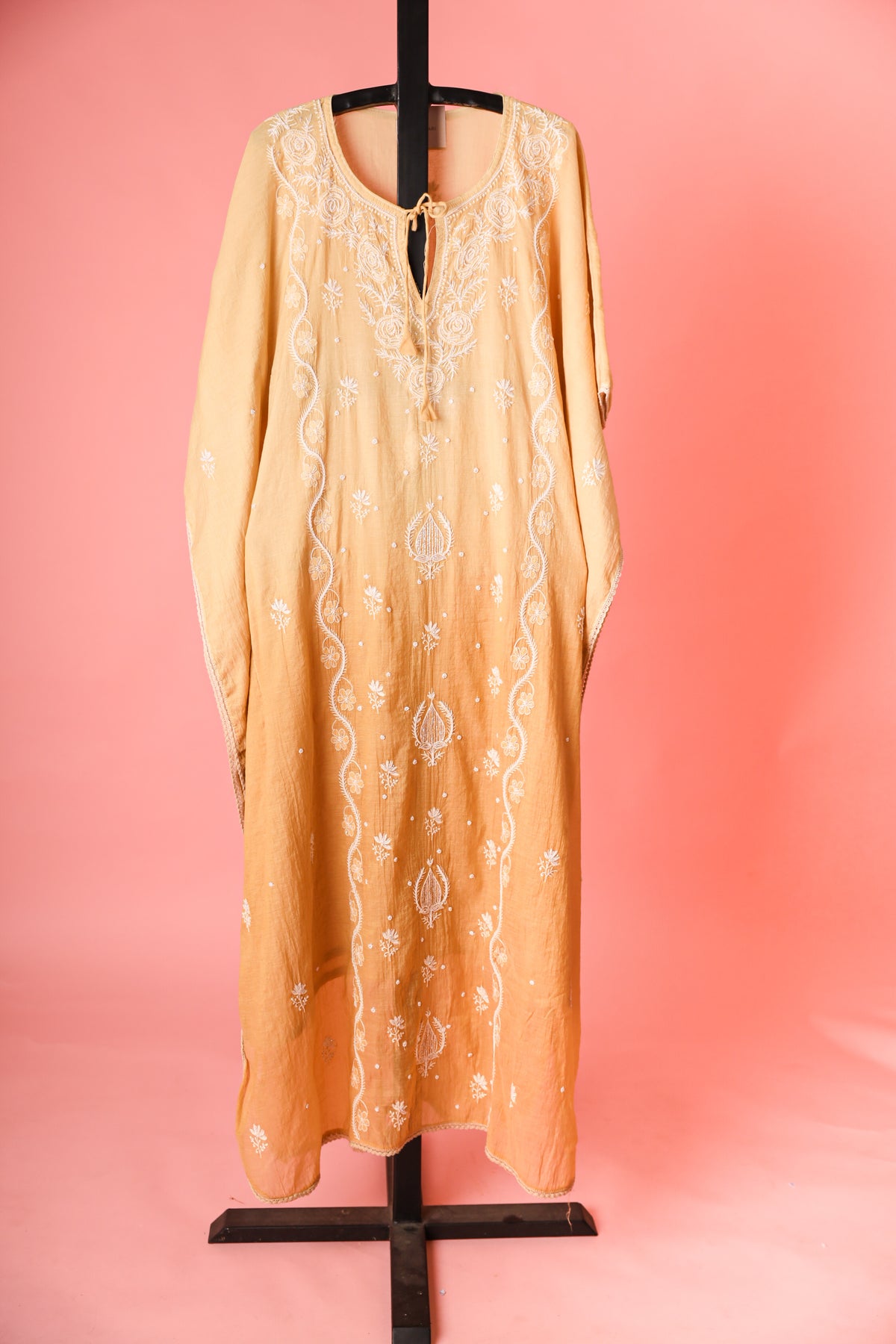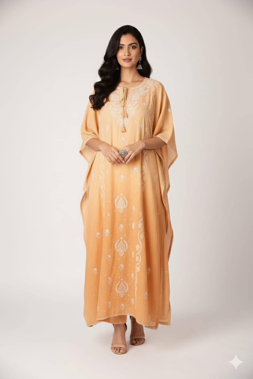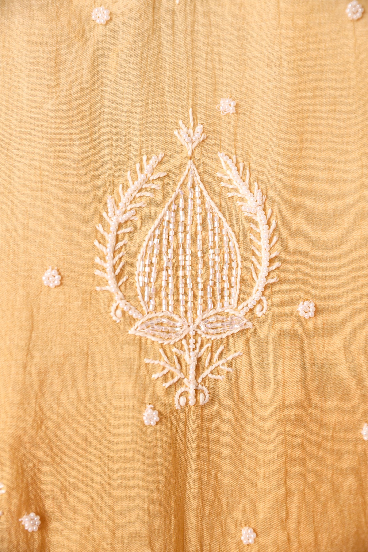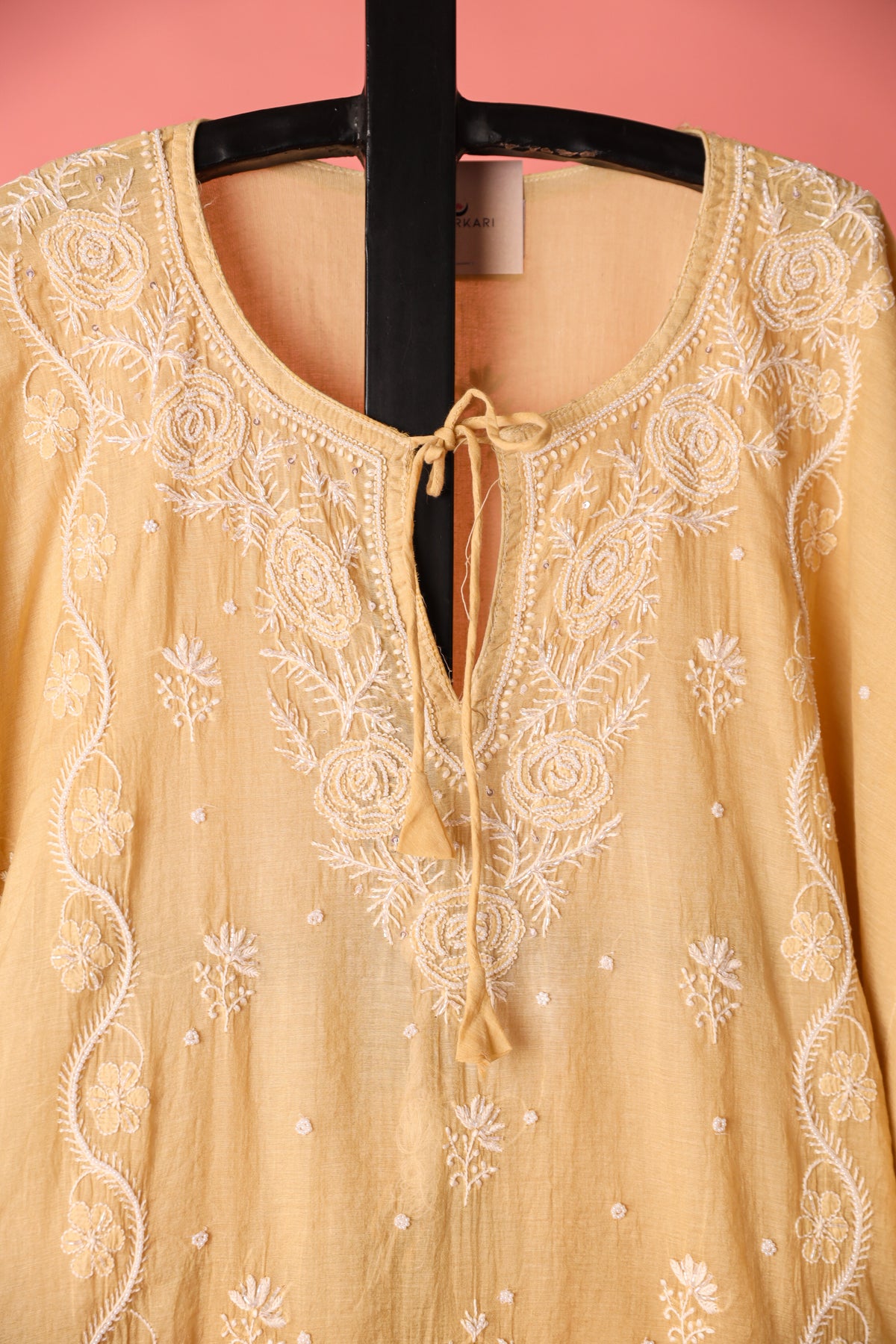 Chikankari is an Art of delicate handwork of Lucknow. It is a handcrafted process where the wooden blocks are manually carved in various designs, and the natural stew for printing is prepared, and printed on the cloth. The chikankari craftsmen then use ten ary of the needlecraft embroidery, and perform the needlework artistically. There are 32 stitches of chikankari broadly classified into Raised stitch, Embossed and Flat stitch.
