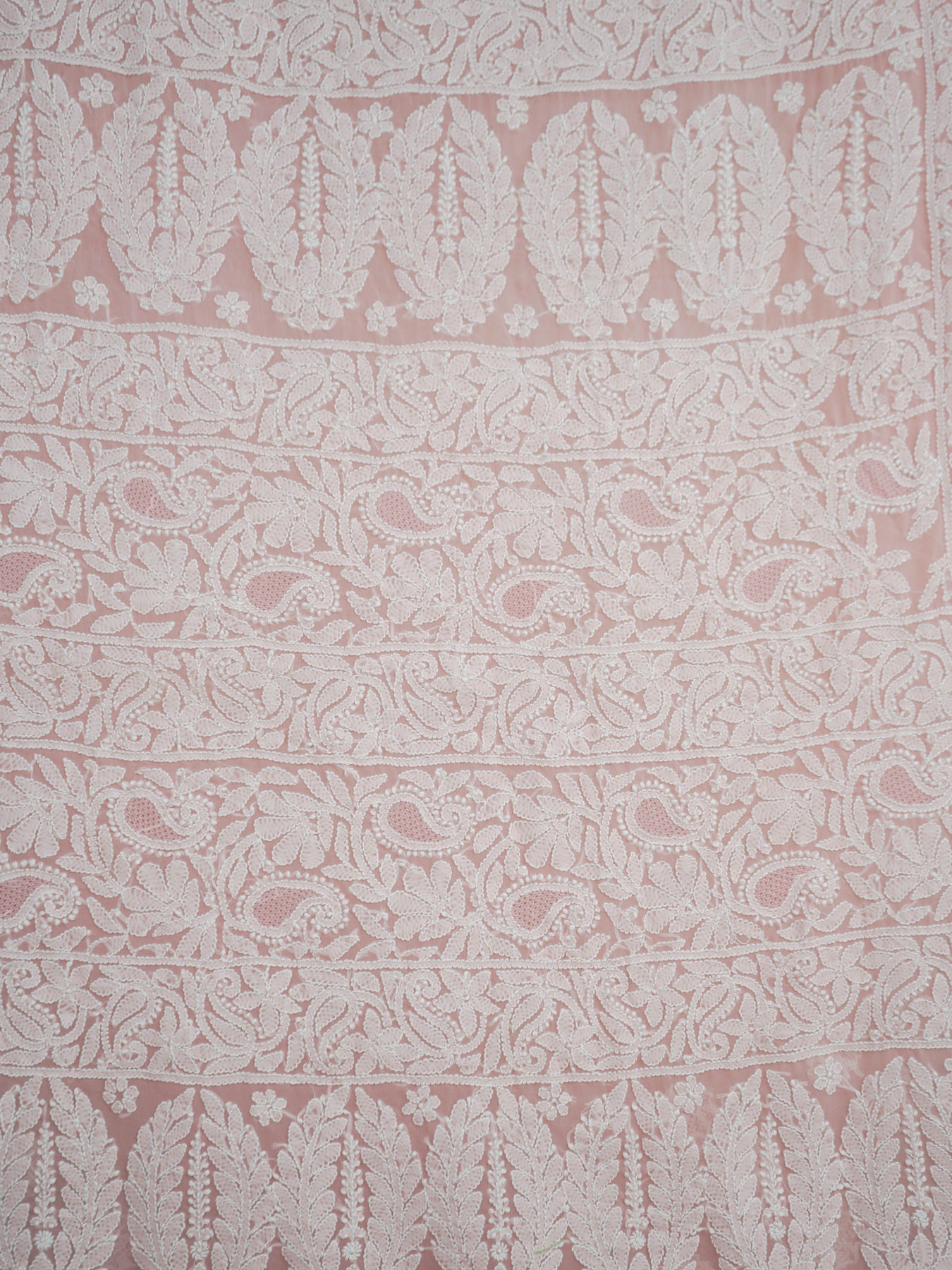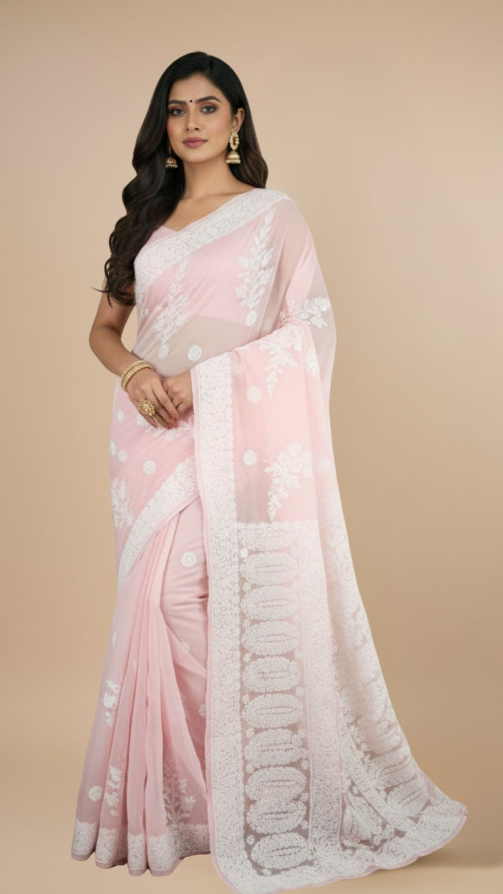 Length : 6.5 meters Height : 44 inches Blouse Fabric : 1 meters Thread : Type : Cotton Embroidery :100% hand embroidered Embellishments : None Occasion : Daily Wear Washing instructions : Dry Clean Storage instructions : Use muslin bags to safeguard your sarees Trivia : Chikankari is an Art of delicate handwork of Lucknow. It is a handcrafted process where the wooden blocks are manually carved in various designs, and the natural stew for printing is prepared, and printed on the cloth. The chikankari craftsmen then use ten ary of the needlecraft embroidery, and perform the needlework artistically. There are 32 stitches of chikankari broadly classified into Raised stitch, Embossed and Flat stitch. Time Period Of Handmade- It took 2 to 3 months for the product to be handcrafted from designing to finishing. Disclaimer : There might be a 10-15% difference in colour due to high screen resolution. Therefore, exchanges due to colour difference is not acceptable Misspelled : Nurkari, Noorkaree, Nurkaari, Noorkary, Noor-Kari
