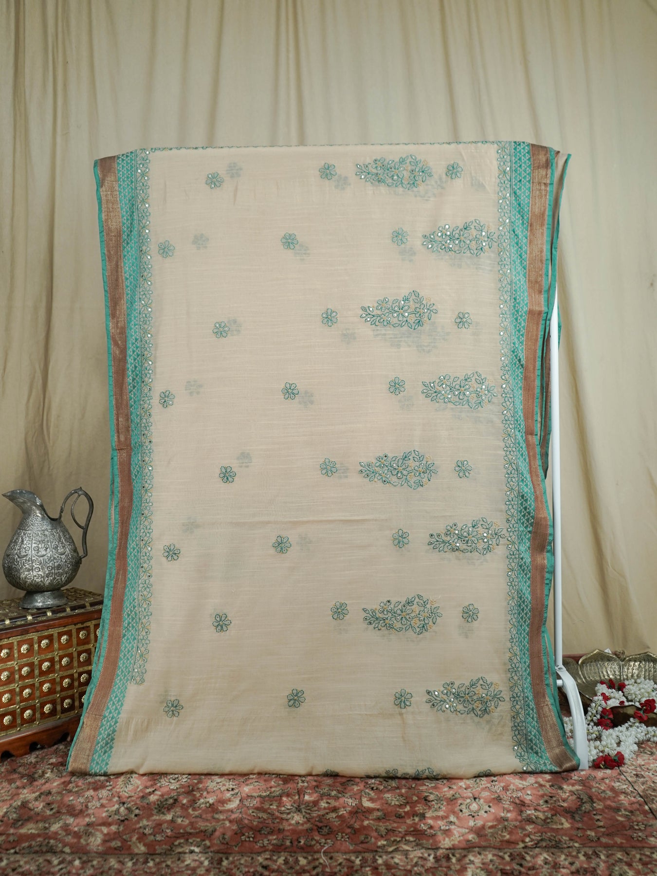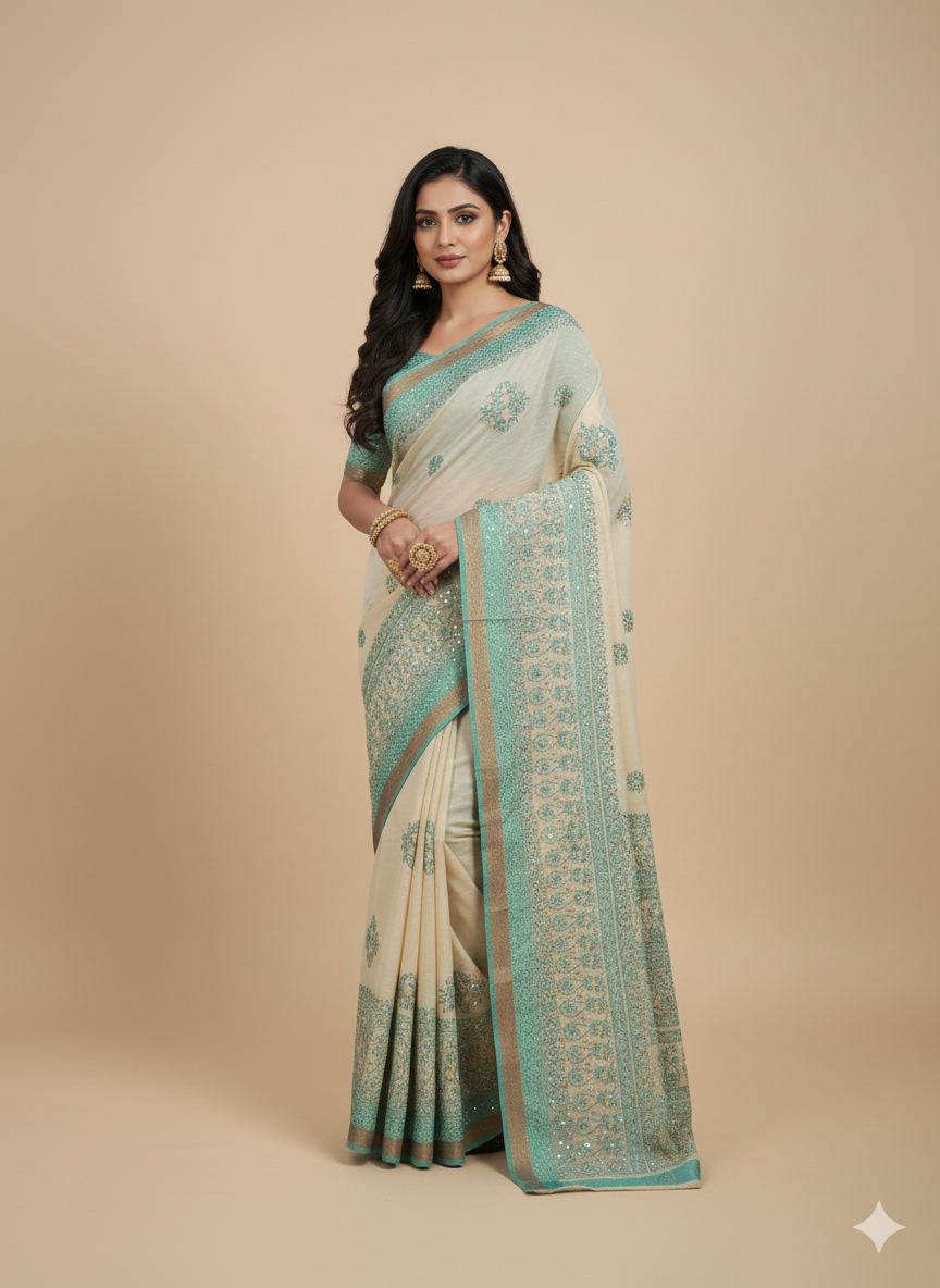 Fabric : BANARSI ZARI Length : 6.5 metres Height : 44 inches Blouse Fabric : 1 metre Thread : Type : Cotton Embroidery :100% hand embroidered Embellishments : Mukaish Occasion : Festive/Wedding/Daily wear Washing instructions : Dry Clean Storage instructions : Use muslin bags to safeguard your sarees Trivia : Chikankari is an Art of delicate handwork of Lucknow. It is a handcrafted process where the wooden blocks are manually carved in various designs, and the natural stew for printing is prepared, and printed on the cloth. The chikankari craftsmen then use ten ary of the needlecraft embroidery, and perform the needlework artistically. There are 32 stitches of chikankari broadly classified into Raised stitch, Embossed and Flat stitch. Time Period Of Handmade- It took 2 to 3 months for the product to be handcrafted from designing to finishing. Disclaimer : There might be a 10-15% difference in colour due to high screen resolution. Therefore, exchanges due to colour difference is not acceptable Misspelled : Nurkari, Noorkaree, Nurkaari, Noorkary, Noor-Kari