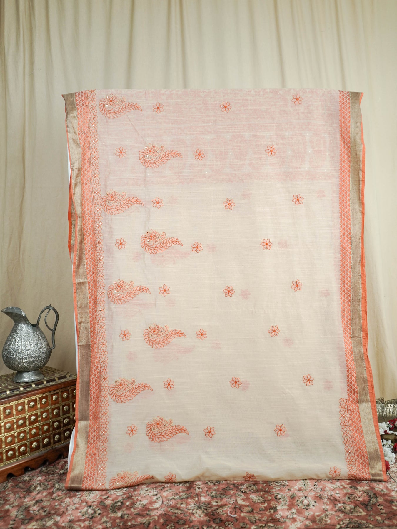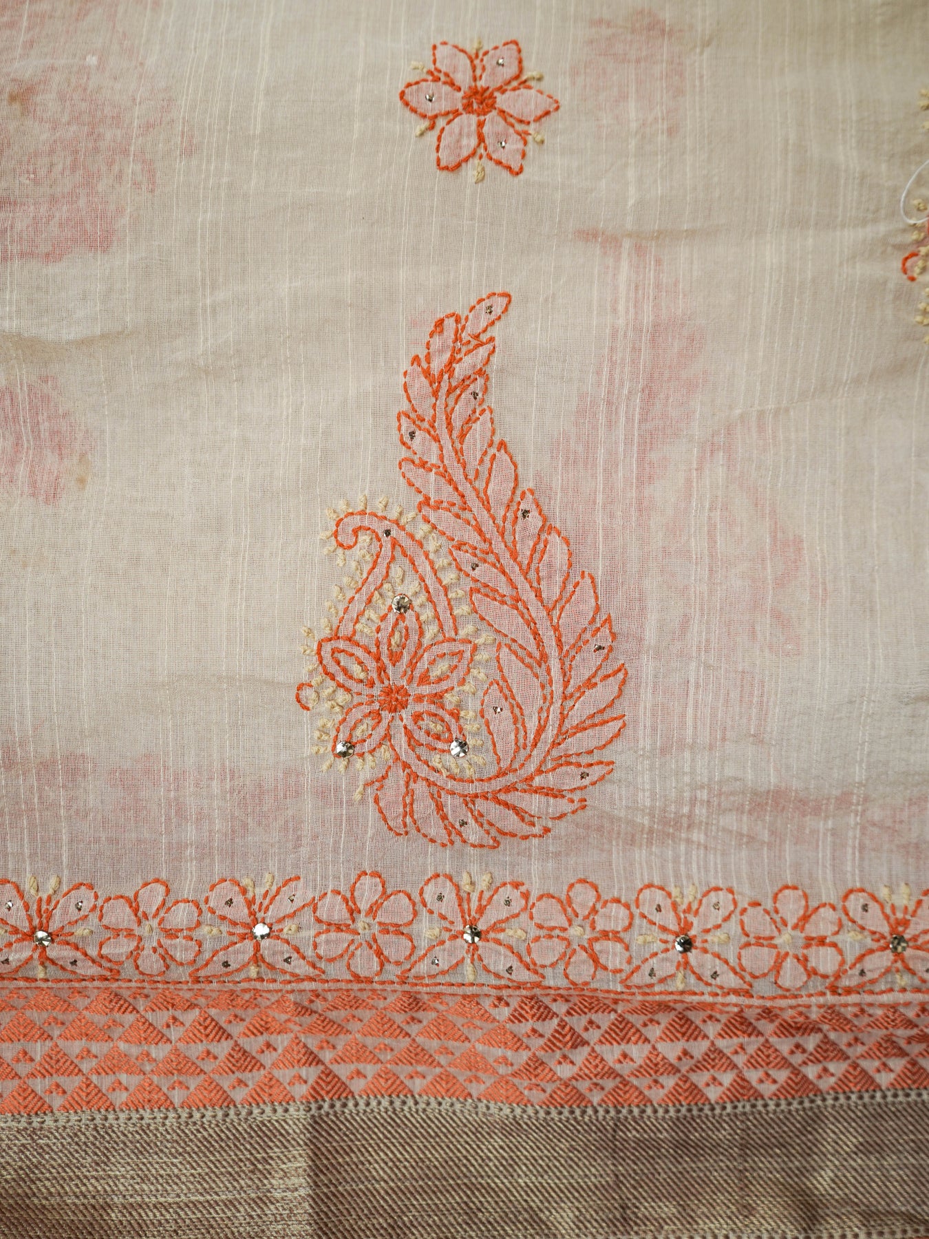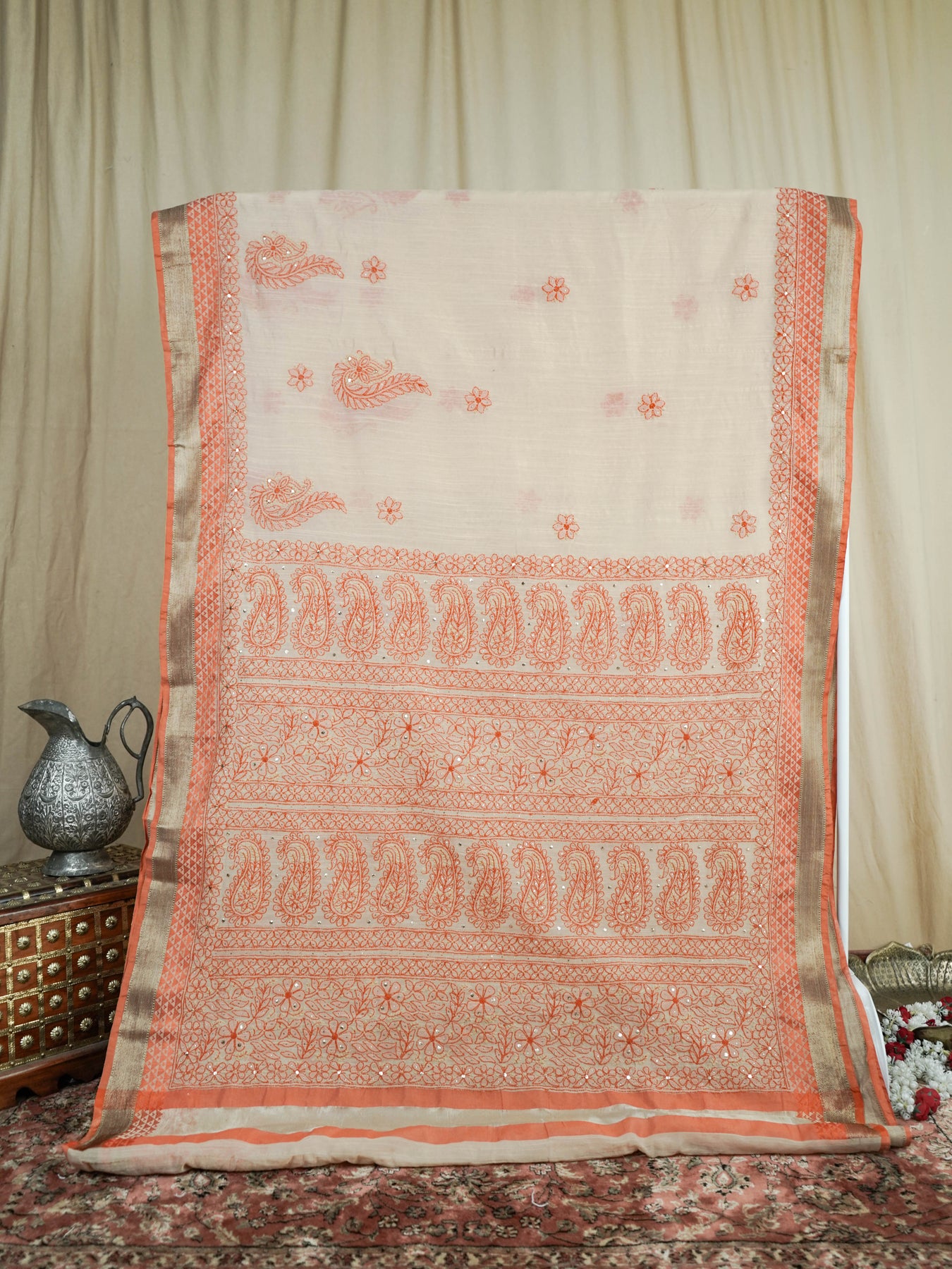 Fabric : BANARSI ZARI Length : 6.5 metres Height : 44 inches Blouse Fabric : 1 metre Thread : Type : Cotton Embroidery :100% hand embroidered Embellishments : NONE Occasion : Festive/Wedding/Daily wear Washing instructions : Dry Clean Storage instructions : Use muslin bags to safeguard your sarees Trivia : Chikankari is an Art of delicate handwork of Lucknow. It is a handcrafted process where the wooden blocks are manually carved in various designs, and the natural stew for printing is prepared, and printed on the cloth. The chikankari craftsmen then use ten ary of the needlecraft embroidery, and perform the needlework artistically. There are 32 stitches of chikankari broadly classified into Raised stitch, Embossed and Flat stitch. Time Period Of Handmade- It took 2 to 3 months for the product to be handcrafted from designing to finishing. Disclaimer : There might be a 10-15% difference in colour due to high screen resolution. Therefore, exchanges due to colour difference is not acceptable Misspelled : Nurkari, Noorkaree, Nurkaari, Noorkary, Noor-Kari