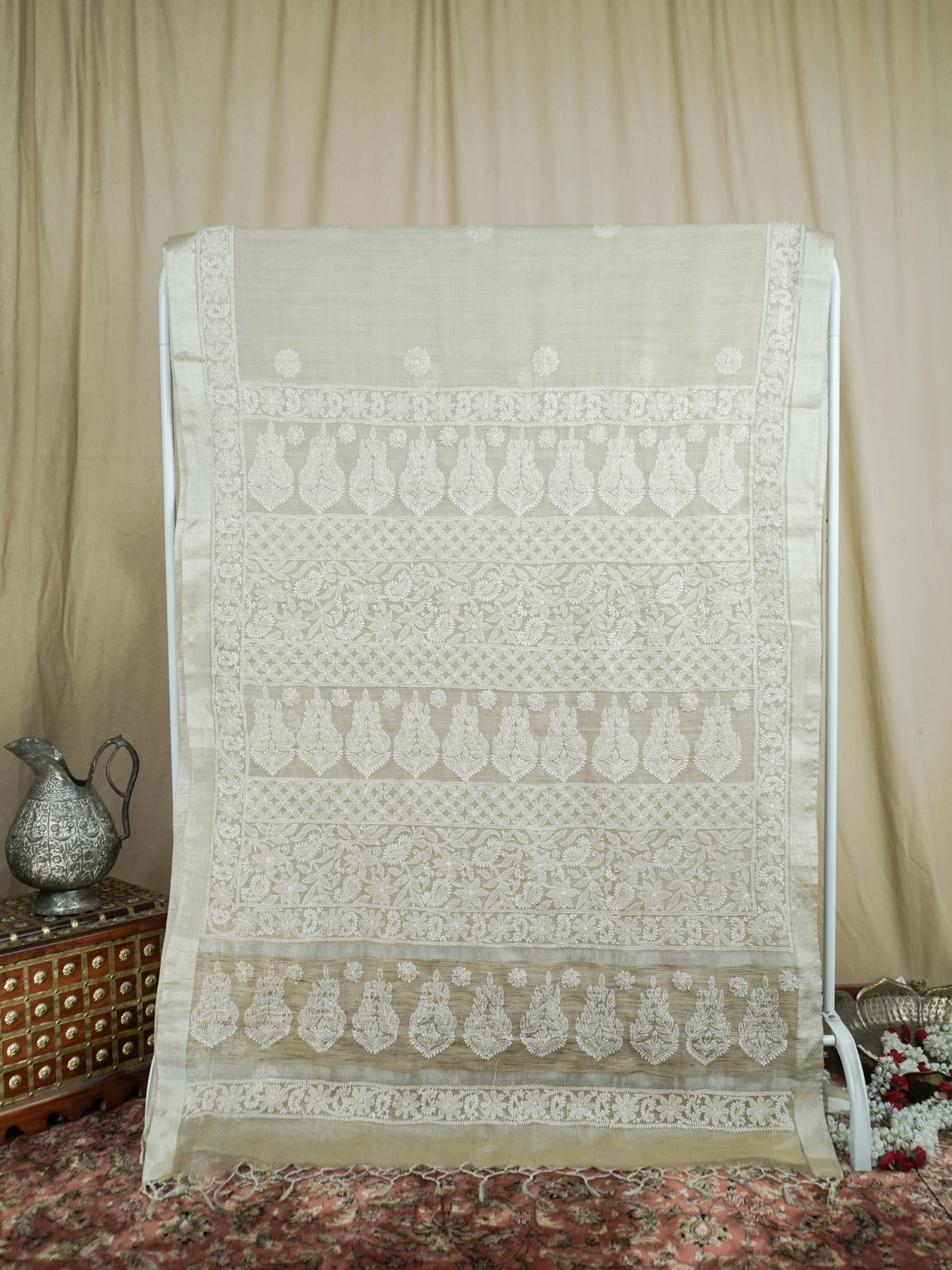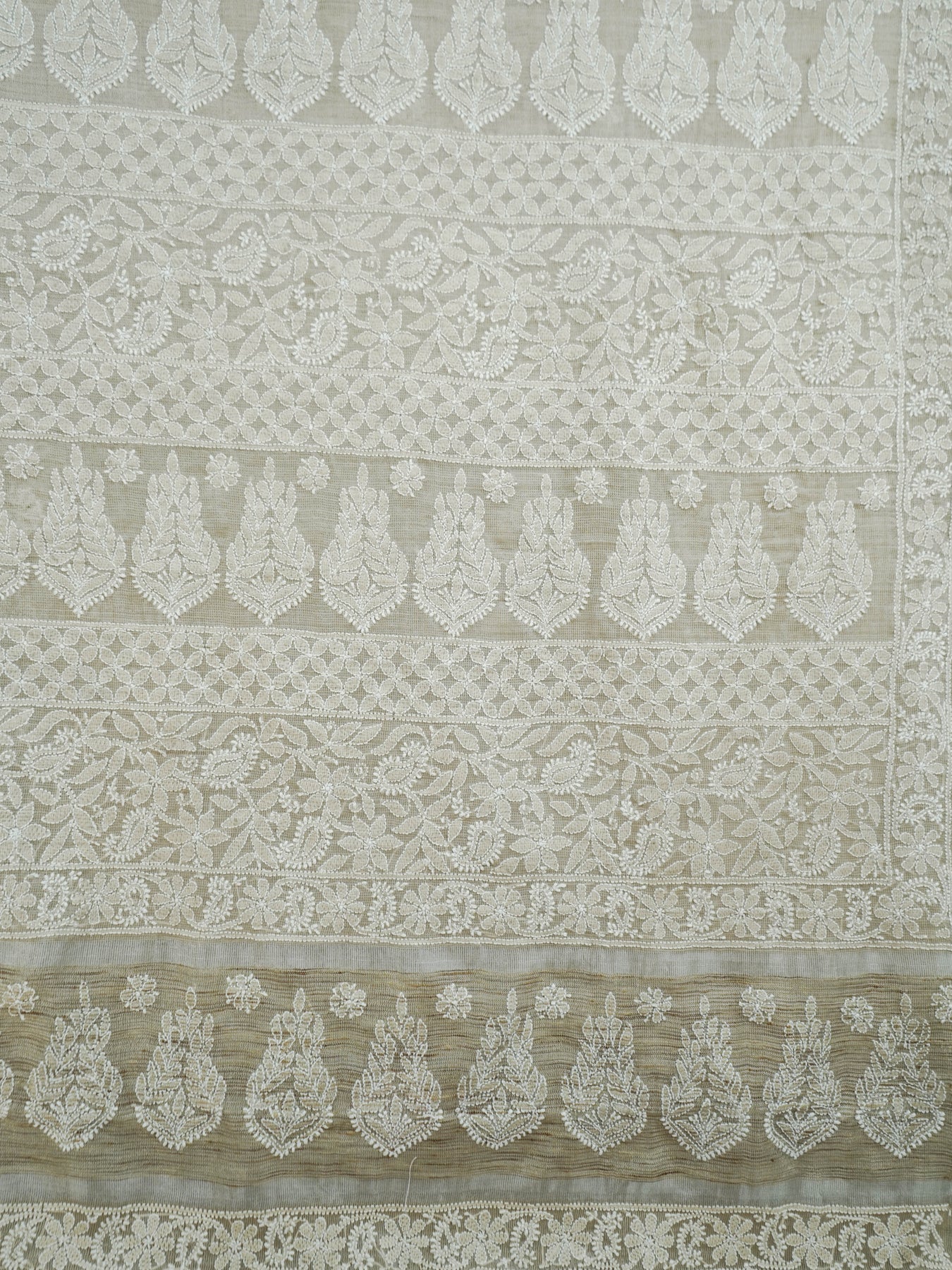 Chikankari is an Art of delicate handwork of Lucknow. It is a handcrafted process where the wooden blocks are manually carved in various designs, and the natural stew for printing is prepared, and printed on the cloth. The chikankari craftsmen then use ten ary of the needlecraft embroidery, and perform the needlework artistically. There are 32 stitches of chikankari broadly classified into Raised stitch, Embossed and Flat stitch.