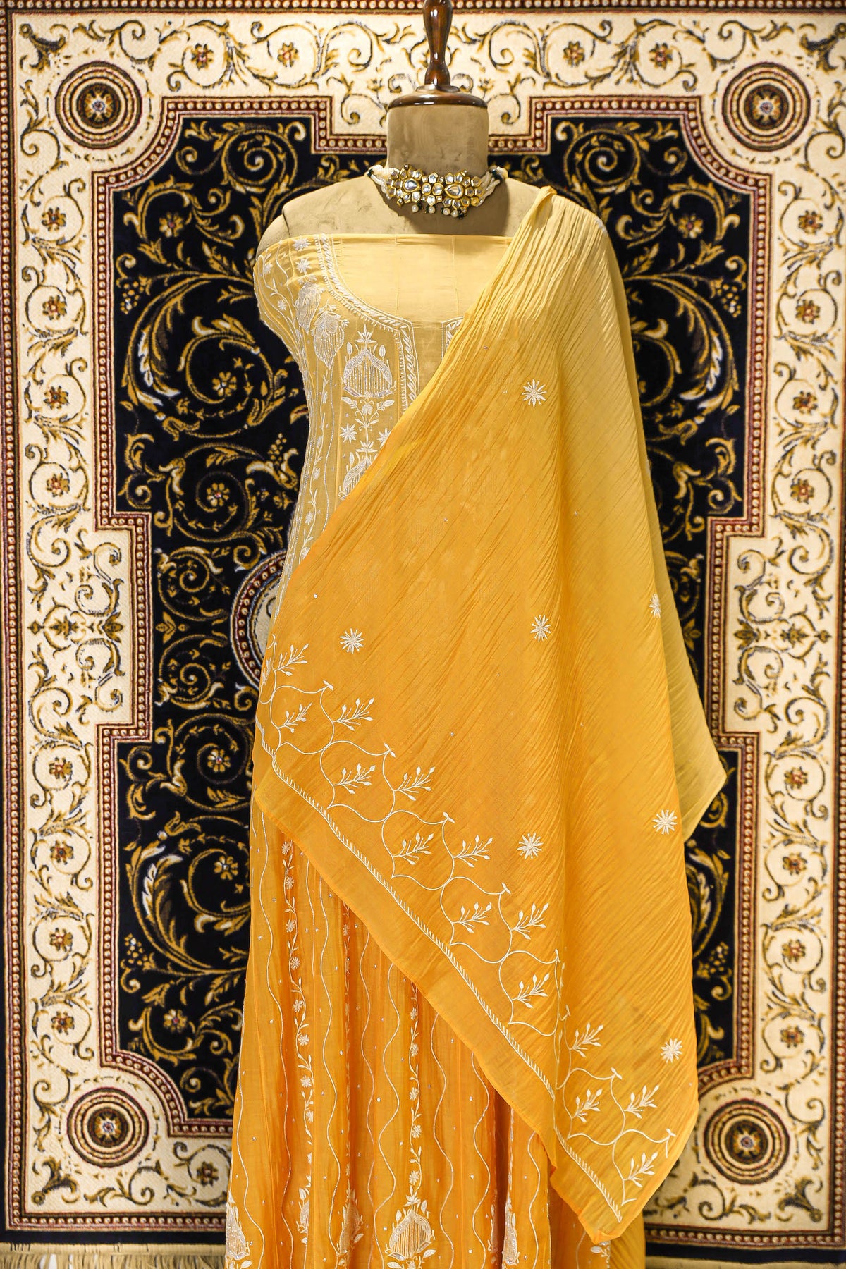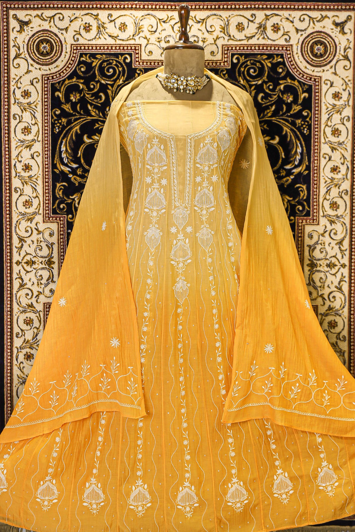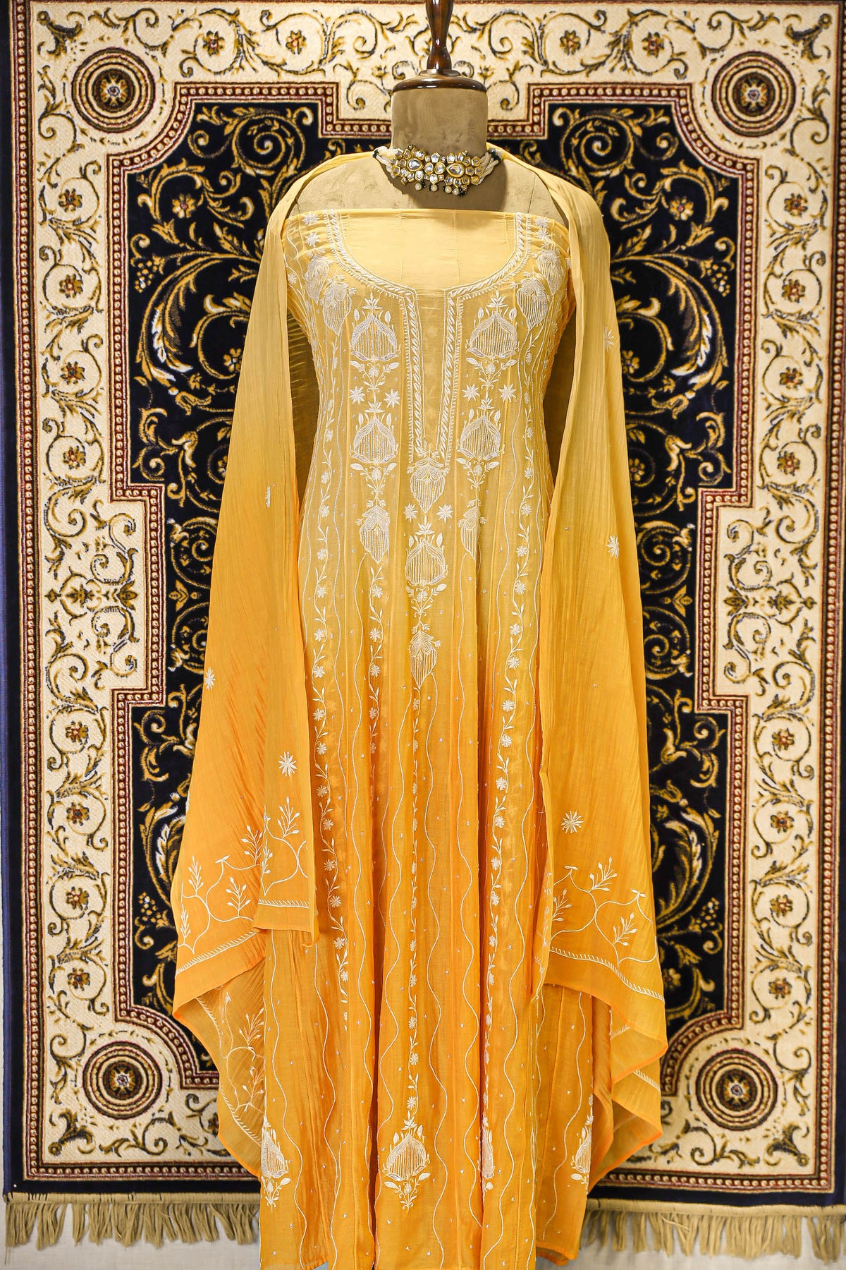 Chikankari is an Art of delicate handwork of Lucknow. It is a handcrafted process where the wooden blocks are manually carved in various designs, and the natural stew for printing is prepared, and printed on the cloth. The chikankari craftsmen then use ten ary of the needlecraft embroidery, and perform the needlework artistically. There are 32 stitches of chikankari broadly classified into Raised stitch, Embossed and Flat stitch.