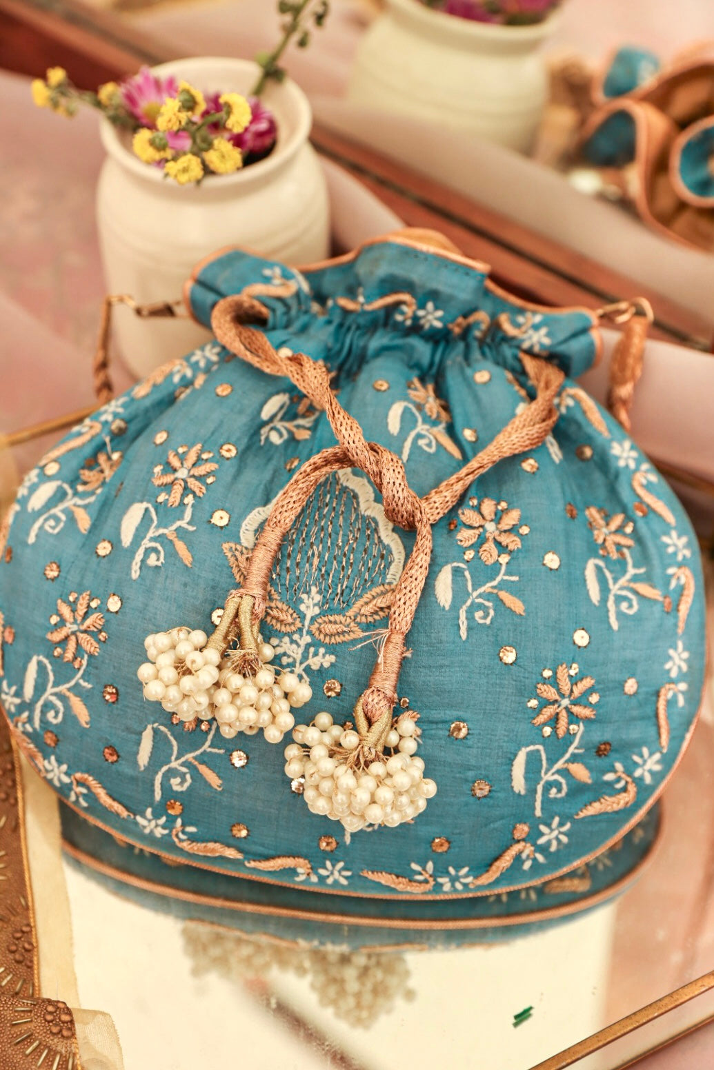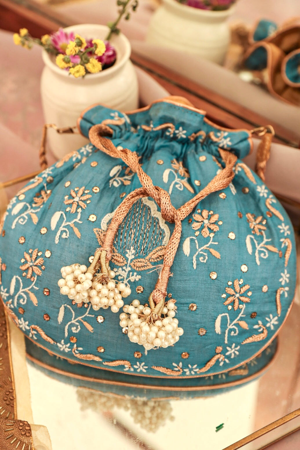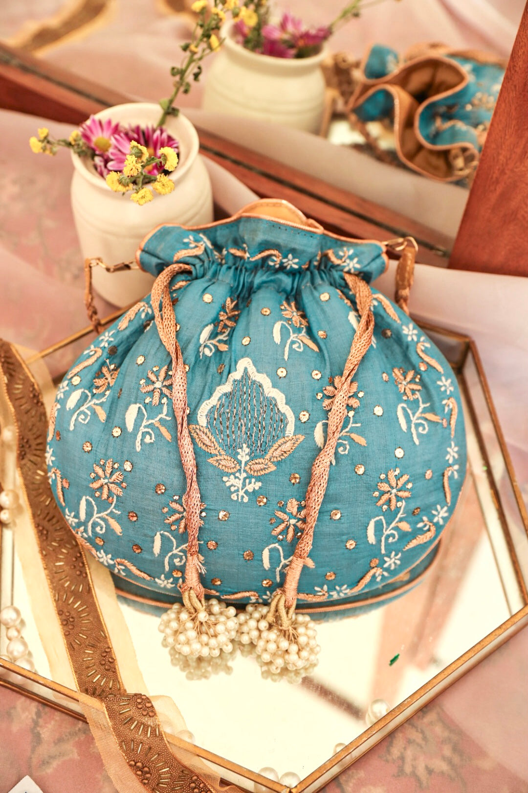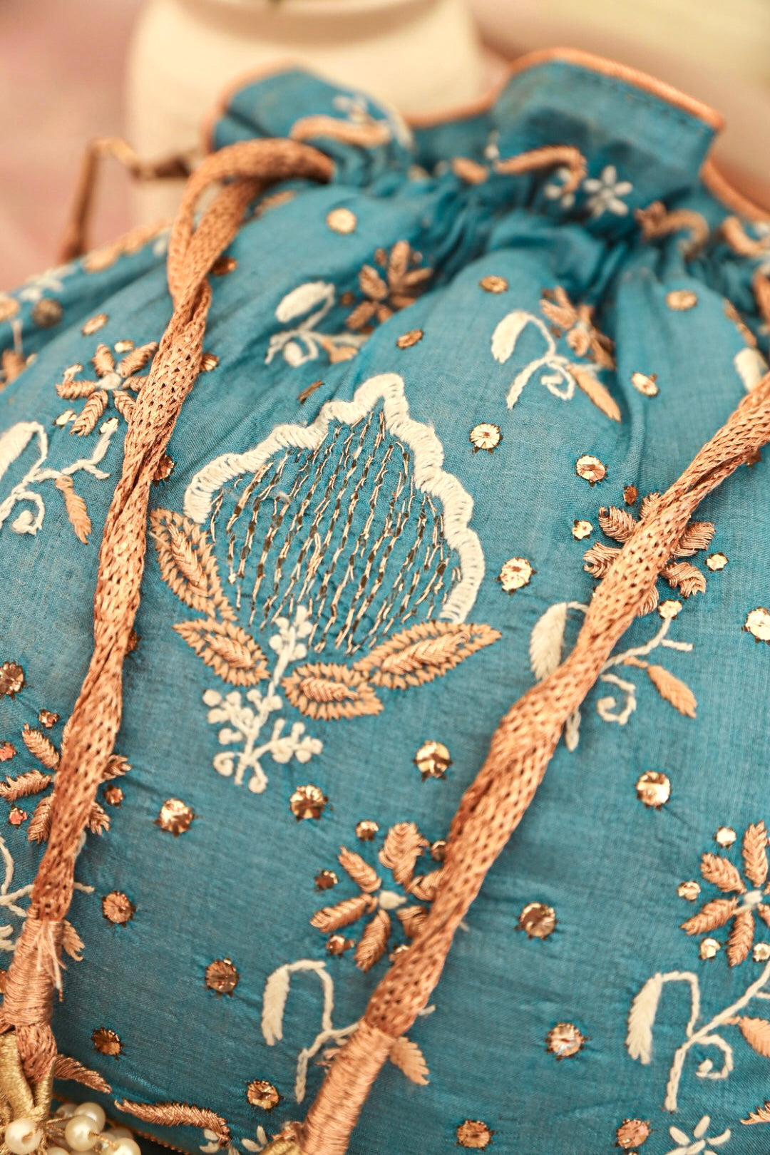 Embrace the exquisiteness of being bold and rediscover who you are! Craft new stories, cherish the love of being timeless! Inner: From the inside, the material used in potli is the silk foam. It gives a superior finish to the batua.