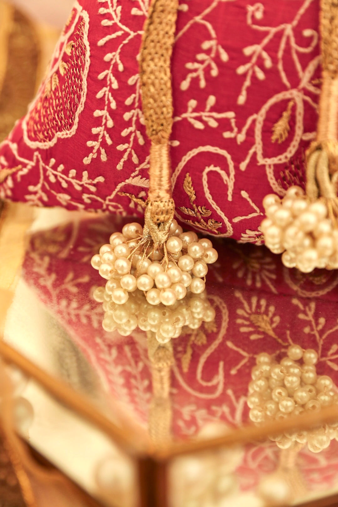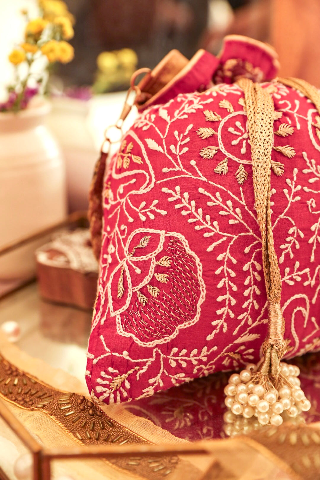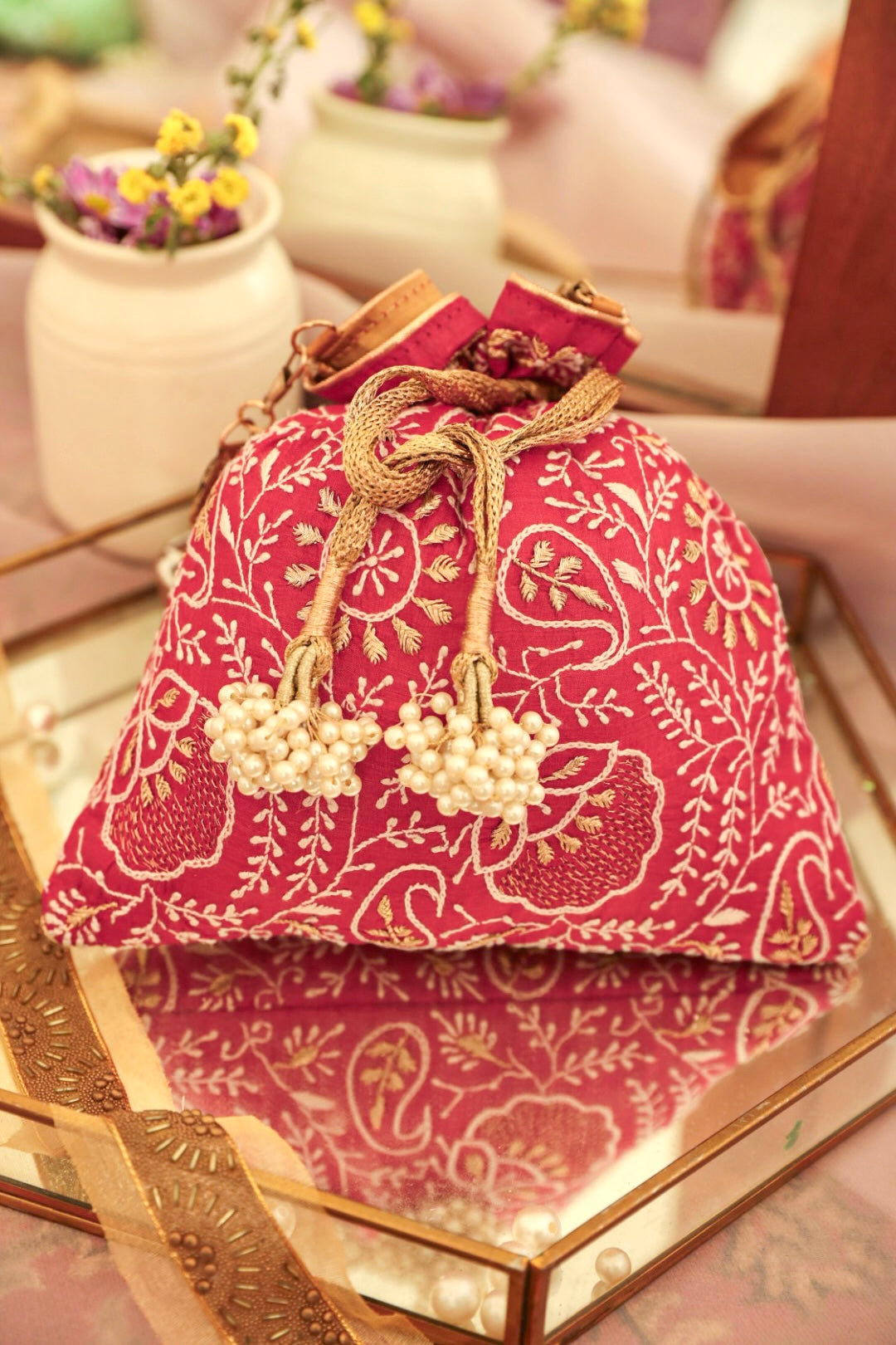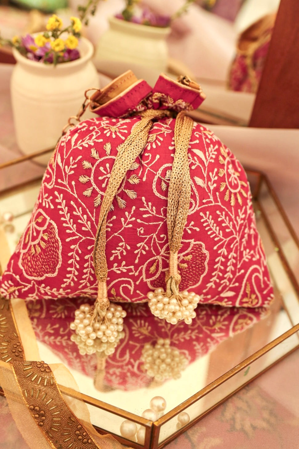 Embrace the exquisiteness of being bold and rediscover who you are! Craft new stories, cherish the love of being timeless! Inner: From the inside, the material used in potli is the silk foam. It gives a superior finish to the polti.