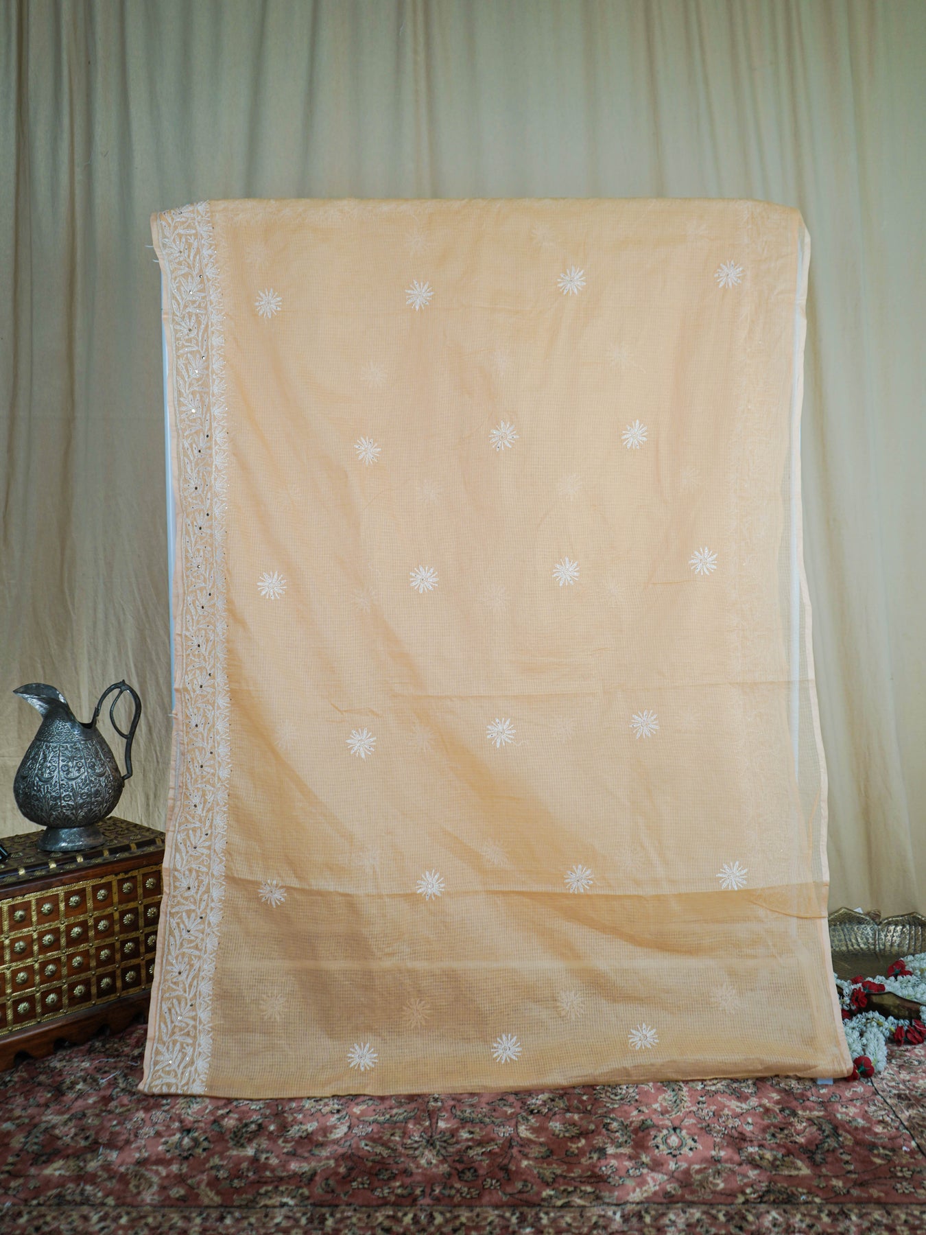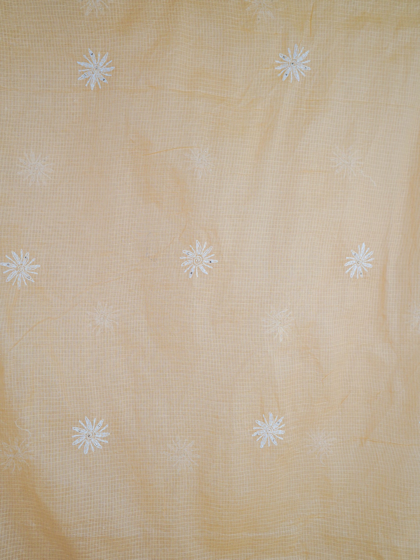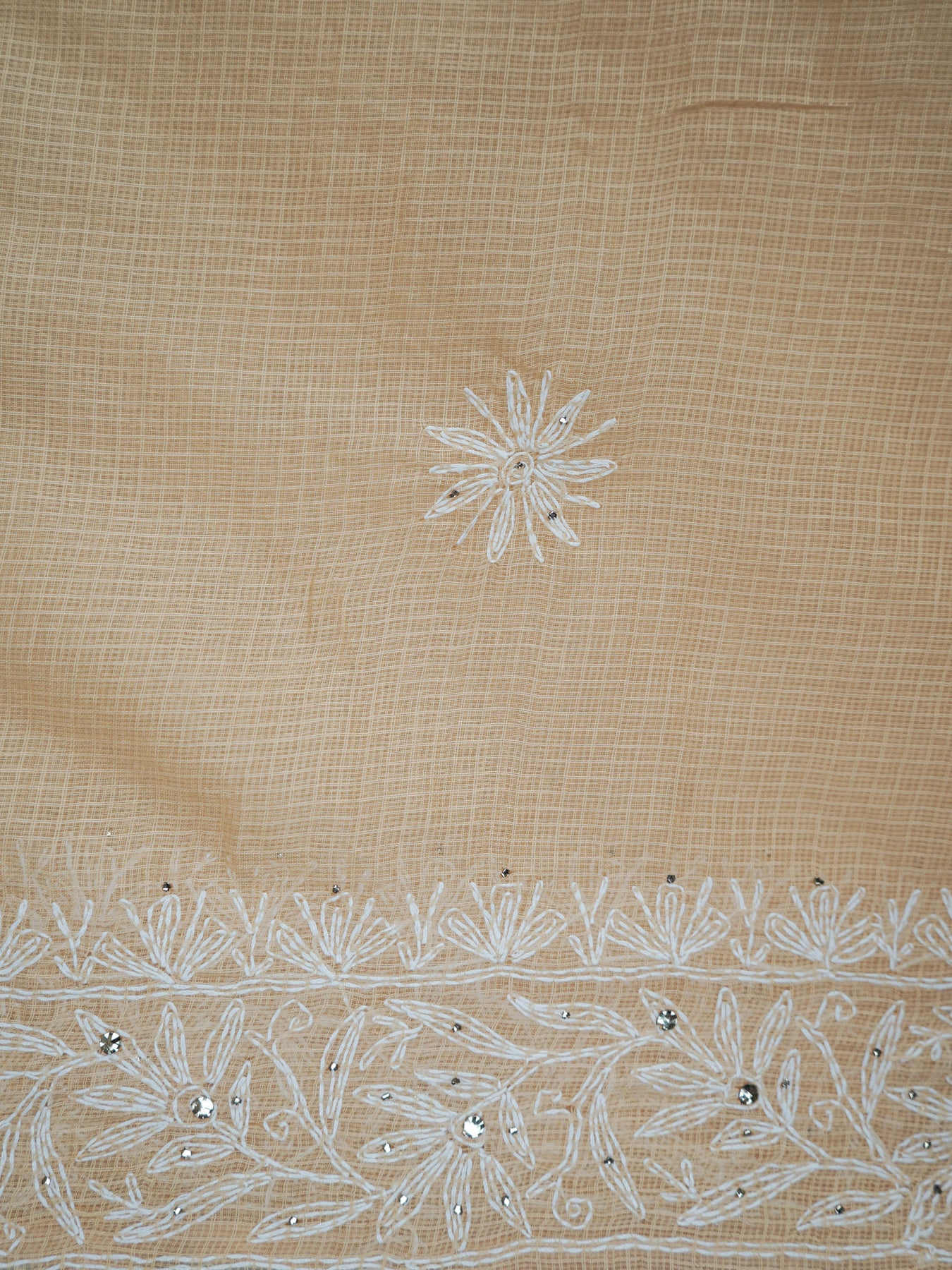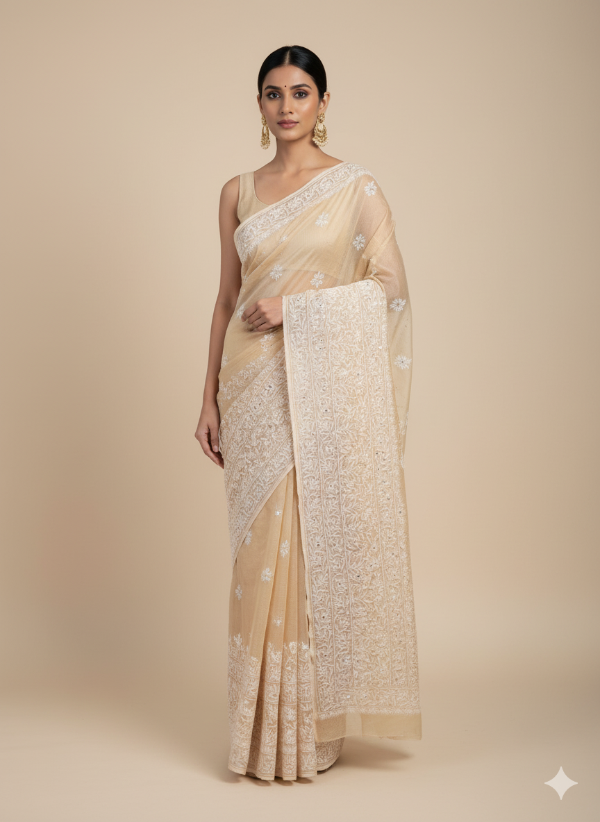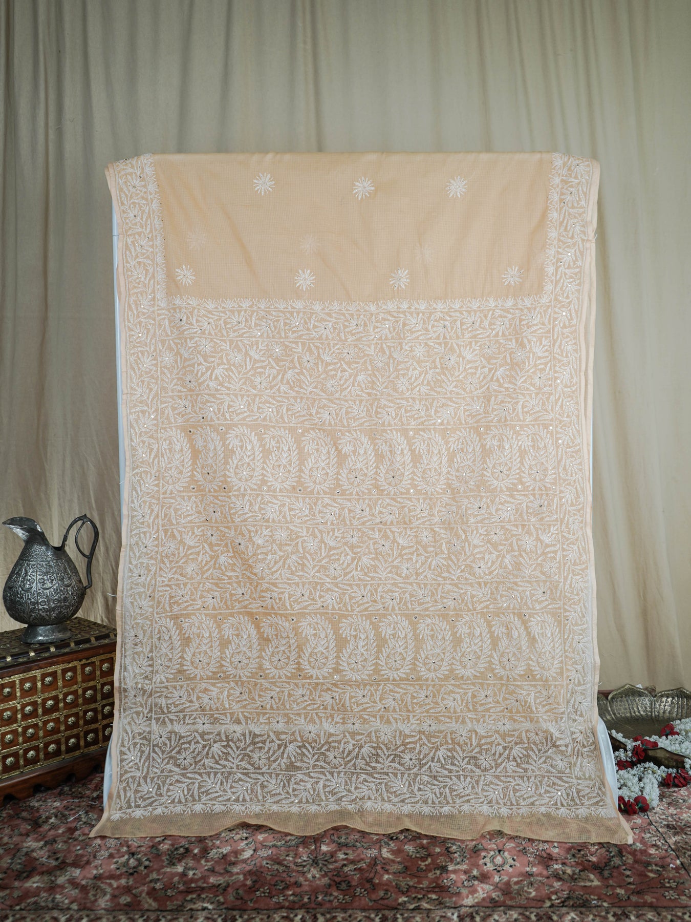 Fabric : Kota Length : 6.5 metres Height : 44 inches Blouse Fabric : 1 metre Thread : Type : Cotton Embroidery :100% hand embroidered Embellishments : Mukaish Occasion : Daily Wear Washing instructions : Dry Clean Storage instructions : Use muslin bags to safeguard your sarees Trivia : Chikankari is an Art of delicate handwork of Lucknow. It is a handcrafted process where the wooden blocks are manually carved in various designs, and the natural stew for printing is prepared, and printed on the cloth. The chikankari craftsmen then use ten ary of the needlecraft embroidery, and perform the needlework artistically. There are 32 stitches of chikankari broadly classified into Raised stitch, Embossed and Flat stitch. Time Period Of Handmade- It took 2 to 3 months for the product to be handcrafted from designing to finishing. Disclaimer : There might be a 10-15% difference in colour due to high screen resolution. Therefore, exchanges due to colour difference is not acceptable Misspelled : Nurkari, Noorkaree, Nurkaari, Noorkary, Noor-Kari