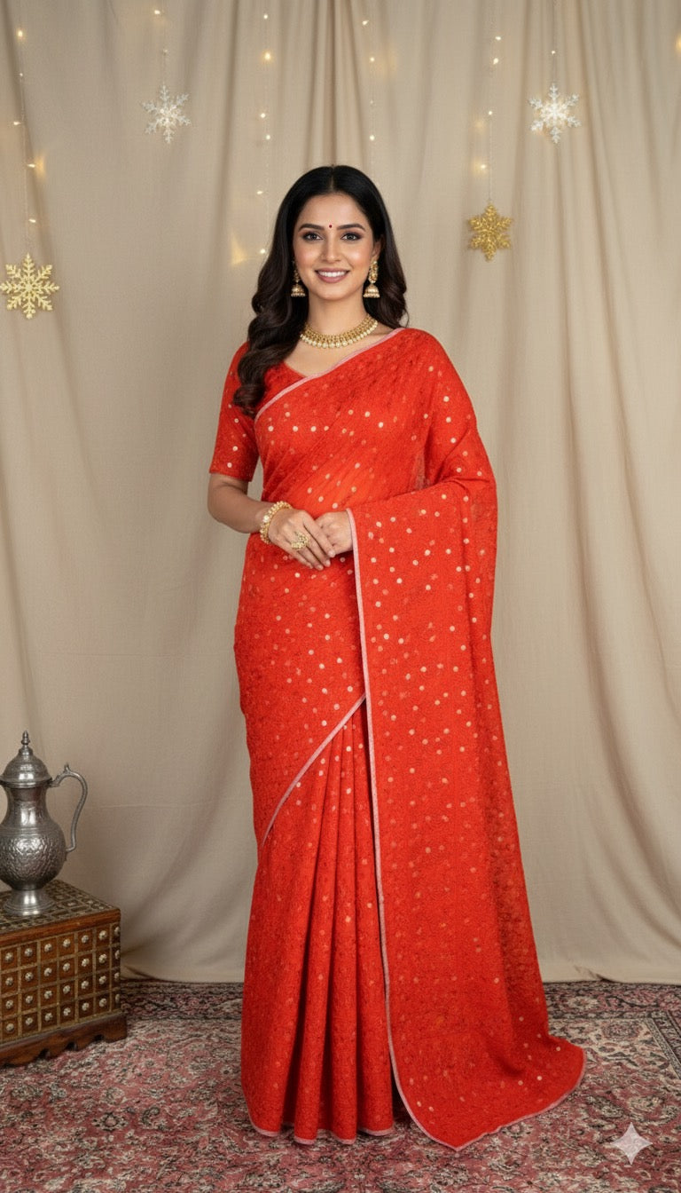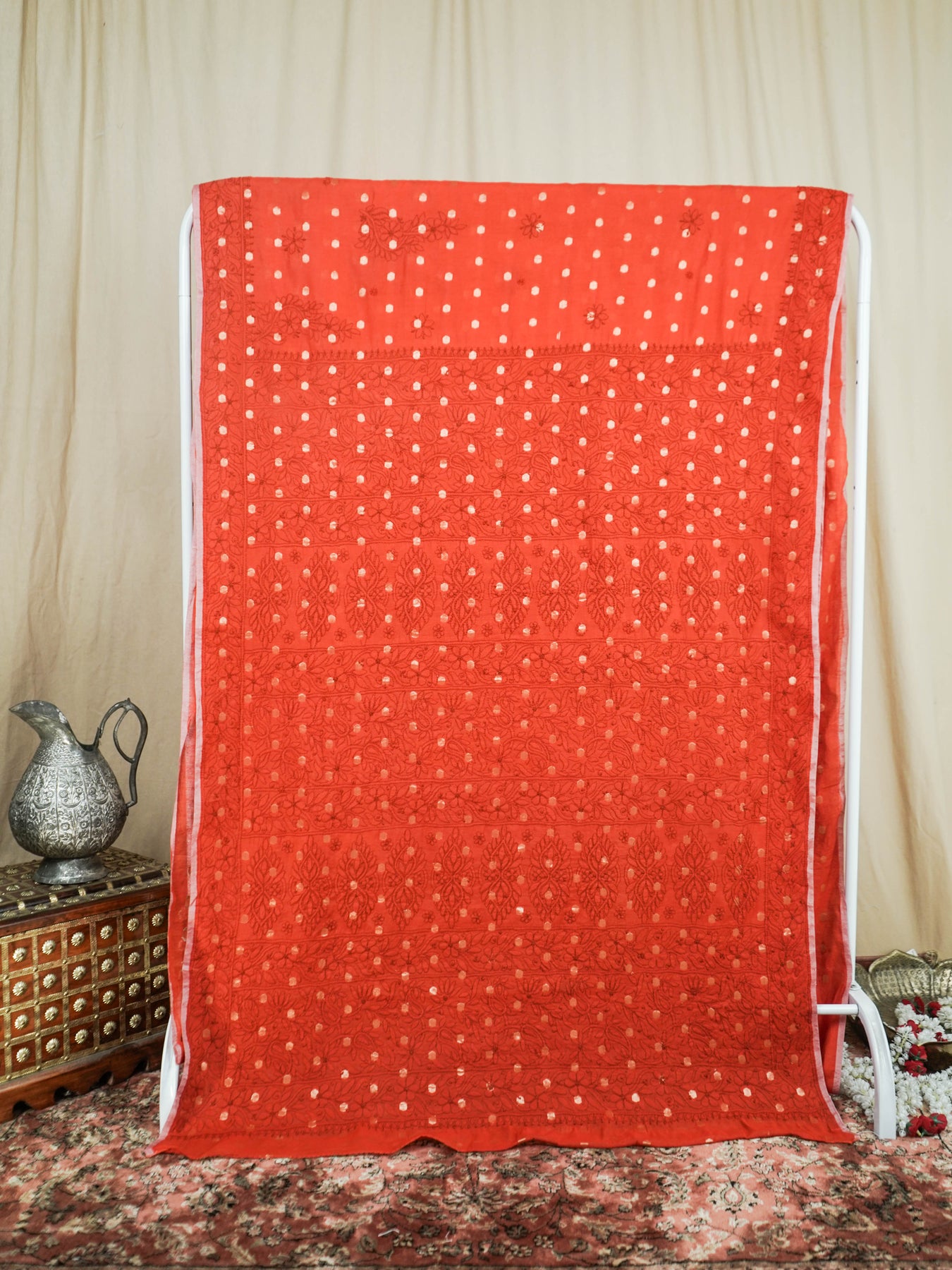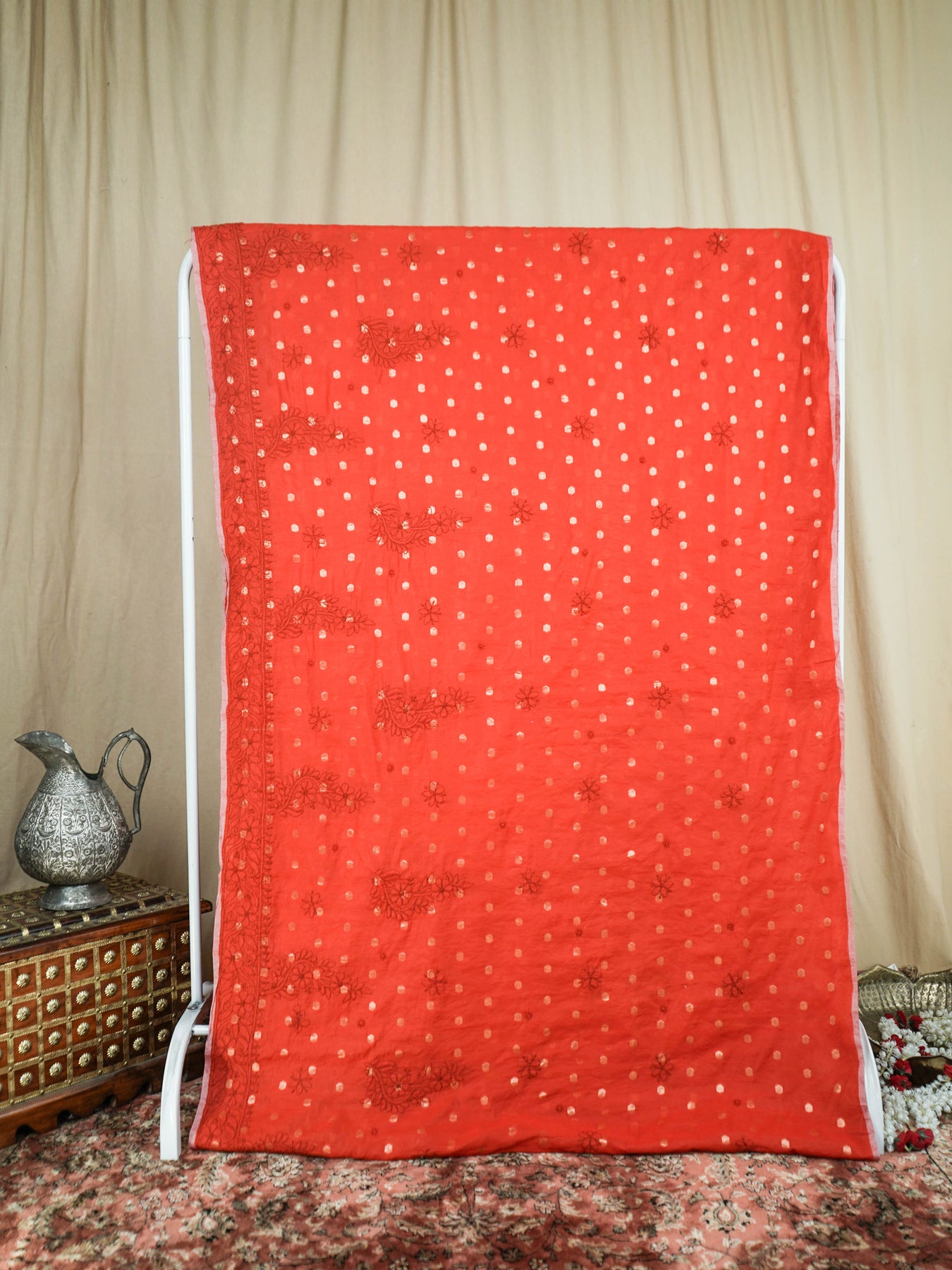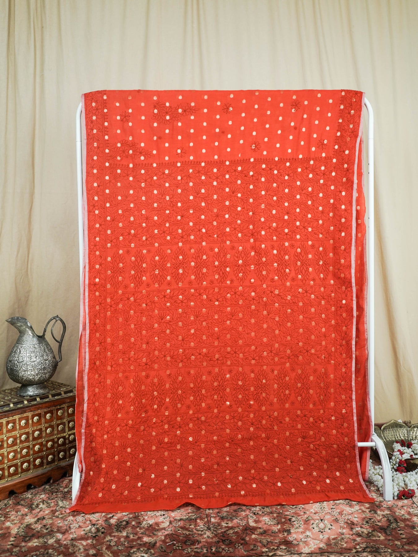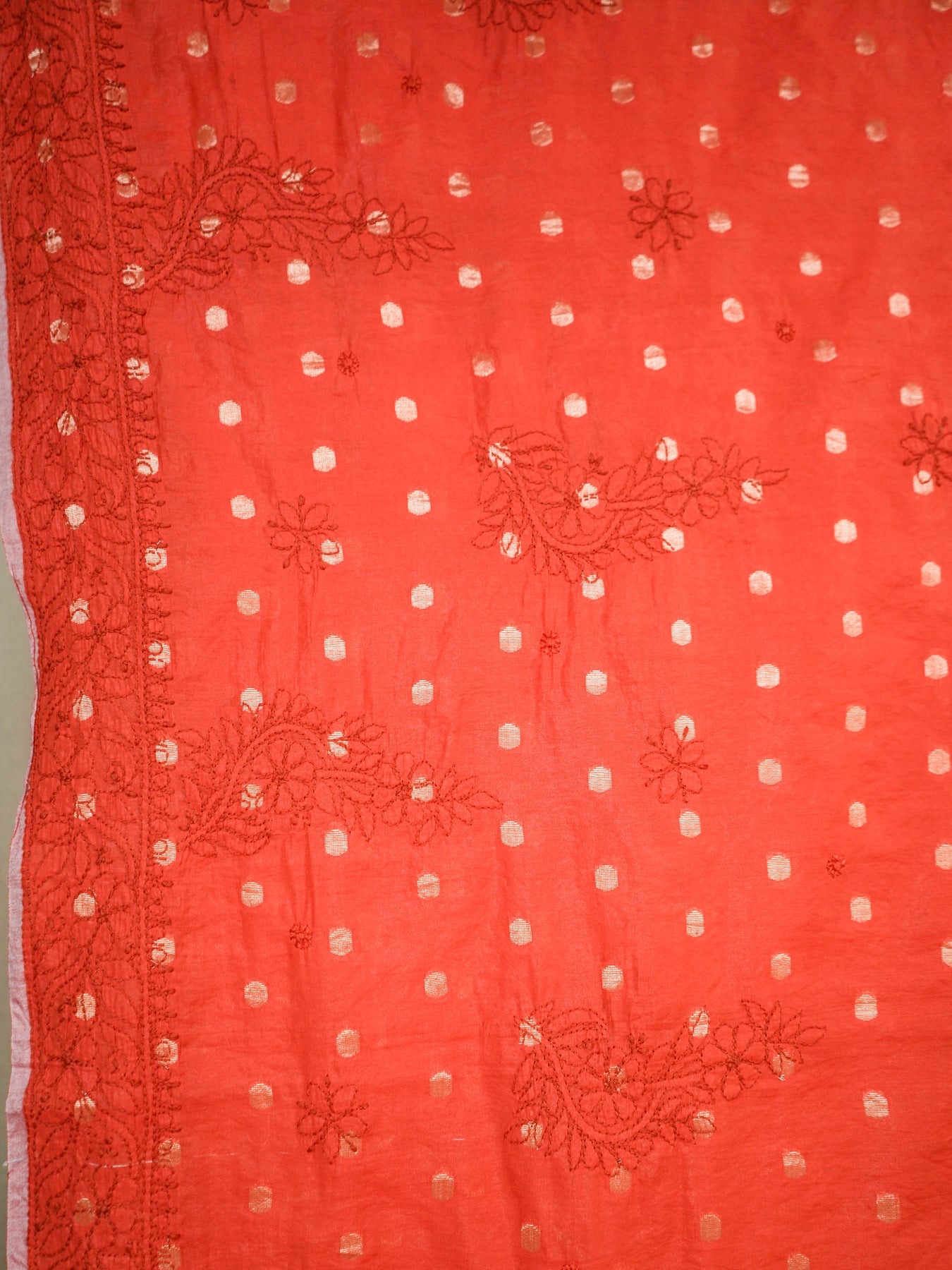 Fabric : Chanderi Length : 6.5 metres Height : 44 inches Blouse Fabric : 1 metre Thread : Type : Cotton Embroidery :100% hand embroidered Embellishments : None Occasion : Daily Wear Washing instructions : Dry Clean Storage instructions : Use muslin bags to safeguard your sarees Trivia : Chikankari is an Art of delicate handwork of Lucknow. It is a handcrafted process where the wooden blocks are manually carved in various designs, and the natural stew for printing is prepared, and printed on the cloth. The chikankari craftsmen then use ten ary of the needlecraft embroidery, and perform the needlework artistically. There are 32 stitches of chikankari broadly classified into Raised stitch, Embossed and Flat stitch. Time Period Of Handmade- It took 2 to 3 months for the product to be handcrafted from designing to finishing. Disclaimer : There might be a 10-15% difference in colour due to high screen resolution. Therefore, exchanges due to colour difference is not acceptable Misspelled : Nurkari, Noorkaree, Nurkaari, Noorkary, Noor-Kari