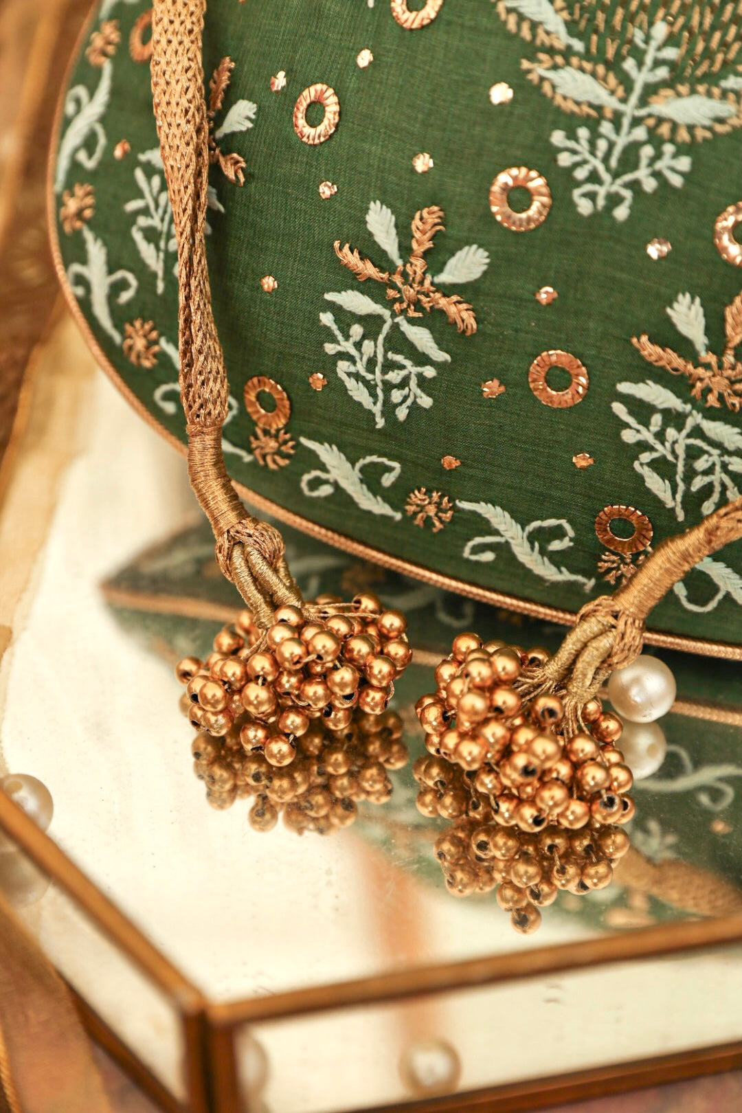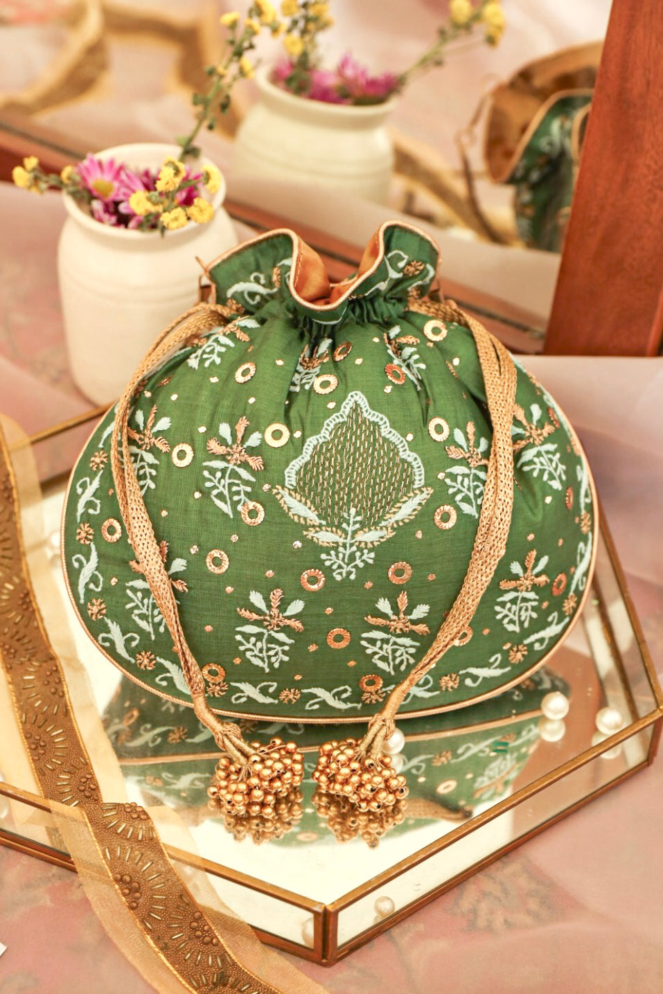 Embrace the exquisiteness of being bold and rediscover who you are! Craft new stories, cherish the love of being timeless! Inner: From the inside, the material used in potli is the silk foam. It gives a superior finish to the batua.